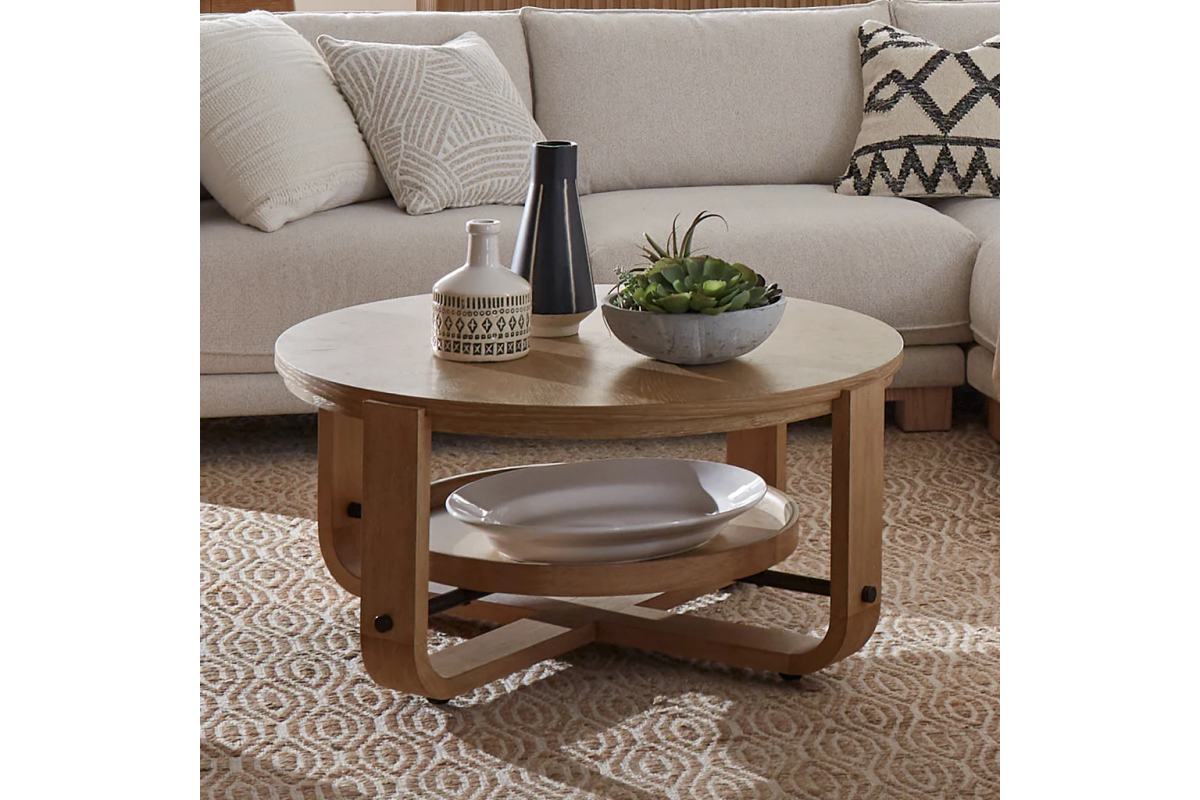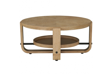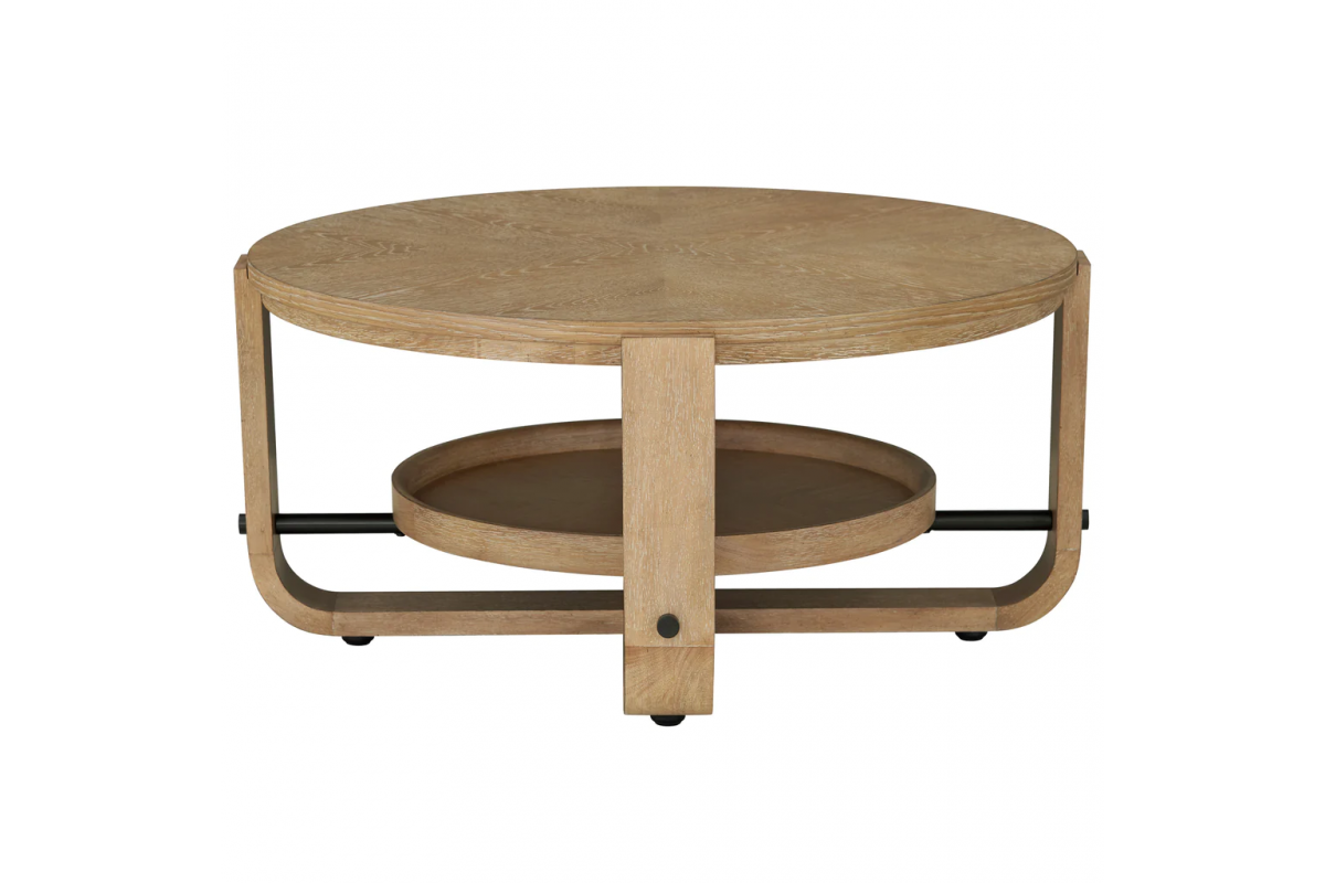 The Escape Round Cocktail Table is created with stunning oak veneers over hardwood solids in a light, natural finish that feels modern yet timeless. Soft, slightly weathered finish with natural patina accentuates the organic beauty of natural oak woodgrains. Features upscale palette of materials that includes elements of natural oak, stone, warm bronze hardware, and textured fabric.