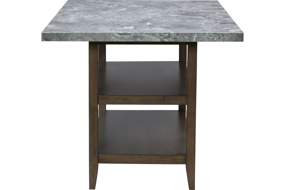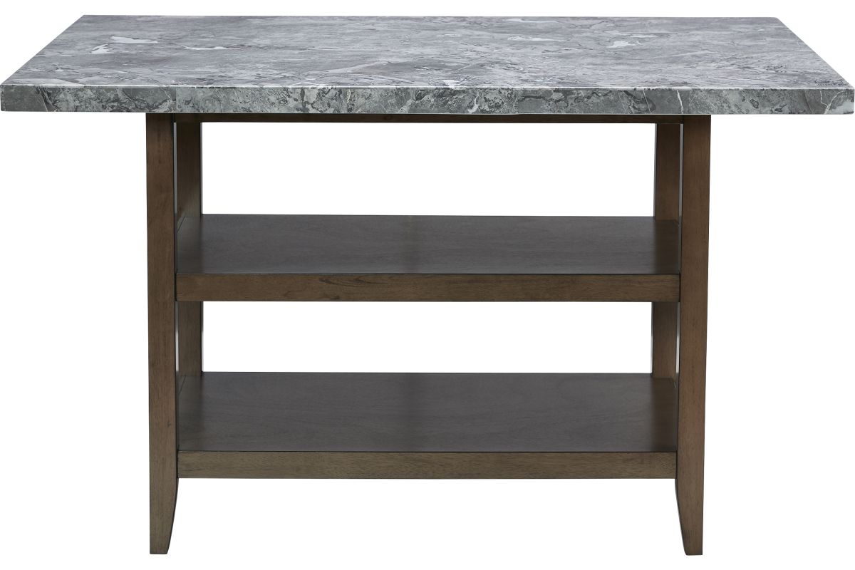 The refined rustic dining design of the Dakota Counter Table elevates the look of everyday and special dining design with its combination of gray marble tops and distressed wood. With plenty of storage in the table base.