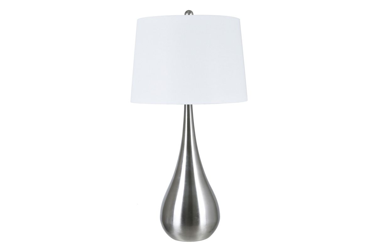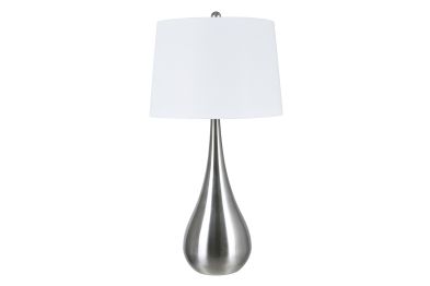 The Silver Ball Lamp features a metal base with a hardback shade. This table lamp is transitional so it can fit with any style in any room!
