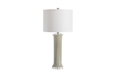 The Piston Table Lamp has a simple, minimalistic design. A cylindrical, ceramic body sits atop a crystal base on the piece. The soft gray finish of the body pairs beautifully with the white drum shade. This transitional lamp has a neutral color scheme that allows it blend with any decor.