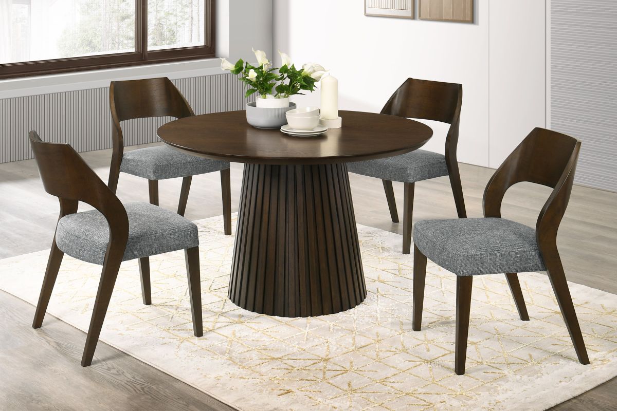 This Revolve Dining set features a modern and stylish design, perfect for a contemporary dining space. The round wooden table has a smooth, circular top with a walnut finish. Its base is a cylindrical structure made of vertical wooden slats, adding a unique textured appearance. The set includes four chairs with a mid-century modern design. They have light grey fabric upholstery on the seat and backrest, which contrasts nicely with the lighter tone of the wooden legs. This combination of natural wood and fabric upholstery offers both style and comfort, making it a great choice for a chic and cozy dining area.
