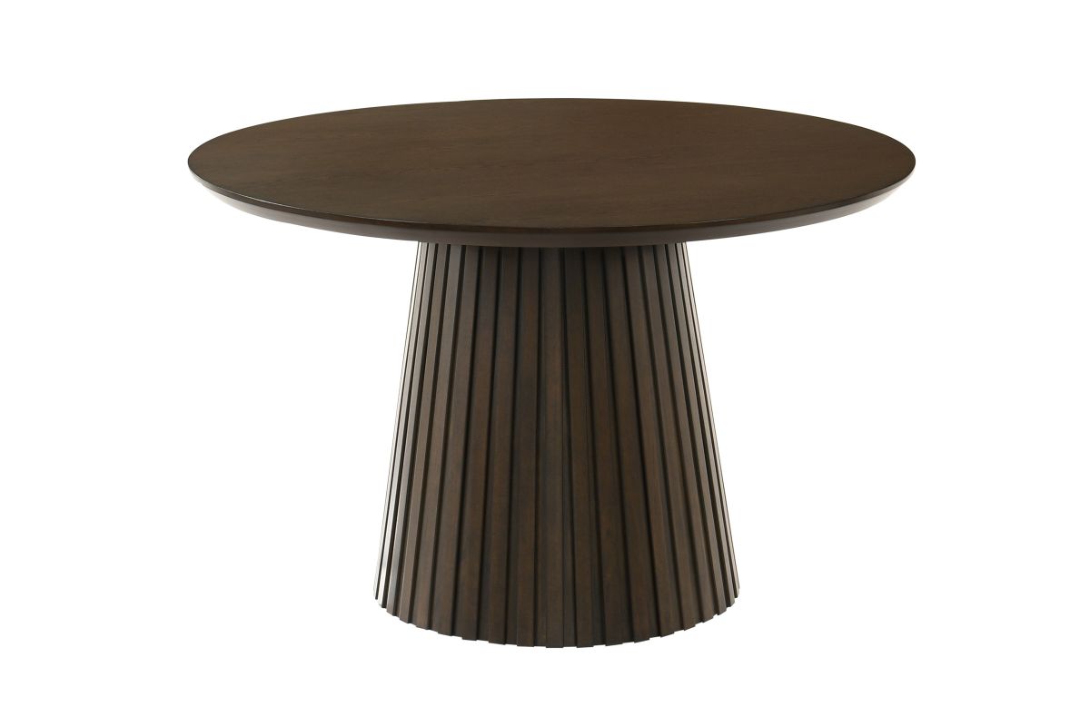 The round wooden table has a smooth, circular top with a natural Walnut finish. Its base is a cylindrical structure made of vertical wooden slats, adding a unique textured appearance.