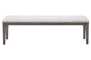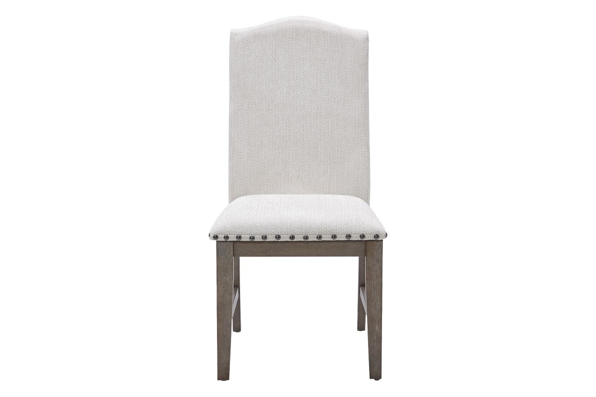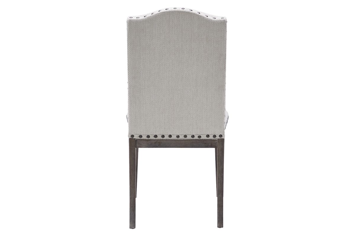 Luring with a weathered gray finish with classic camelback flair, the Noble dining room upholstered chair is sure to make your homestead feel that much more like home. Fresh and neutral polyester upholstery is punctuated with contrasting nailhead trim for added character.