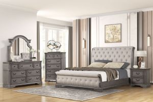 Transform your bedroom into a sanctuary of timeless elegance with the Cascade Bedroom Set, available in both king and queen sizes. This comprehensive set includes the Cascade Queen Bed, a traditional upholstered tufted sleigh bed with a sandblasted grey finish, bringing sophistication to your sleeping space. Complementing the bed is the Cascade Dresser and Mirror, crafted with precision from poplar solids and veneers in the same exquisite finish. The seven-drawer dresser offers ample storage, while the accompanying mirror enhances the visual appeal of your space. Complete the ensemble with the Cascade Nightstand, featuring two drawers, USB functionality, and the same attention to detail as the rest of the set.