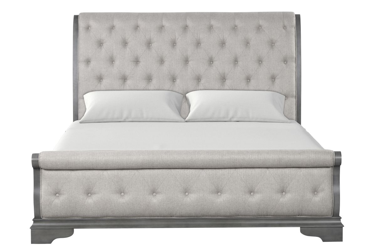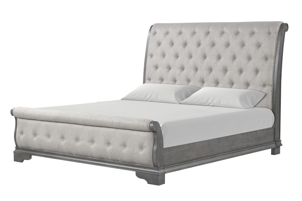 Transform your bedroom into a sanctuary of timeless elegance with the King Cascade Bed, the Cascade King Bed, is a traditional upholstered tufted sleigh bed with a sandblasted grey finish, bringing sophistication to your sleeping space.