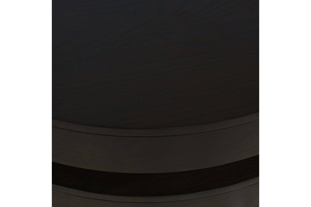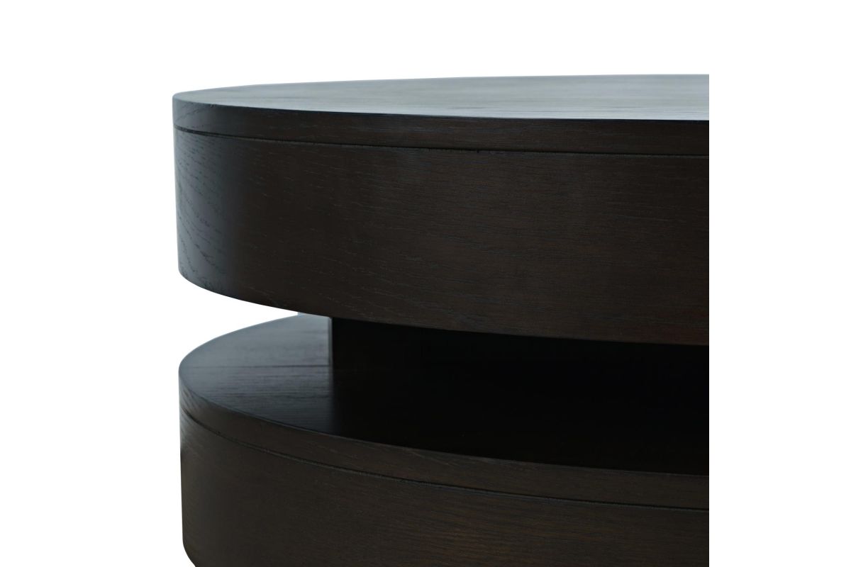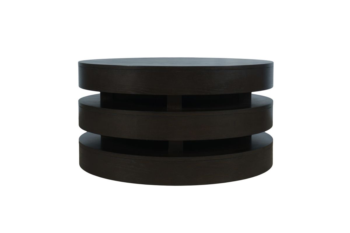 The Brix Round Cocktail Table, featuring catered bases and softened edges, combines mobility with a cohesive design. Its substantial tiered shelves provide ample storage and depth, making it an excellent addition to any living room. With a thoughtful selection of materials and finishes, this cocktail table complements motion upholstery and enhances the style and functionality of any living space.
