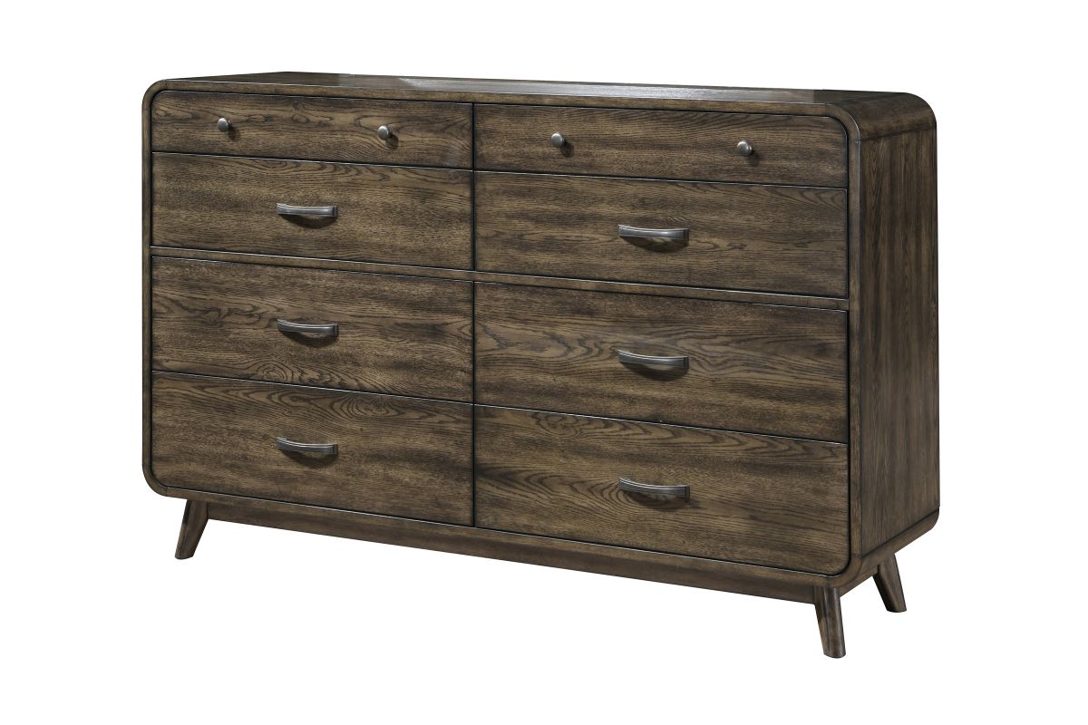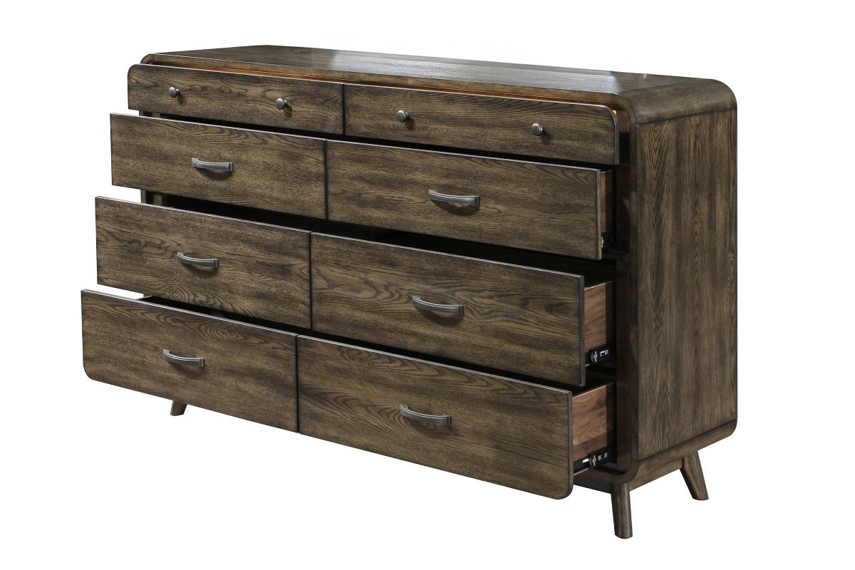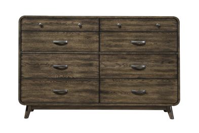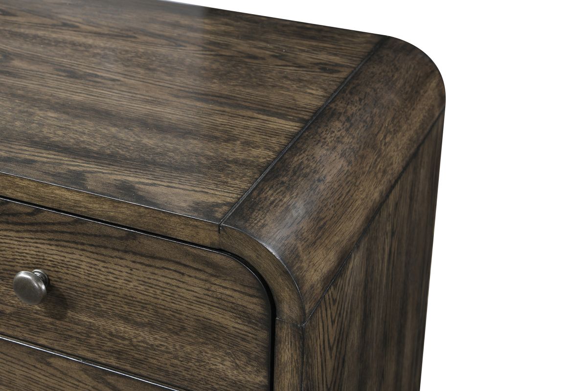 The Rex dresser offers a modern yet timeless appeal with its oak veneer construction and rounded edges. Featuring built-in lighting in the top drawers, it adds a touch of convenience and functionality, perfect for easily accessing items in low-light conditions. The spacious eight-drawer design provides ample storage for clothing and accessories, while the elegant hardware and tapered legs complete the sophisticated aesthetic. Ideal for adding both style and practicality to your bedroom.