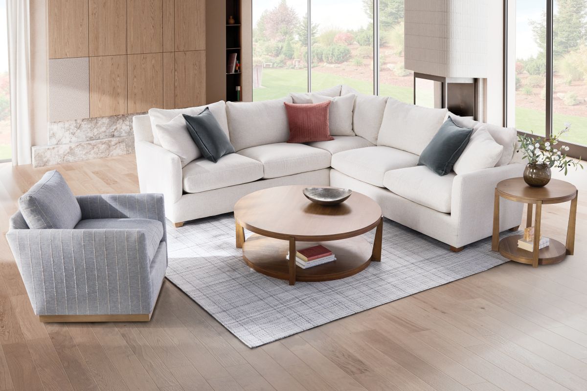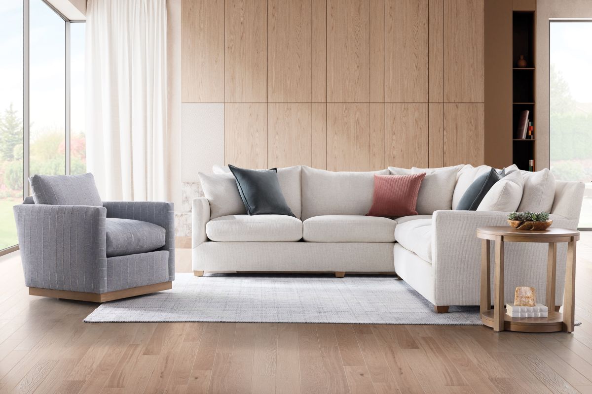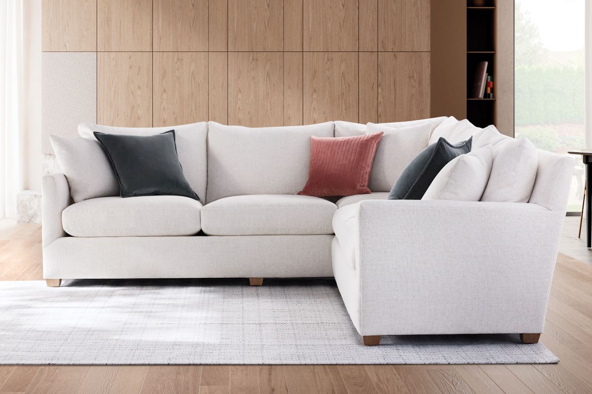 The Lylah series from Robin Bruce collection has a timeless and transitional style. An understated sophistication with a tall back and tailored track arm. The Lilah features a comfortable plush seat with our Cloud feather soft cushions. Comfort supported by our kiln dried hardwood engineered frames and our strong and durable iron ore sinuous coils. Built in America this sectional series is as inviting as it is stylish.