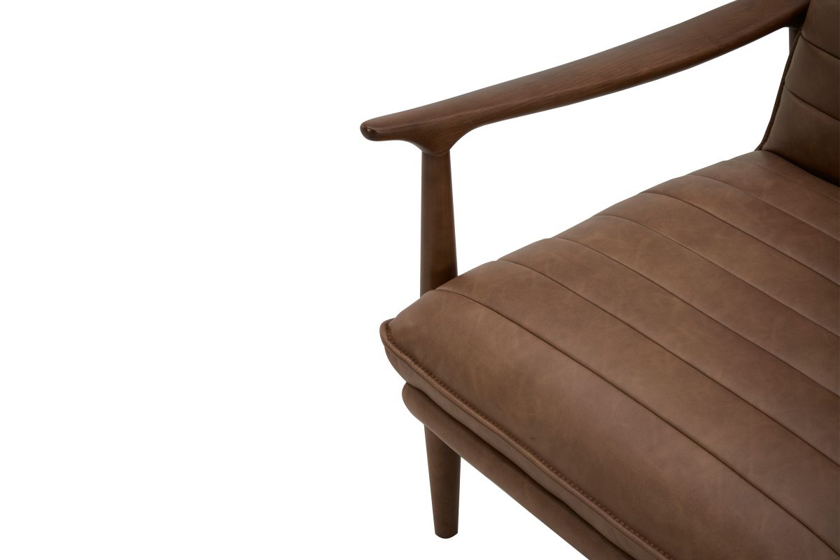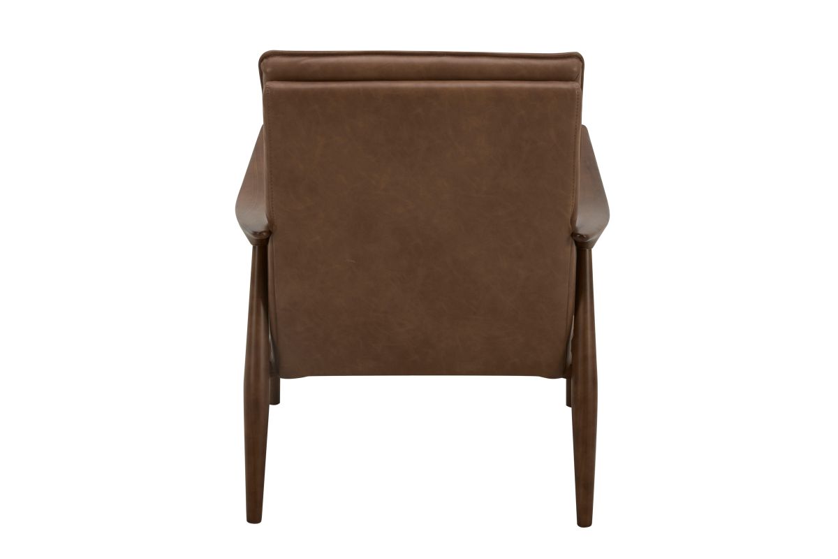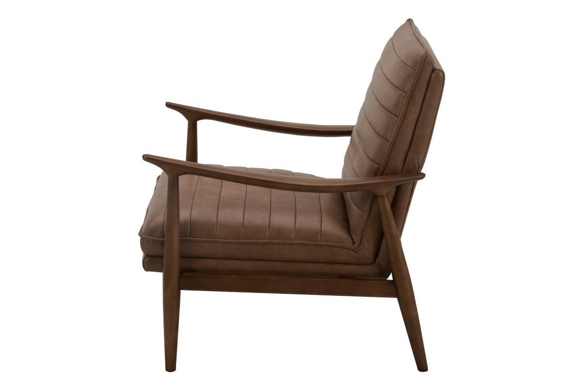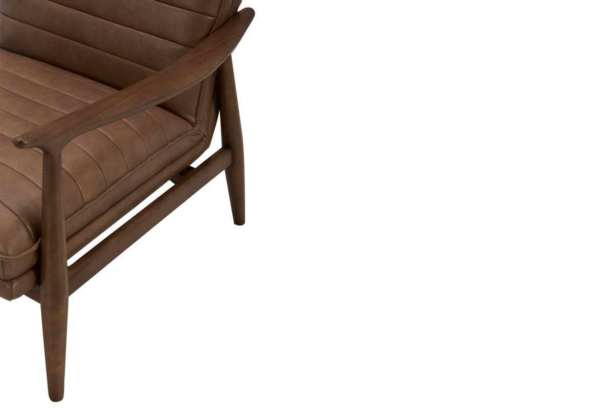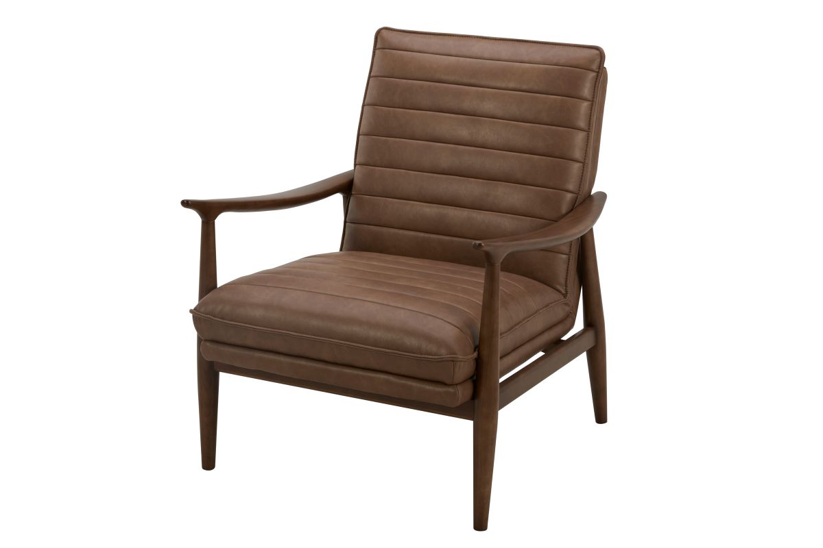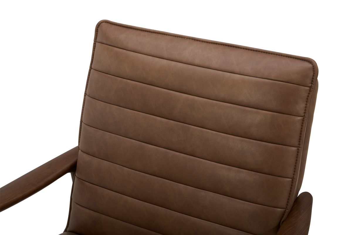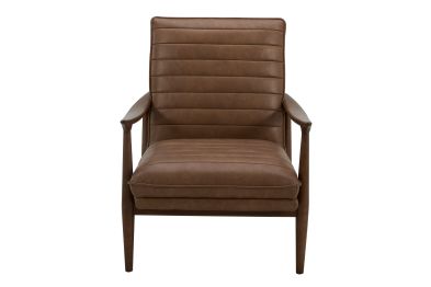 With a striking blend of classic craftsmanship and modern design, the Copley accent chair is the perfect piece for elevating your living space. Draped in a rich brown faux leather and featuring wood legs and arms, this chair brings a touch of natural warmth and timeless appeal. The seat and back are adorned with horizontal channel stitching, creating a refined, textured look that enhances both comfort and style. Whether used as a statement piece or paired with the matching ottoman, it offers both comfort and sophistication, making it a perfect choice for any interior.