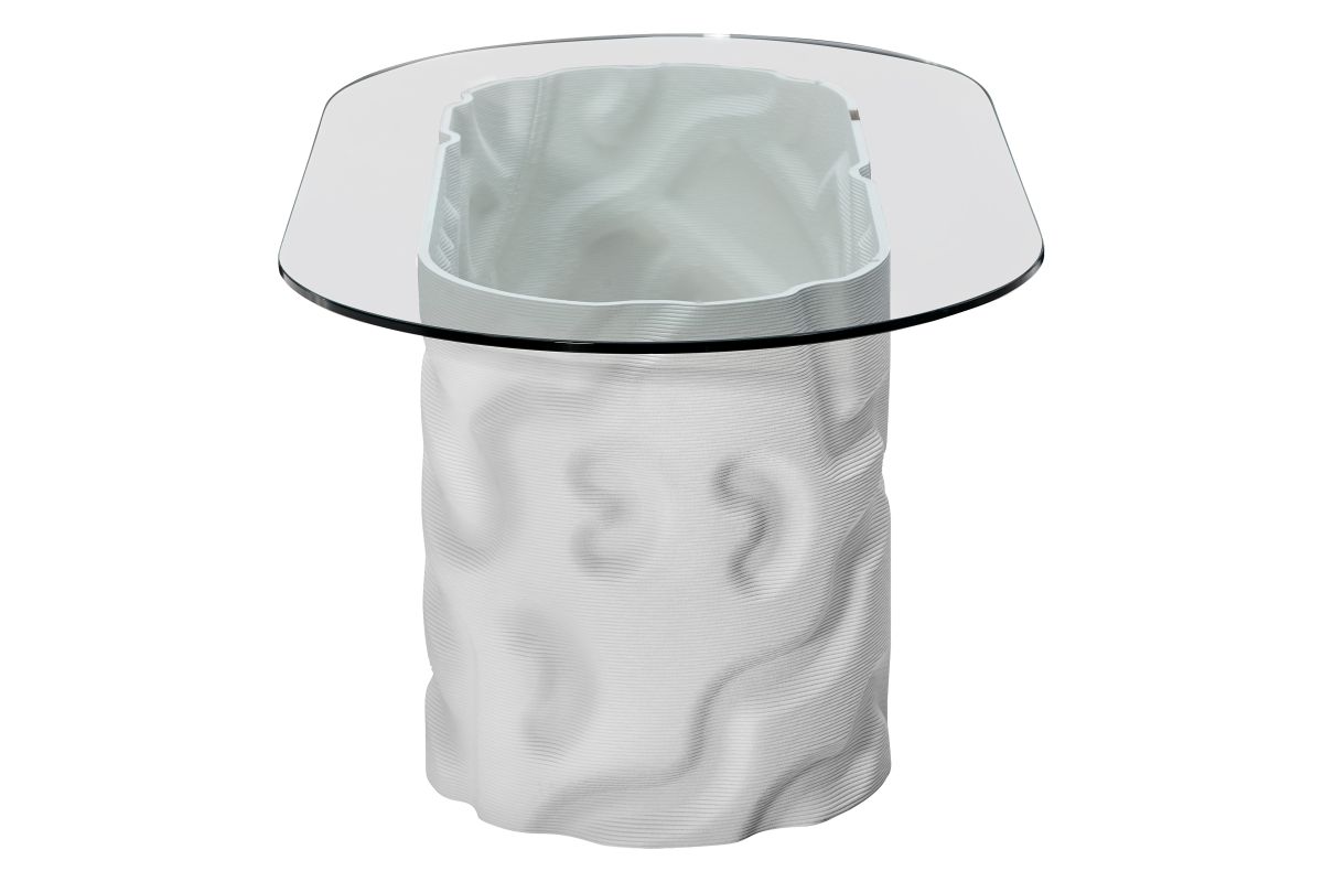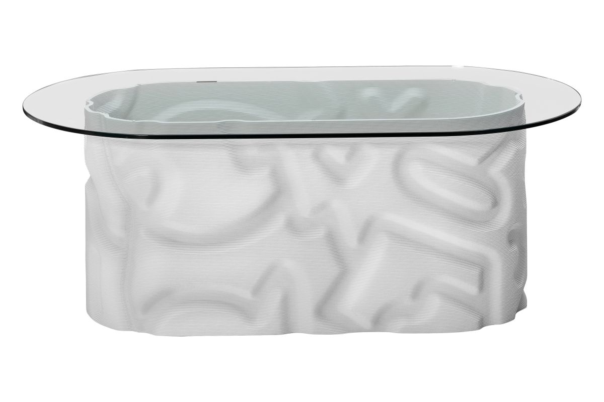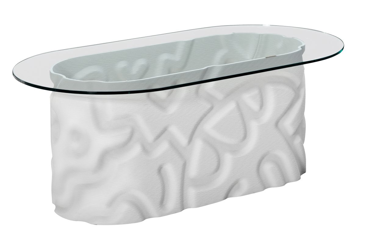 Designed by artist Mike Han and manufactured by 3D printed furniture manufacturer Haddy. This pill-shaped cocktail table features Mike Han's signature paterns printed with recycled plastic. The glass top and hollow base highlights the marriage of mark-making and manufacturing.