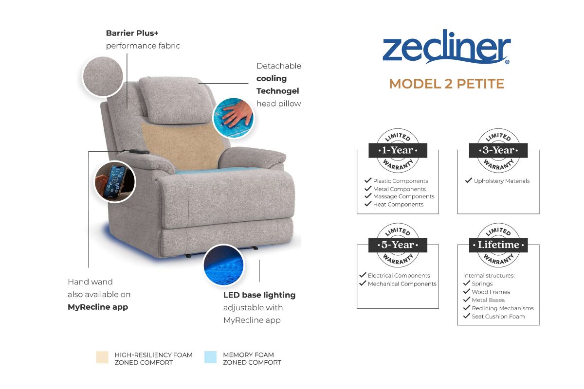 Cozy up in the Zecliner Petite Triple Power Lift Sleep Chair, your perfect family recliner by day, and haven for peaceful sleep by night. The pinnacle of wellness relaxation, this recliner is upholstered in Nanobionic fabric, with bio-based polymers that recycle your natural energy. The memory foam in the backrest, seat, and shoulders, removable cooling head pillow, and waterfall chaise give the Zecliner unparalleled luxury. With Flexsteel’s Blue Steel Spring™ at its core, this recliner has surrounding comfort for relaxation and slumber. Customize your comfort with the hand wand, while Zero Gravity brings weightless comfort and power lift provides smooth and supportive assistance when getting in and out of the chair. This petite version is perfect for users under five and a half feet in height. Achieve blissful relaxation by day and a rejuvenating sleep by night with the Zecliner.