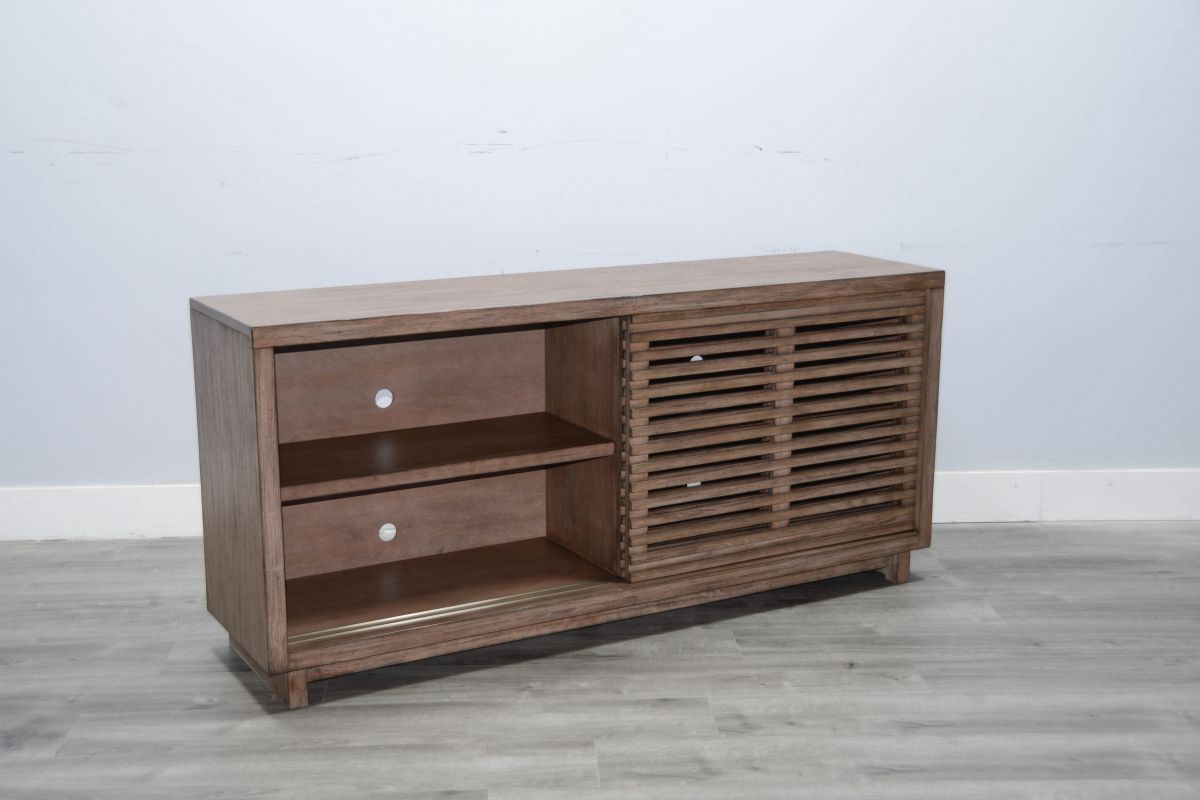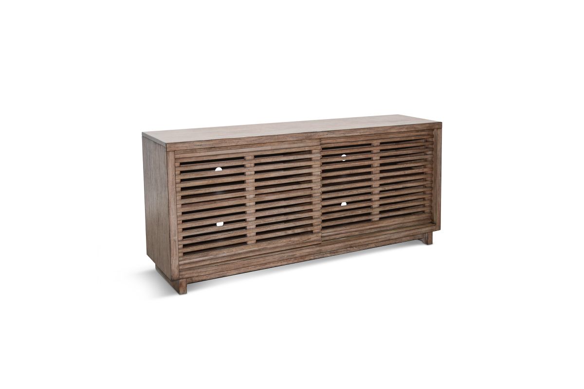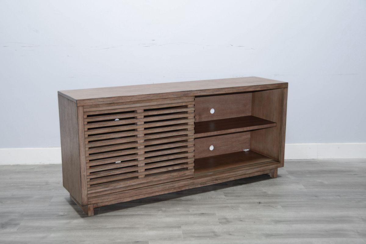 Discover our sleek media console, expertly crafted from mahogany solids and veneers. Designed for modern living,it features cord management, adjustable shelves, and two sliding doors with wooden slot panels. The Buckskin finish adds a touch of sophistication to your entertainment space.