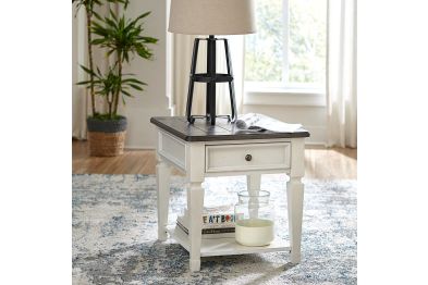 Enhance your space with the Allyson Park drawer end table. Crafted of pine solids and veneers with cathedral white oak tops, this piece features a wire brushed white finish with a planked charcoal top, one wood framed full extension drawer accented with antique pewter knob hardware, a bottom shelf for additional storage, and is anchored by square tapered legs. This classic end table would make a gorgeous addition to your casual styled home.