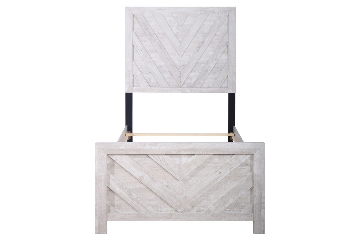 Introducing the Shevlin Bedroom Set, a comprehensive ensemble featuring a stylish bed, 6-drawer dresser, mirror, 5-drawer chest, and 2-drawer nightstand. Crafted with durable manufactured wood and finished with Eco-Friendly laminated surfaces, this set promises strength and stability. The light, airy Driftwood finish creates a relaxing atmosphere, perfect for unwinding after a busy day. Distinctive chevron pattern wood trim adorns the headboard and footboard, accentuated by dark iron finish drawer pulls, adding a touch of sophistication. Versatile in style, this transitional design seamlessly blends with various motifs, from coastal to contemporary, farmhouse to urban rustic. Plus, with time-tested drawer construction featuring English dovetail joinery and smooth metal center drawer glides, functionality meets elegance in this remarkable bedroom set.