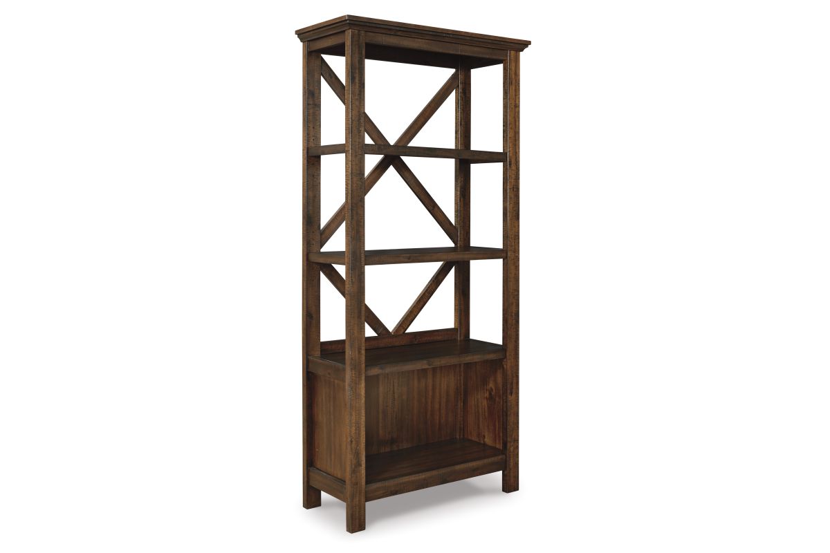 Leaning toward a casually cool look with a touch of rustic industrial flair? This brilliant bookcase takes a fresh stance on style. Clean-lined profile with crossbuck back is complete with saw marks for distinctive character.