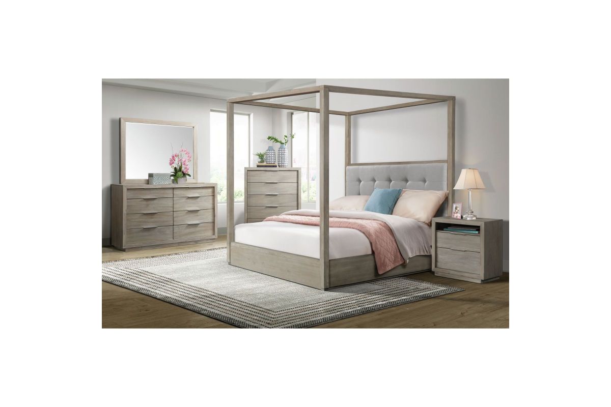 The Bella Canopy Bed is the ideal mellow getaway by adding this transitional canopy bed to your space. A simple silhouette and crisp grey finish craft modern appeal and ensure your room exudes a calming essence to help you relax at the end of a long day, while a tufted headboard and slim canopy charm a bit of traditional detail into the overall design. Whether you're looking to elevate your space to one of contemporary sophistication or take on a minimalistic aesthetic, this bed is guaranteed to meet your needs.