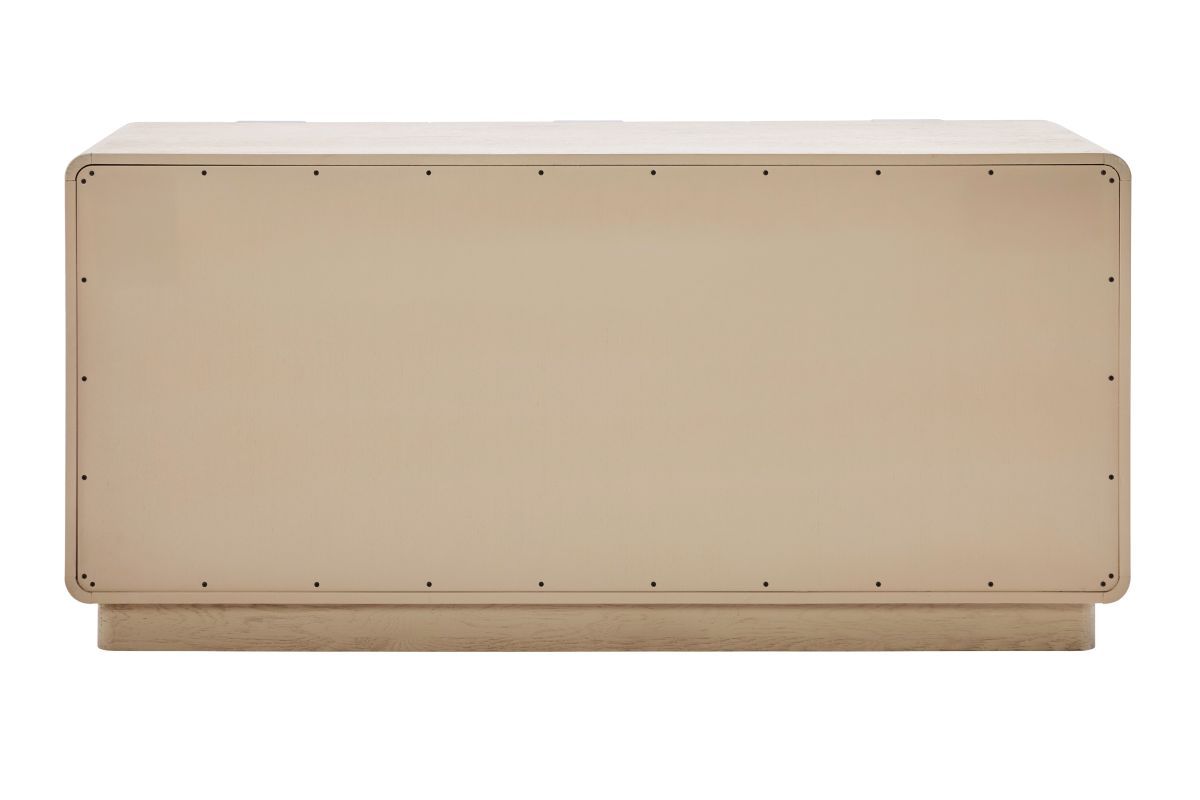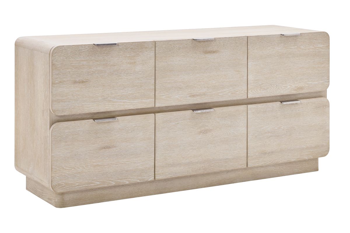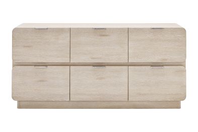 Elemental design gets a refined and modern update for the Antibes dresser. Softened corners and shapely drawer fronts have an organic simplicity with the rustic Roz finish. The case is supported with a plinth base and features six pull-to-open drawers with cast aluminum pulls.