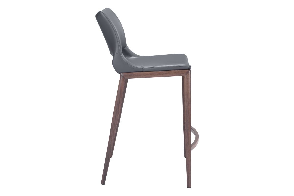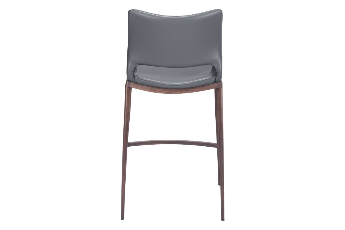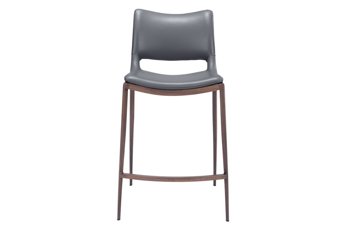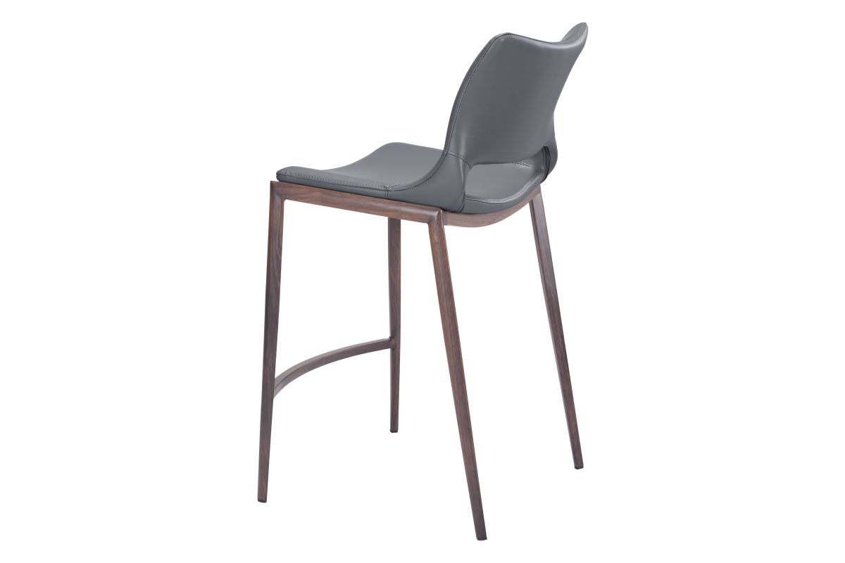 Built for comfort, this ergonomic counter stool is the perfect solution for your home or office space. A Faux Wood frame plays a supporting role while the built-in curved footrest keeps you firmly planted. Gray faux leather seat deck is sleek and modern, making this barstool the perfect complement to any room setting.