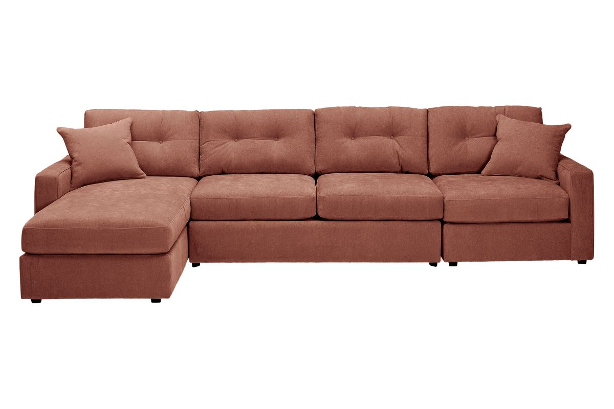Discover the limitless possibilities of the ModularOne sectional, thoughtfully designed with comfort and flexibility in mind. This customizable seating solution features individual pieces that can be reconfigured to the shape you need. Game days, movie nights, sleepovers, and everyday relaxation are all better when the seating arrangement you want is always right at your fingertips. This soft, cantaloupe chenille includes Repreve yarn, made with recycled plastic bottles. The dual seating area has welted track arms, top-stitched seat cushions and button-tufted back cushions for an elegant silhouette. The armless loveseat component features a full size 4" innerspring mattress, perfect for over night guests and easily hidden away for gameday.