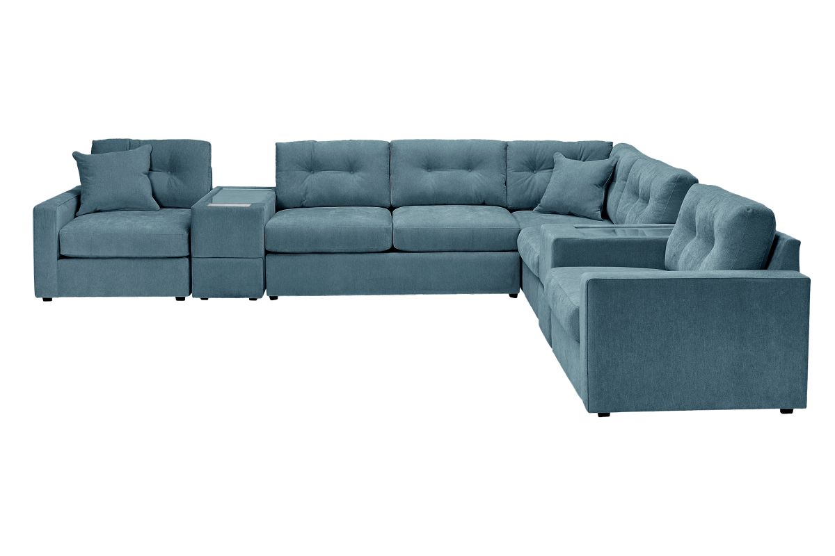 Discover the limitless possibilities of the ModularOne sectional, thoughtfully designed with comfort and flexibility in mind. This customizable seating solution features individual pieces that can be reconfigured to the shape you need. Game days, movie nights, sleepovers, and everyday relaxation are all better when the seating arrangement you want is always right at your fingertips. This soft, teal chenille includes Repreve yarn, made with recycled plastic bottles. The dual seating area has welted track arms, top-stitched seat cushions and button-tufted back cushions for an elegant silhouette. The armless loveseat component features a full size 4" innerspring mattress, perfect for over night guests and easily hidden away for gameday. Consoles provide hidden storage, USB charging ports, wireless charging, Bluetooth speakers, and double as side tables with sleek acrylic tops.