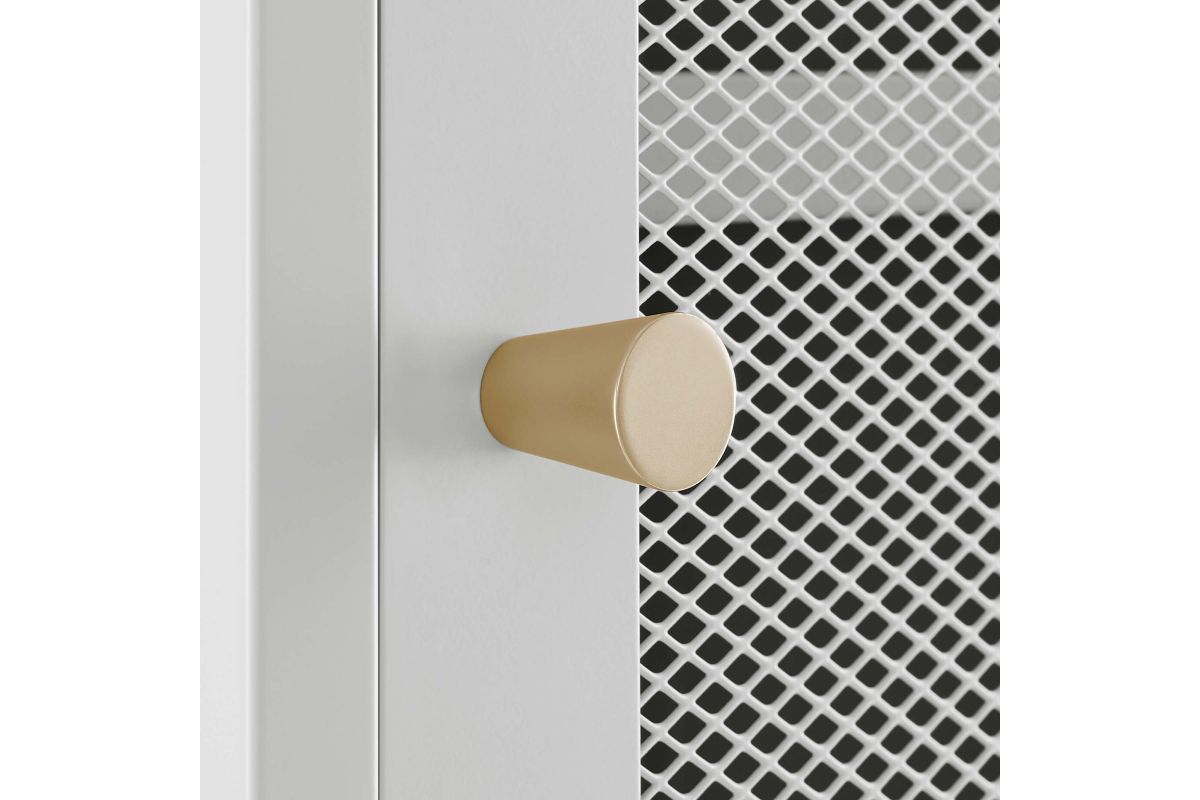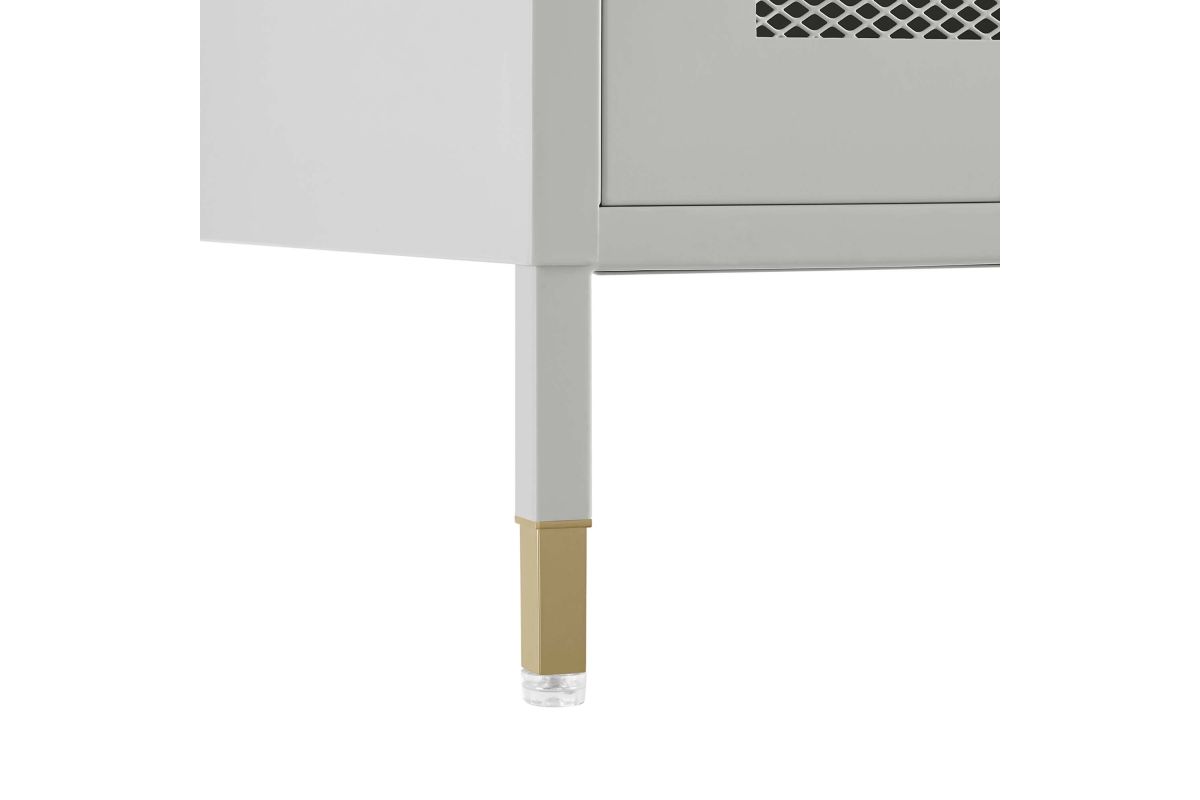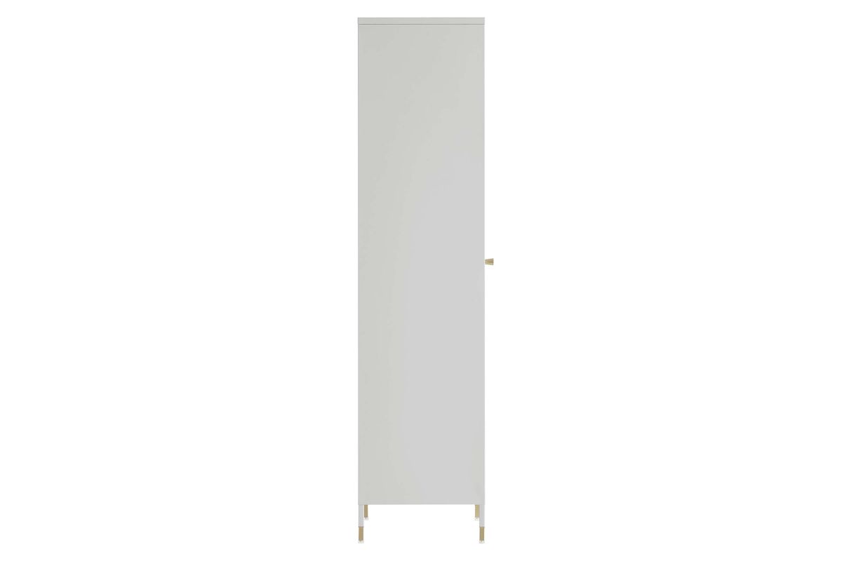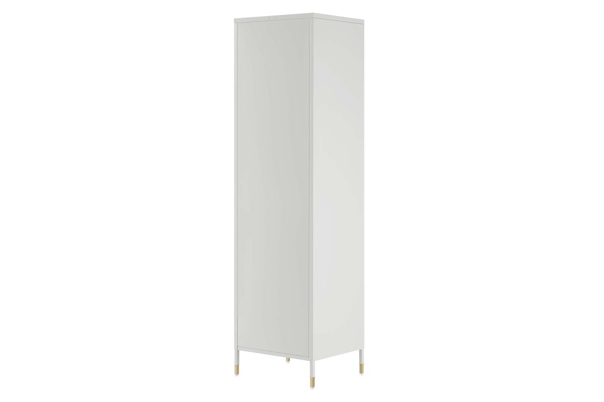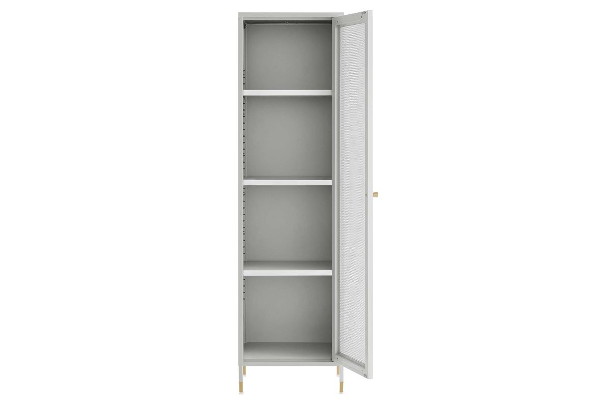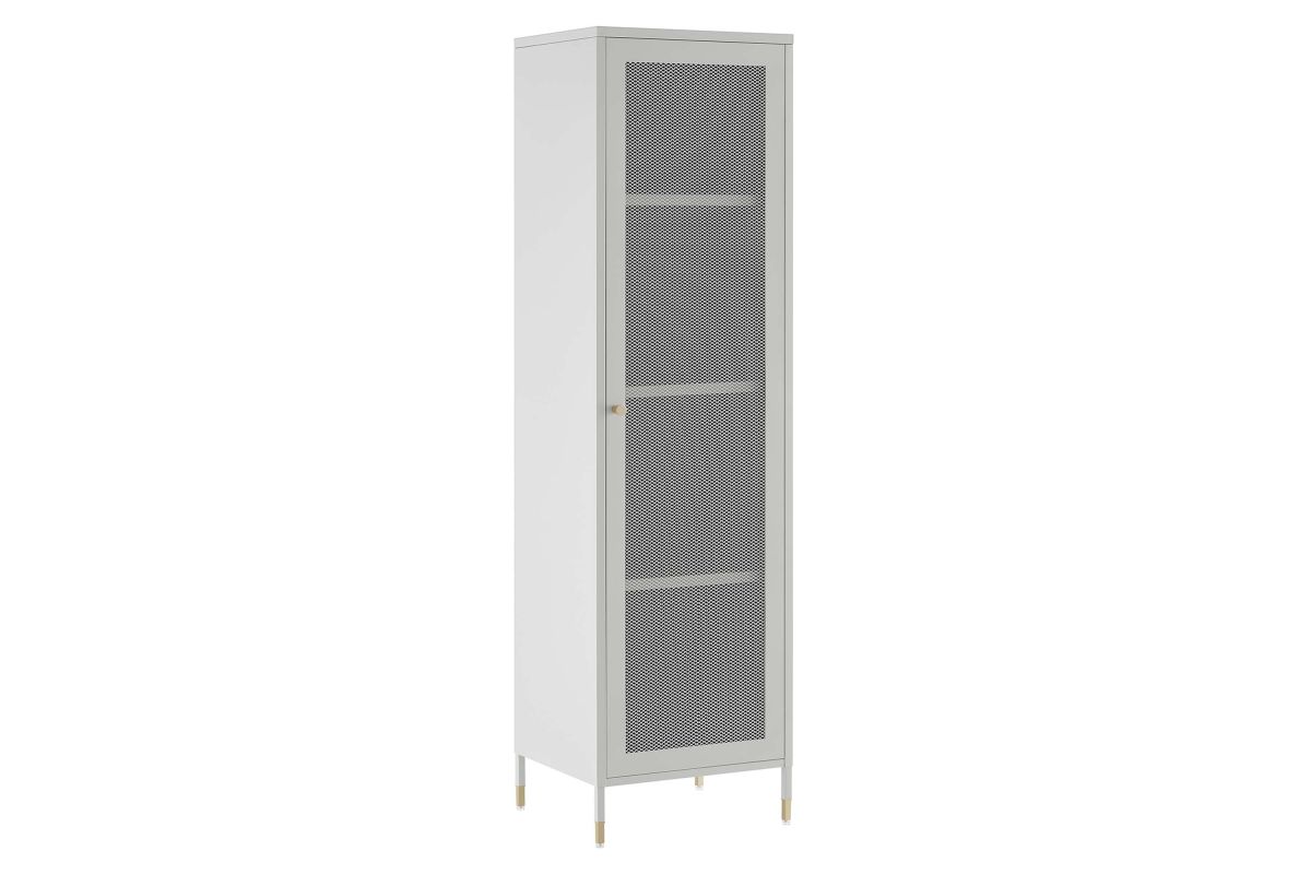 Elevate your home decor and storage needs with the Covelo Tall Storage Cabinet. Crafted with durable cold-rolled steel plates with powder-coated paint, this storage cabinet is built to last. The copper-plated zinc alloy handle pull and a mesh-front door add a touch of elegance and modern interest to its surroundings. On the inside of this accent cabinet, you'll find three spacious height-adjustable shelves behind a magnet close door. Anti-tipping hardware is included for added safety. The adjustable foot pads protect your flooring from scratches and damage while ensuring stability. A versatile addition to a home office or other living spaces, this tall storage cabinet offers stylish and functional storage space to suit your needs. Assembly required. Set Includes: One - Covelo Tall Storage Cabinet