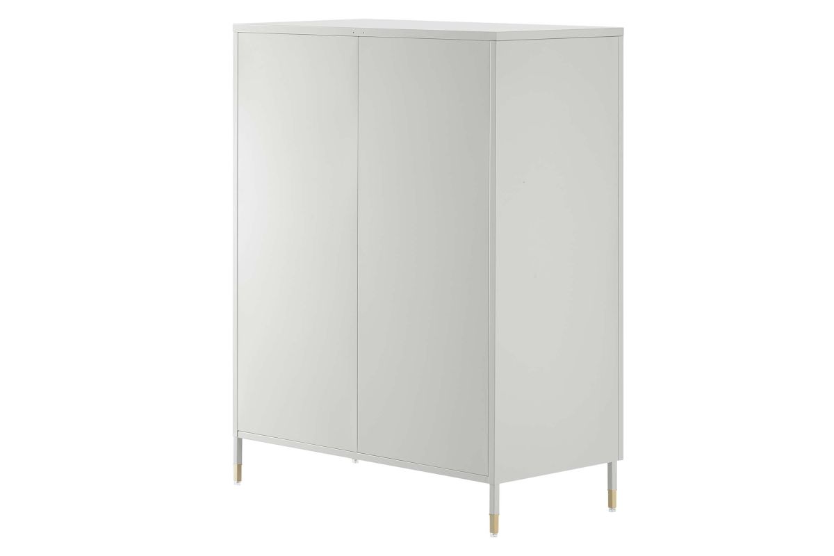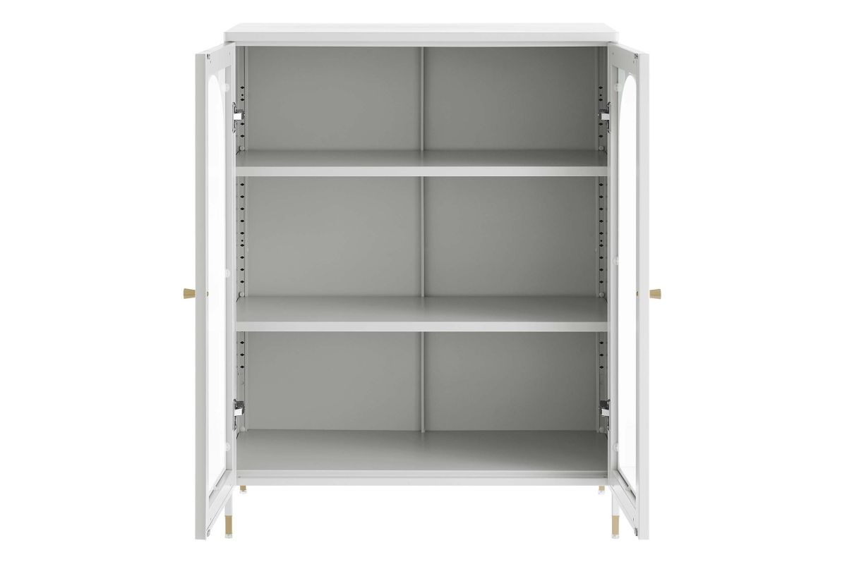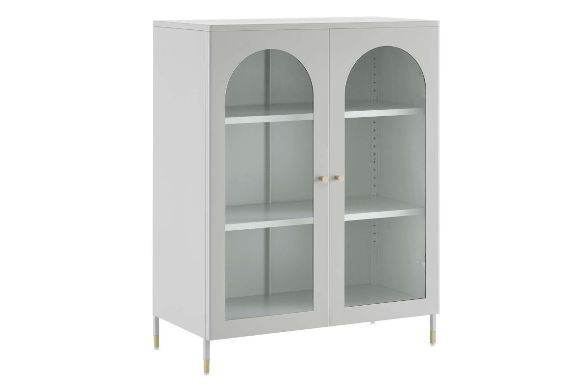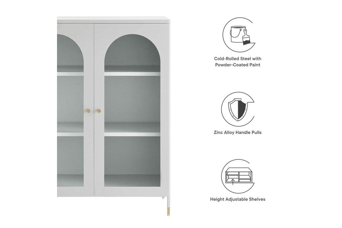 A versatile and stylish soultion, the Archway Accent Cabinet offers room for both storage and display. Crafted from powder-coated cold-rolled steel plates, this storage cabinet offers durability and modern appeal. The cabinet features two height-adjustable shelves, glass-front doors with arched details, and copper-plated zinc alloy handle pulls. With a multi-functional design, this accent storage cabinet is versatile in usage making it perfect for a variety of areas such as the dining room, living room, home office, entryway, and kitchen. This accent cabinet is ideal for organizing serving pieces, linens, toiletries, books, collectibles, home decor, and more. Equipped with adjustable foot pads for floor protection and stability, this stylish cabinet includes anti-tipping hardware for enhanced safety. Upgrade your storage options with Archway. Assembly required. Set Includes: One - Archway Accent Cabinet