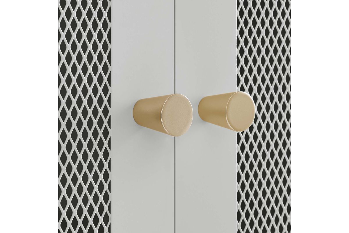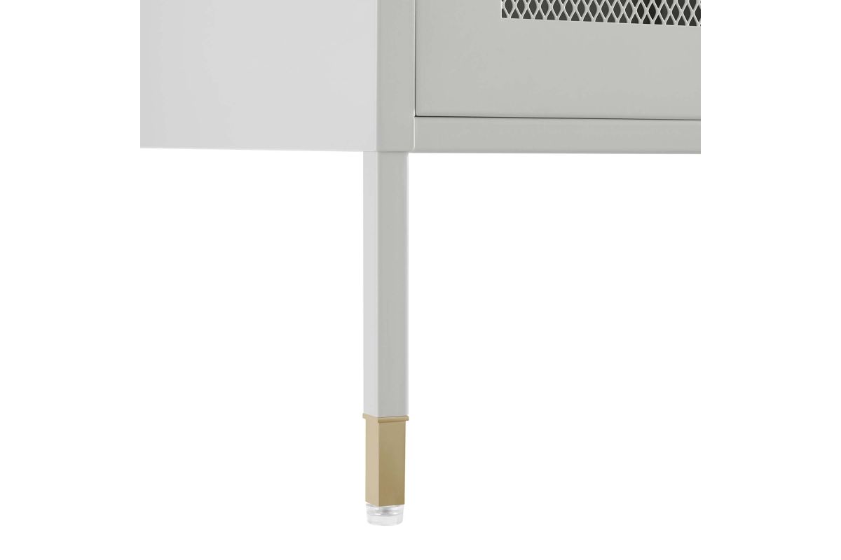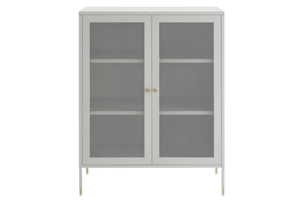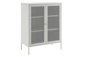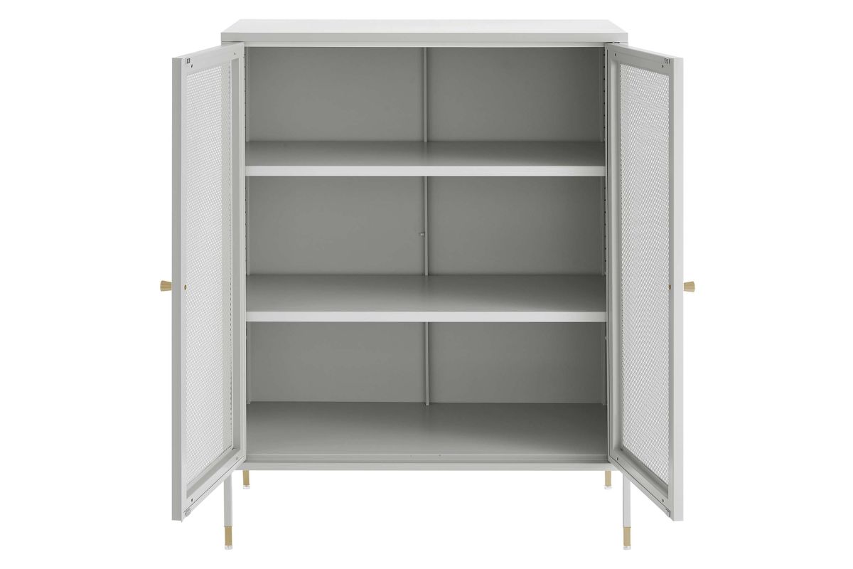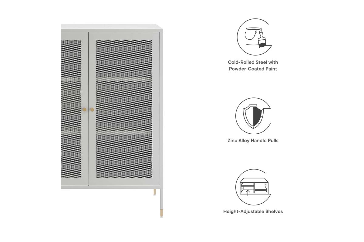 Elevate your home decor and storage needs with the Covelo Accent Storage Cabinet. Crafted with durable cold-rolled steel plates with powder-coated paint, this storage cabinet is built to last. The copper-plated zinc alloy handle pulls and mesh-front doors add a touch of elegance and modern interest to its surroundings. On the inside of this accent cabinet, you'll find two spacious height-adjustable shelves behind magnet close doors. Anti-tipping hardware is included for added safety. The adjustable foot pads protect your flooring from scratches and damage while ensuring stability. Perfect for entryways, living rooms, kitchens, home offices, or dining rooms, our accent cabinet offers a stylish and functional storage solution to suit your needs. Assembly required. Set Includes: One - Covelo 32" Accent Cabinet