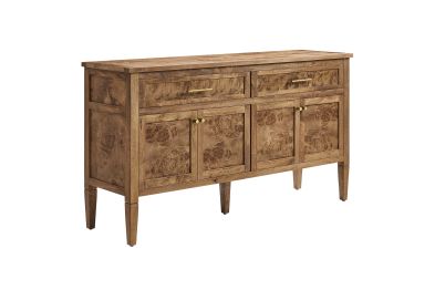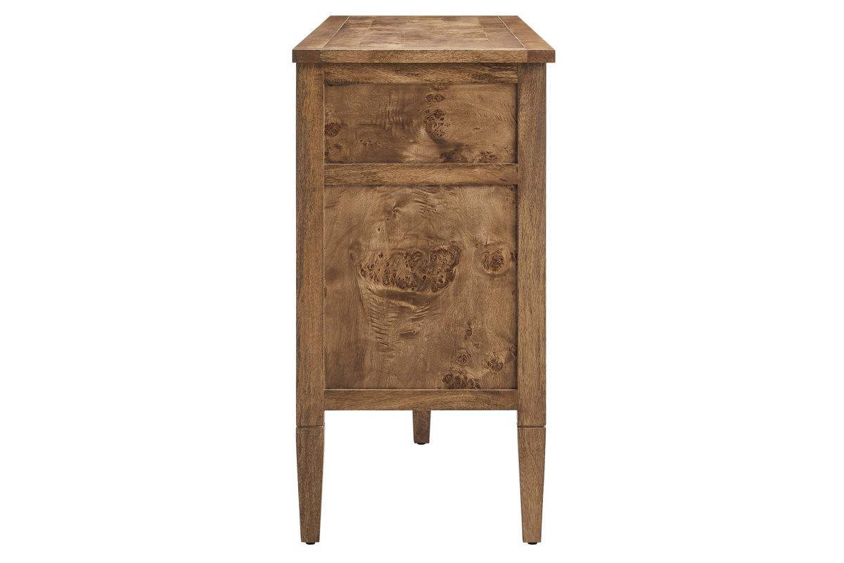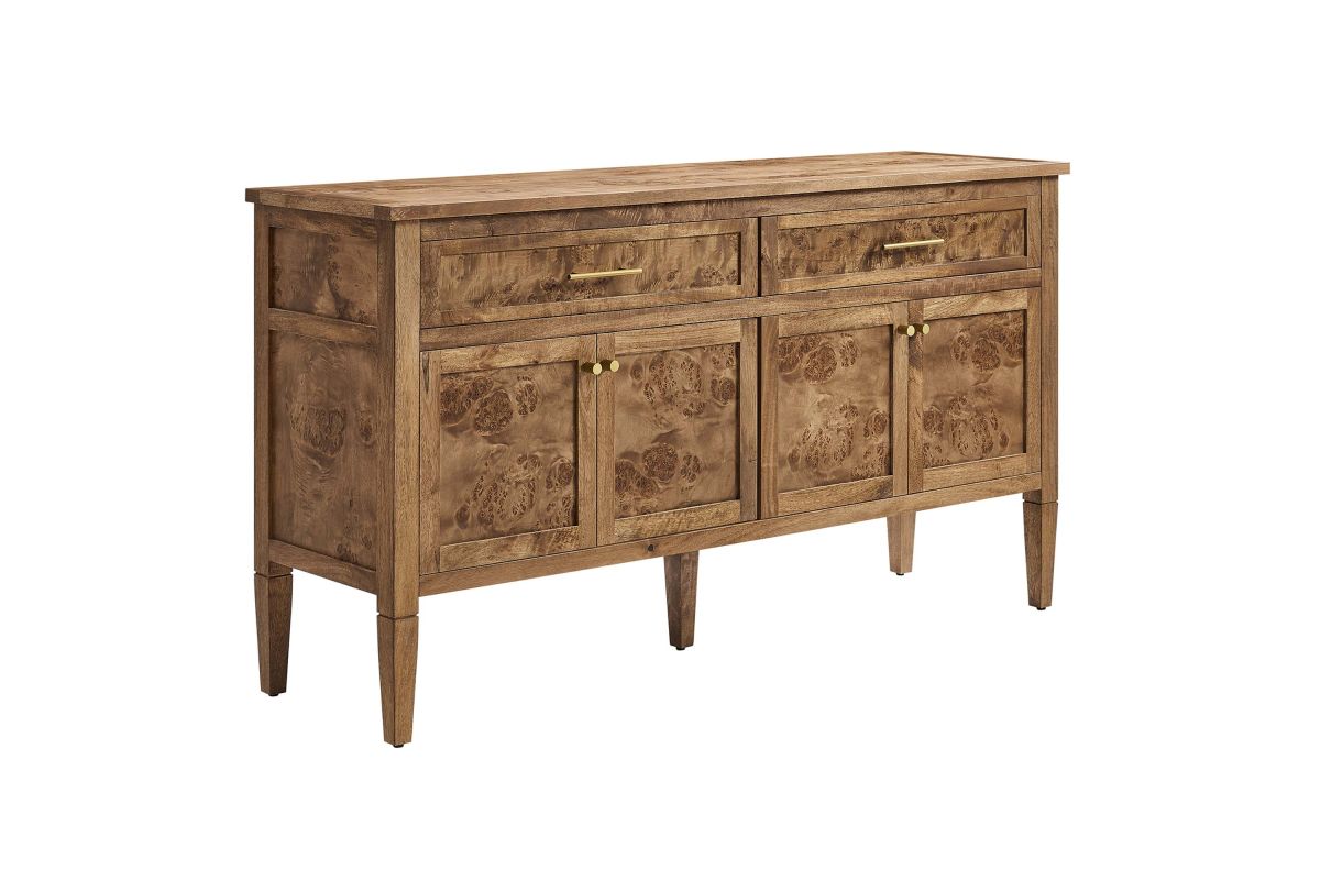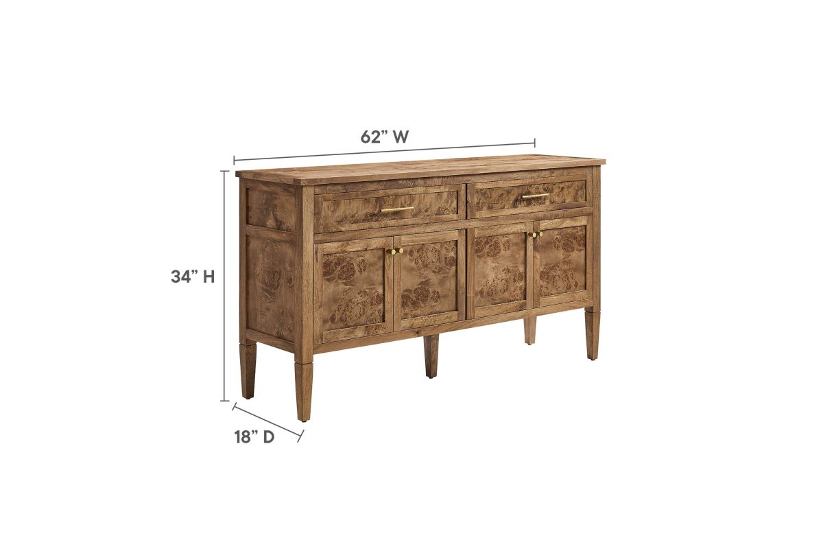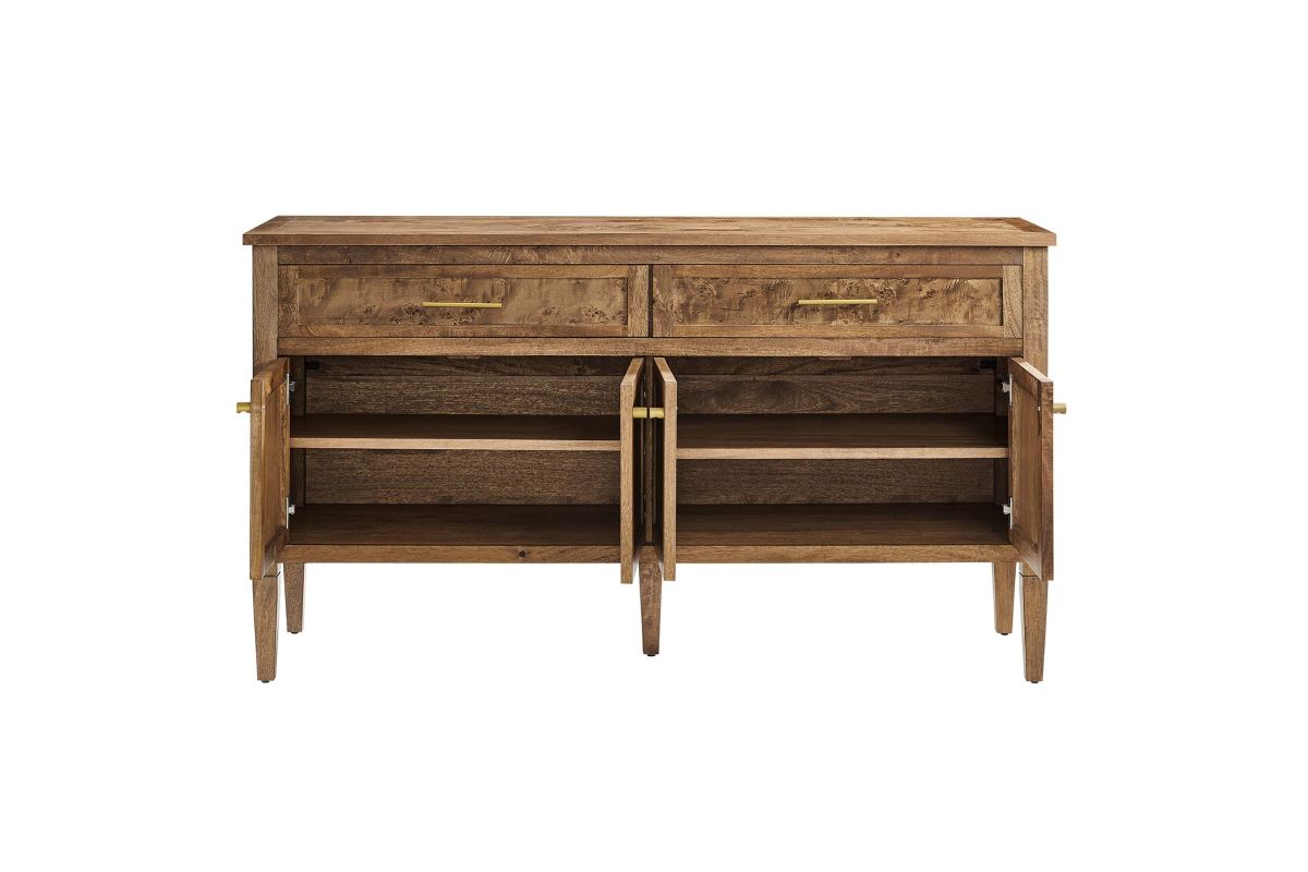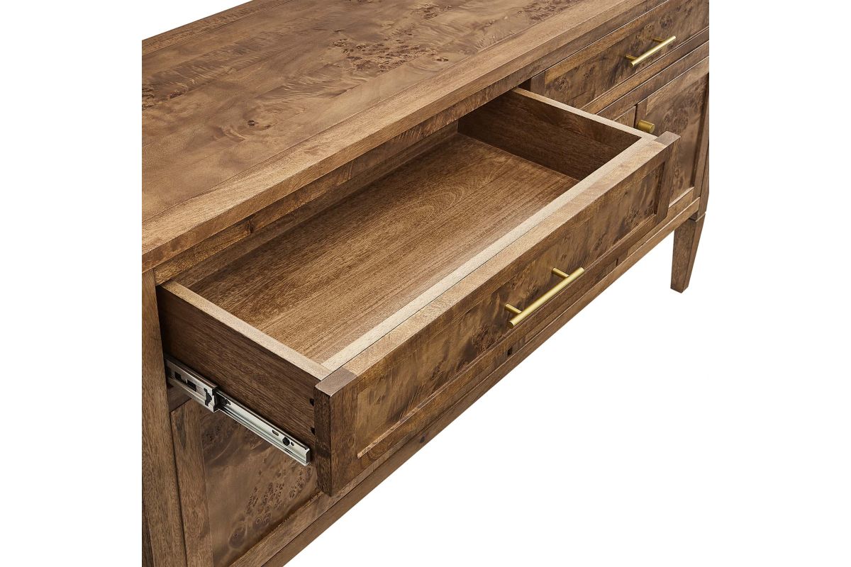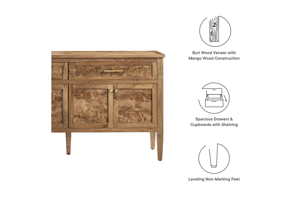 Discover the epitome of aesthetics and practicality with the Elysian 62" Burl Wood Sideboard. Uniquely crafted from exquisite mango wood and adorned with a rich burl wood veneer, this accent cabinet radiates distinctive charm and character. Featuring two wide top drawers and double cupboards below with spacious shelving, each seamlessly integrated with soft-close hinges, this wood console table also serves as a buffet cabinet, credenza, or even a kitchen storage cabinet. A versatile piece, Elysian is also a stylish TV stand for televisions up to 68". It provides extensive storage space perfect for organizing dining essentials like table linens, cutlery, or glassware, as well as media essentials, board games, books, or decorative objects. Its sleek design is further enhanced by tapered wood legs, while its leveling, non-marking feet help protect floors, making it a practical choice for modern homes. Whether used as a hallway console, entryway table or storage cabinet for the living room, this versatile media stand comes with easy-to-follow assembly instructions for a smooth setup. Weight Capacity: 275 lbs. Please Note: When placing the TV directly on the unit, we recommend anchoring it in place. Set Includes: One - SideBoard