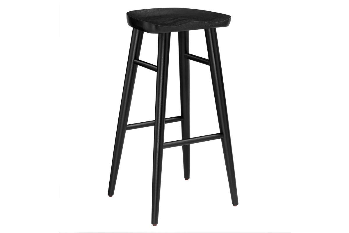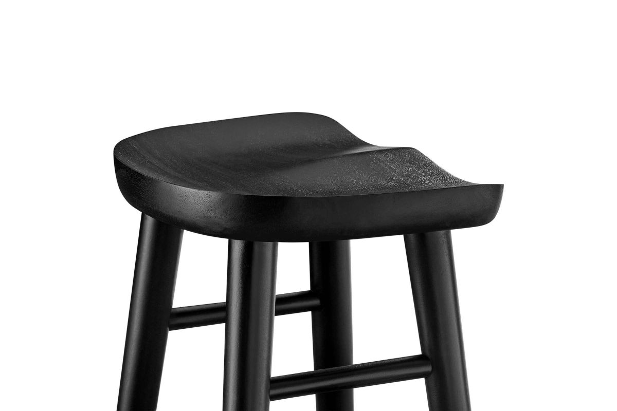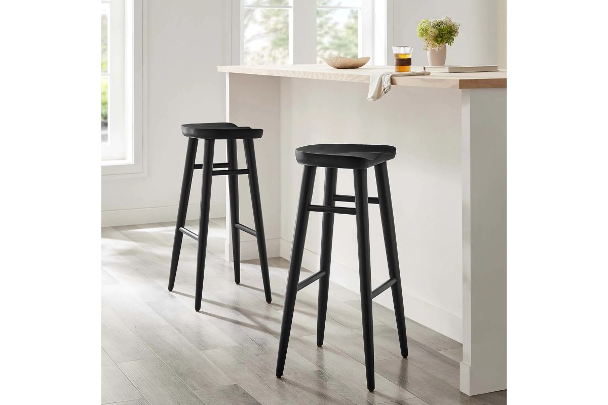 Explore the Saville Bar Stools Set of Two, where minimalist design meets contemporary style, perfect for your home and kitchen. These bar stools are expertly crafted from solid mango wood, offering durability and a natural aesthetic giving them a rustic charm. The contoured saddle seats of these modern backless bar stools provide comfort and a sleek profile, enhancing any kitchen counter or bar setting. Their splayed and tapered legs feature functional stretchers, adding a sophisticated touch. Equipped with adjustable, non-marking foot glides, these natural wood bar stools protect your flooring while ensuring stability. Ideal for modern settings, this saddle stool set is a timeless enhancement to a kitchen island, bar area, or bar-height table. The Saville Bar Stools Set of Two come fully assembled and ready to use. Weight Limit: 200 lbs.