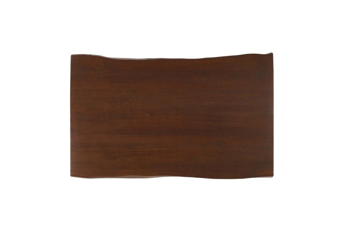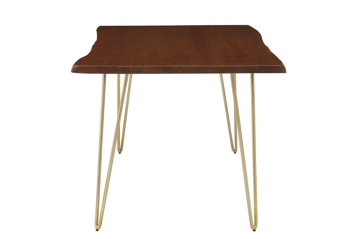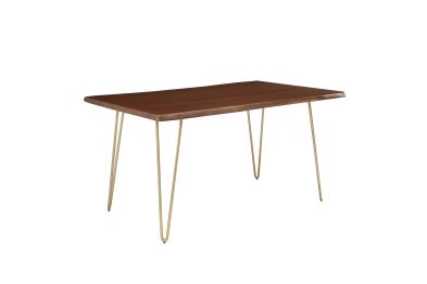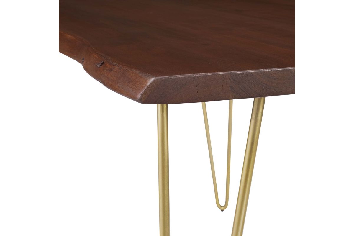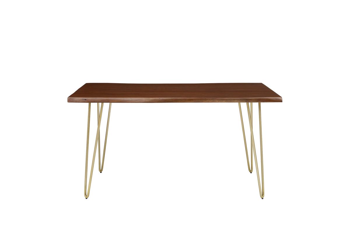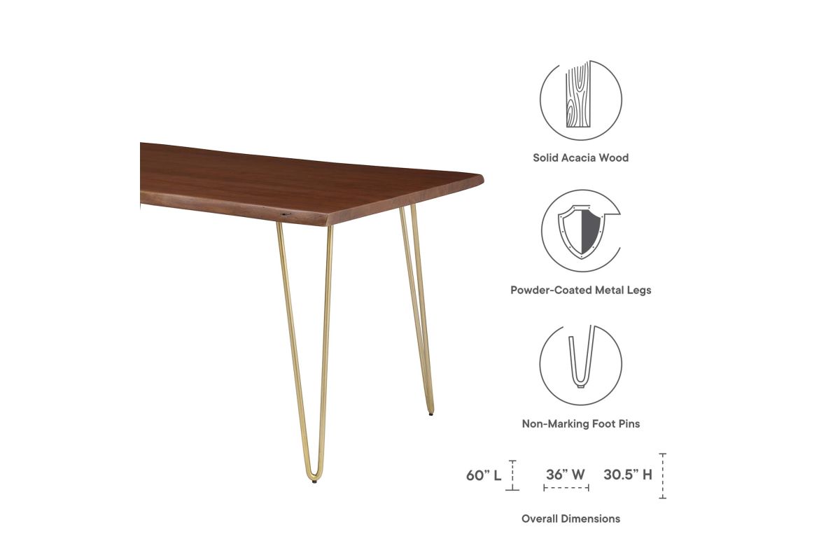 Sit amidst organic intrigue and retro style with the Ardor Rectangular Live Edge Dining Table. Featuring a one-of-a-kind raw edge tabletop crafted with a solid piece of acacia wood, this dining table is brimming with natural beauty. Comfortably accommodating six dining chairs, this 60" table rests on four powder-coated metal hairpin legs. This versatile dining table is ideal for everyday dining and entertaining and can also serve as a functional office desk. Due to the natural characteristics of the wood, each live edge table is unique. Includes non-marking foot pins to protect flooring. Assembly required.