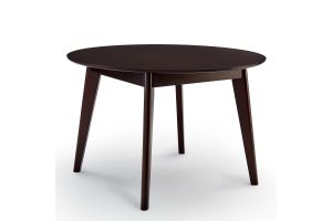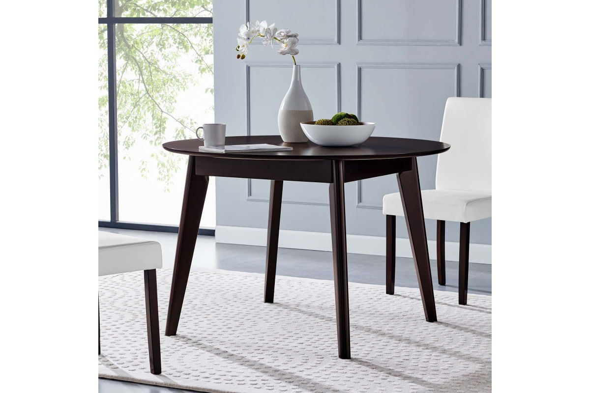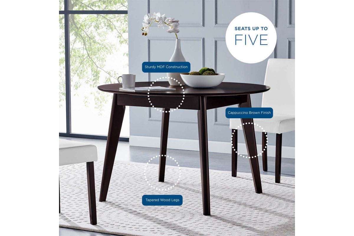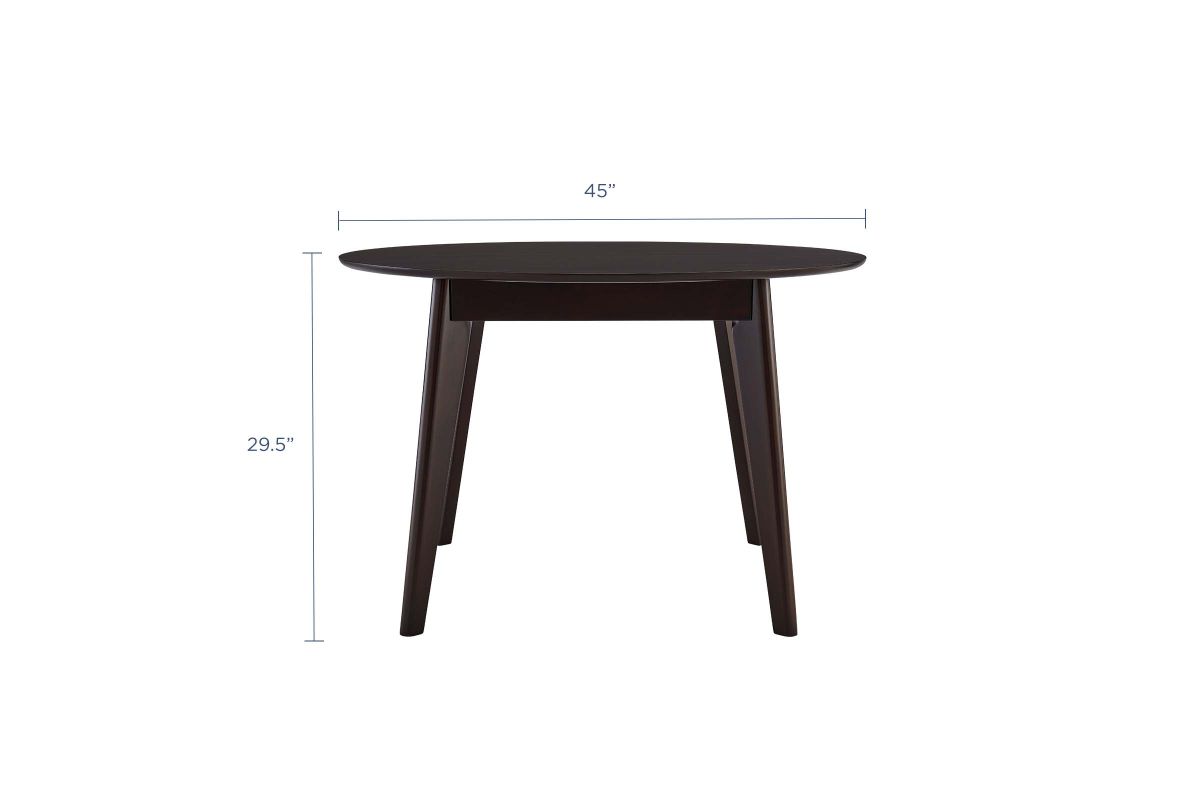 Create an atmosphere of cozy revelry with the Vision 45" Round Dining Room Table. Sturdily constructed from wood veneer and MDF with four tapered wood legs, this dining table features a sleek mid-century modern style. A round top sets the Vision Kitchen Table makes this a most versatile and space-saving piece. Instantly update any dining room, kitchen, breakfast nook, or dining area decor with this retro-modern dining table. Seats up to 4 people. Assembly Required.
