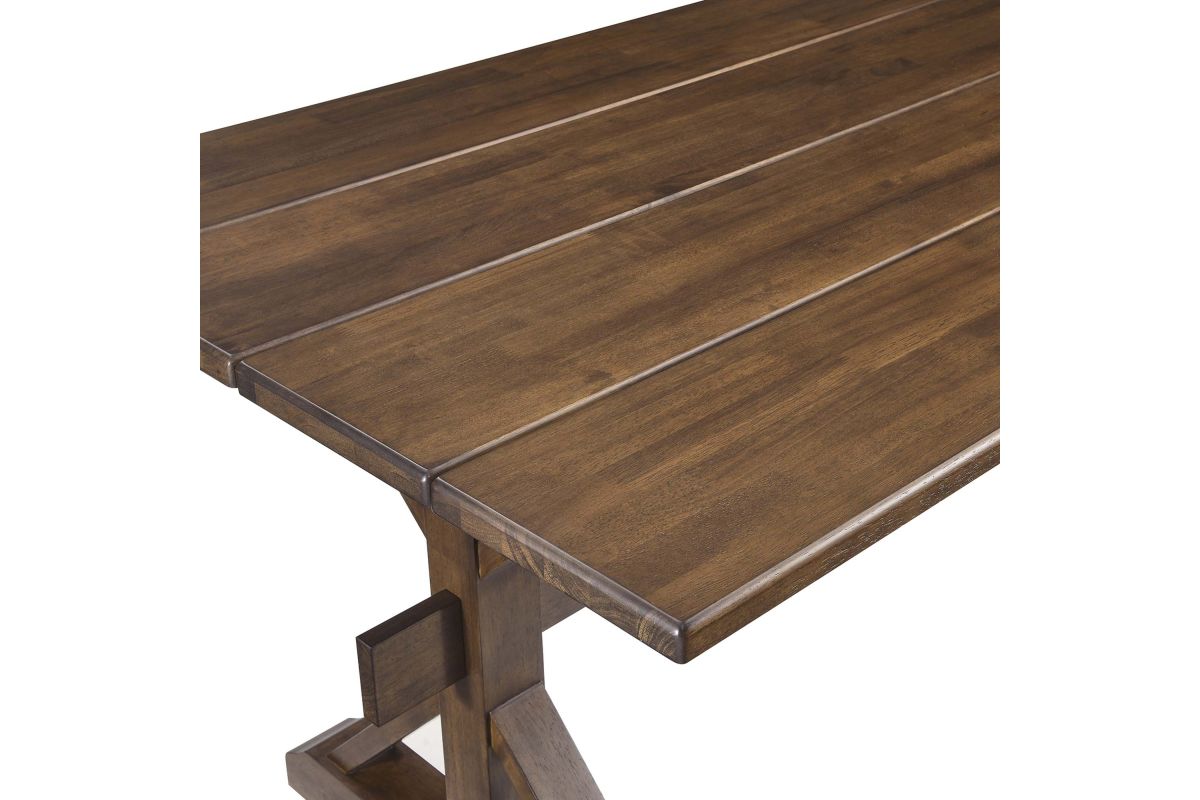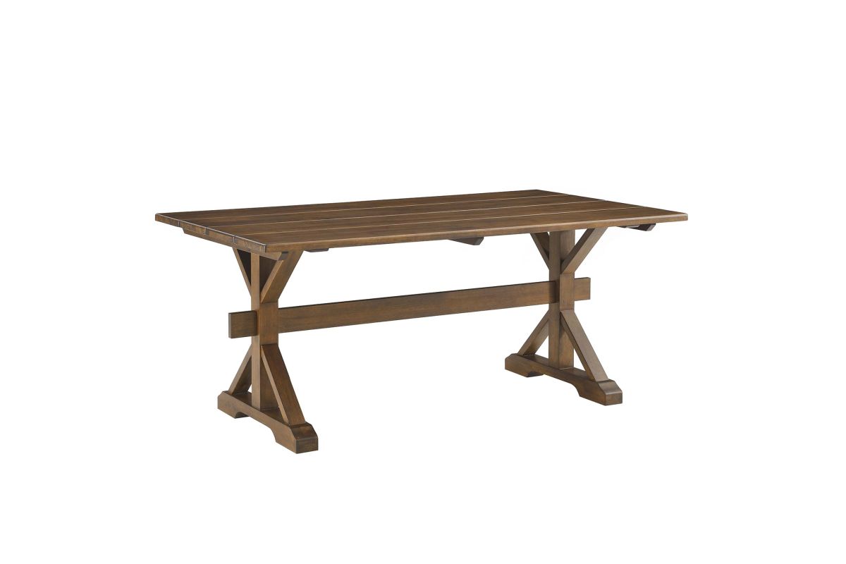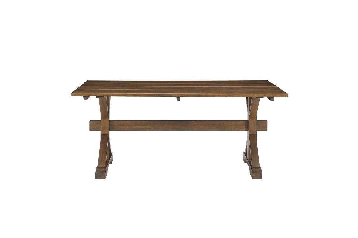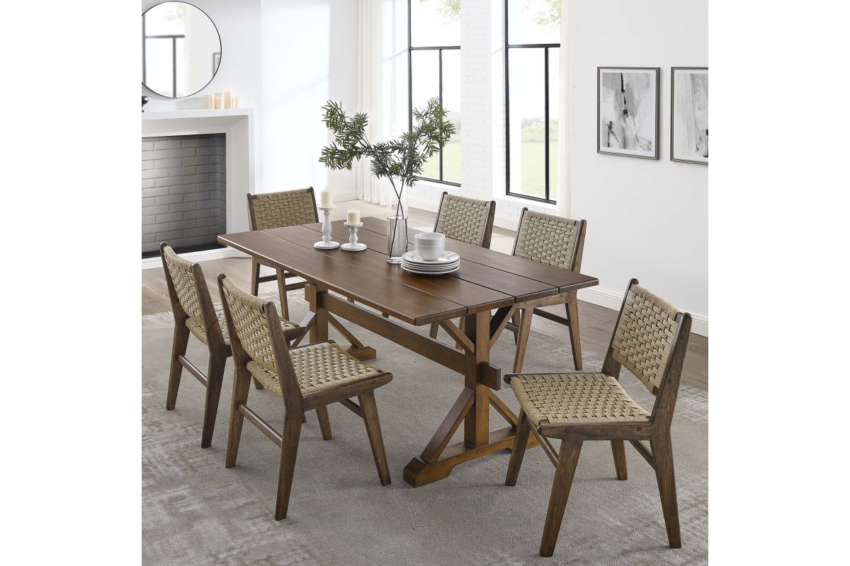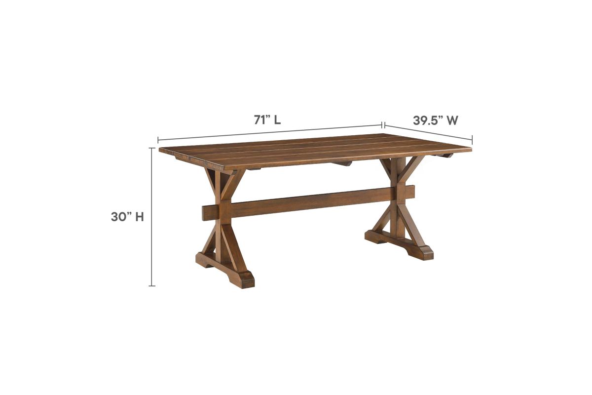 Bring the warmth of the countryside into your dining room with the Windchime 71" Wood Dining Table. Crafted from solid wood and wood veneer, this sturdy trestle table stands 71 inches long, seating 6 to 8 dining chairs comfortably. The natural wood grain elevates the charm, while the trestle base adds a rustic design element. Ideal for both intimate dinners and entertaining family and friends, this wood dining table effortlessly blends farmhouse charm with modern appeal, making it a must-have centerpiece for your home. Simple assembly required. Includes adjustable levelers for added stability and to protect flooring. Weight Capacity: 740 lbs.