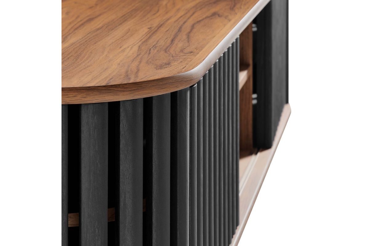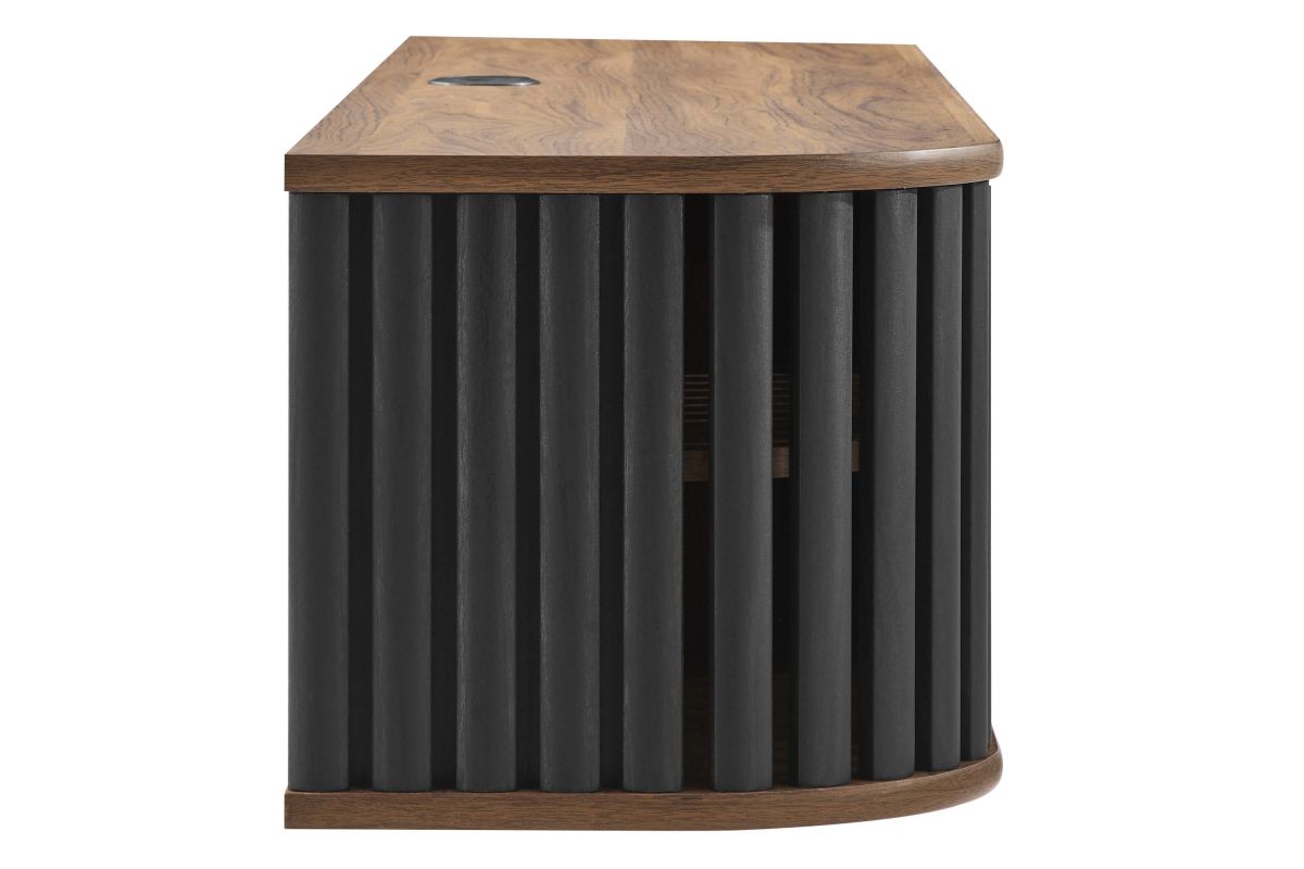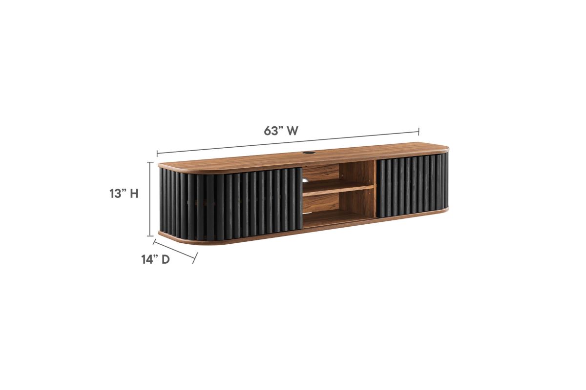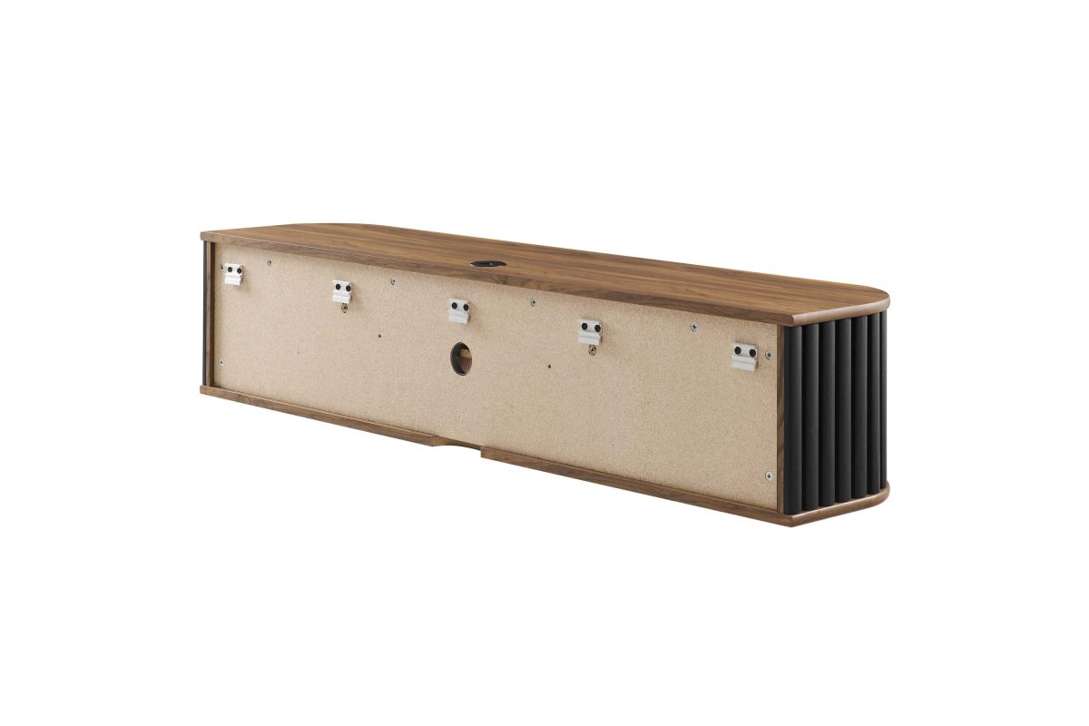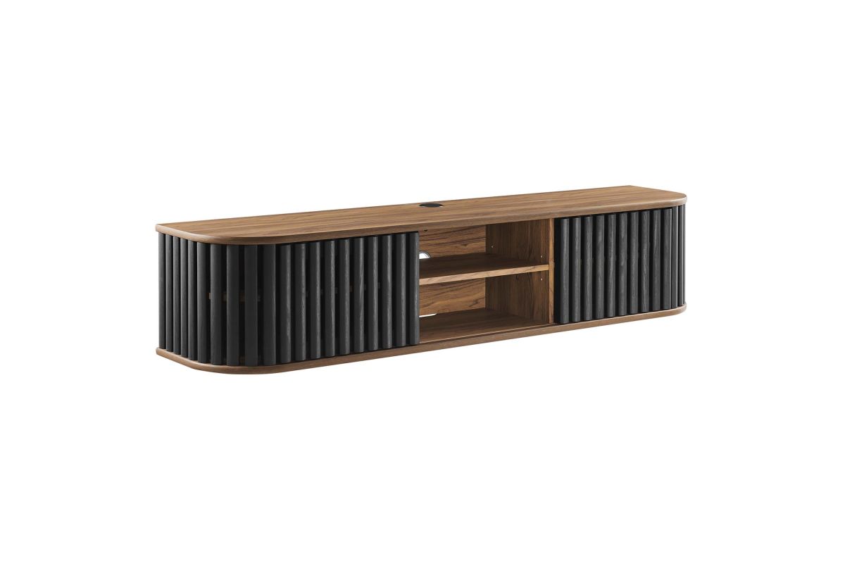 Elevate your entertainment with the Fortitude Wall Mounted TV Stand. With its sliding doors, timber style strip design, adjustable shelves, and a grommet on top for cable management, Fortitude is a practical and stylish solution for any living space. Crafted from MDF and particleboard and designed to mount on the wall, this stand can accommodate TVs up to 70 inches. Includes non-marking foot caps. Assembly required.
