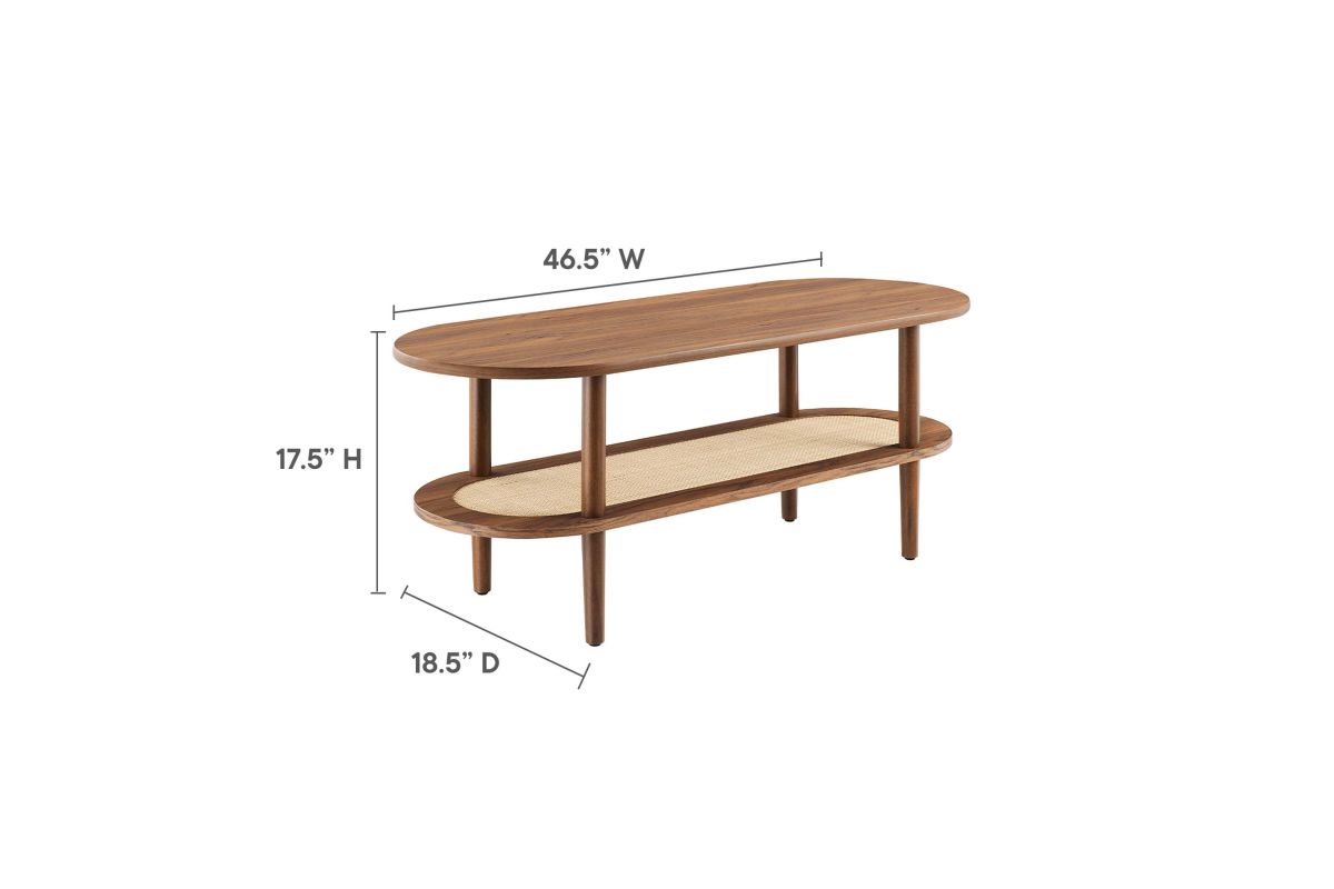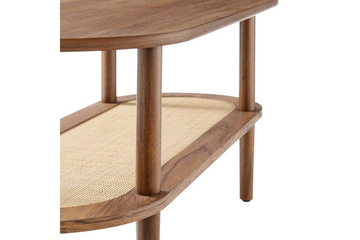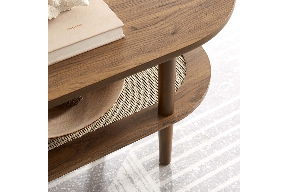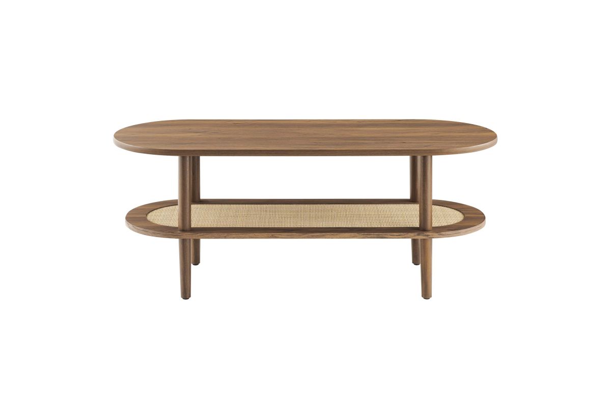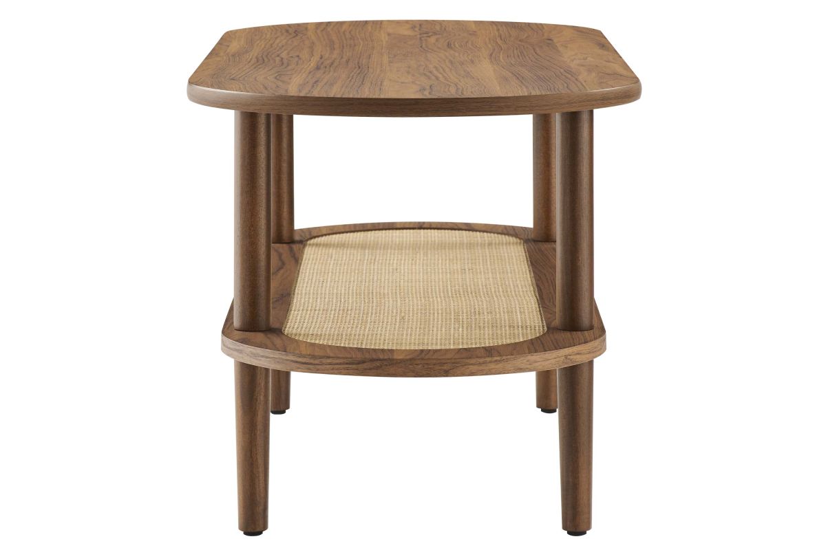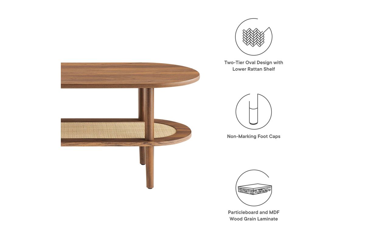 The Torus Coffee Table features a harmonious blend of modern and rustic aesthetics with its oval design and wood grain finish. Made of particleboard and MDF, the table features an upper panel and a bottom rattan shelf enclosed by a wood grain laminate rim. This unique interplay of materials creates a stunning visual appeal that enhances any space. The table's four round straight legs provide robust support, while non-marking foot caps protect your floors.