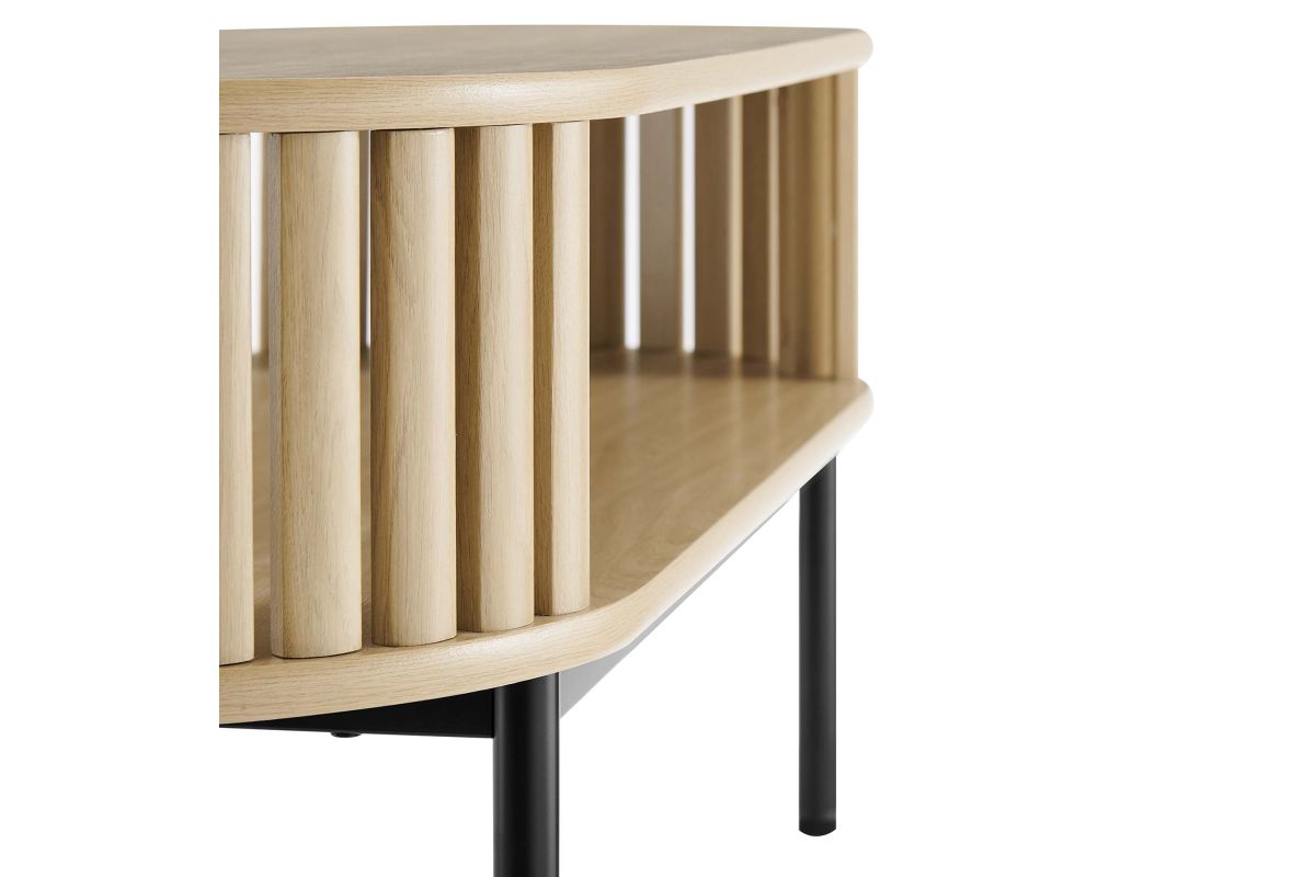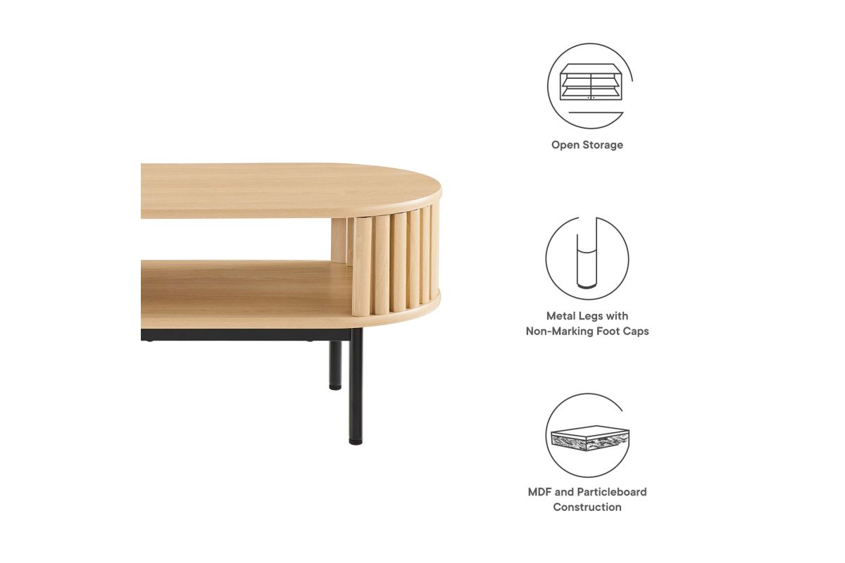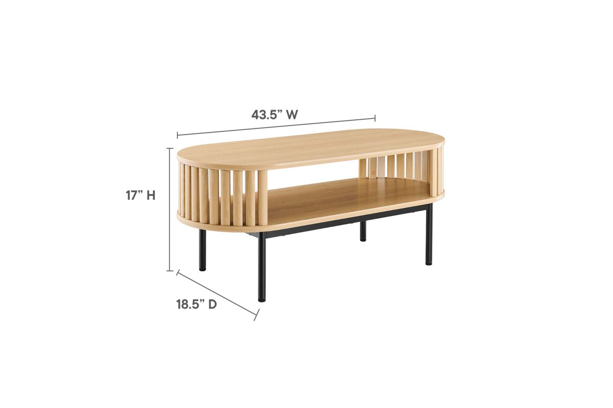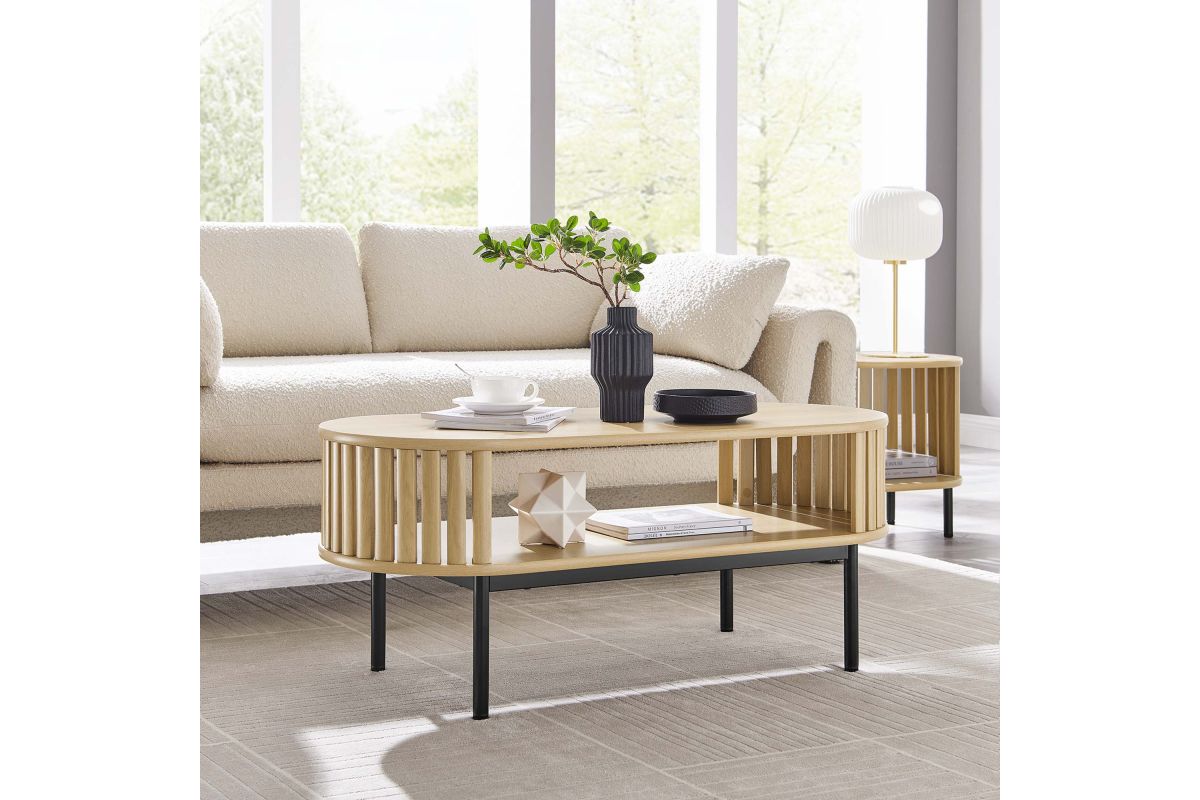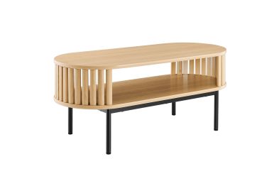 The Fortitude Coffee Table brings modern style to your living room. Its sleek oval shape and open timber style strip design create a spacious feel, while the round metal legs add an industrial touch. Made from MDF and particleboard with a wood grain finish, this coffee table is both sturdy and stylish. Perfect for holding drinks, magazines, or decorative items, this coffee table is an ideal addition to your living room, office, lounge, or other seating area. Includes non-marking foot caps. Assembly required.