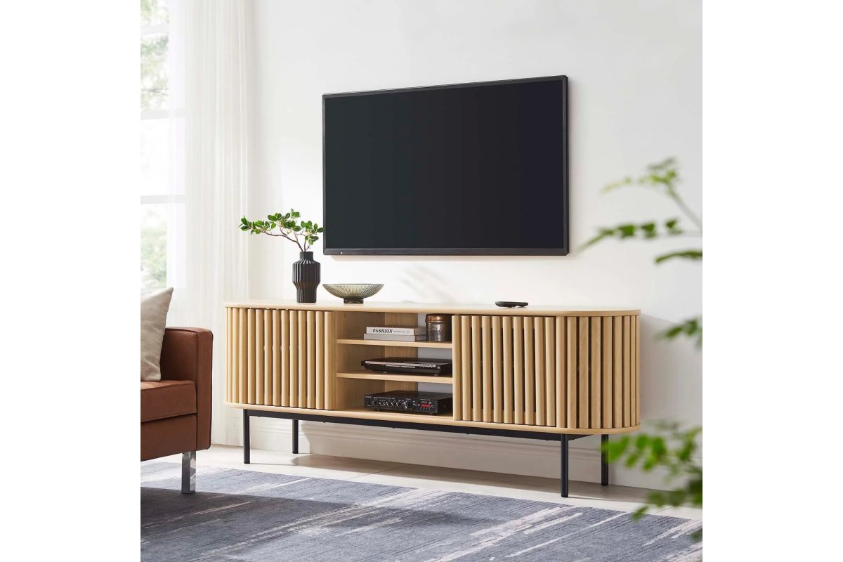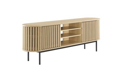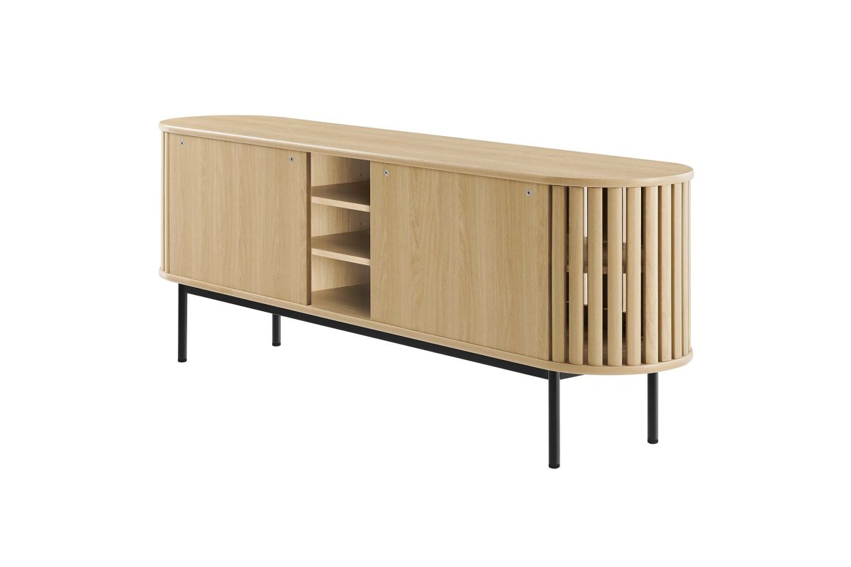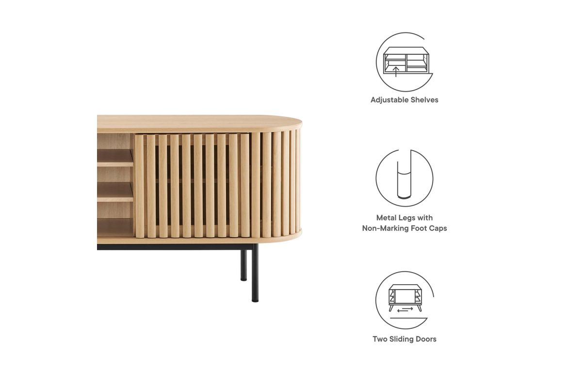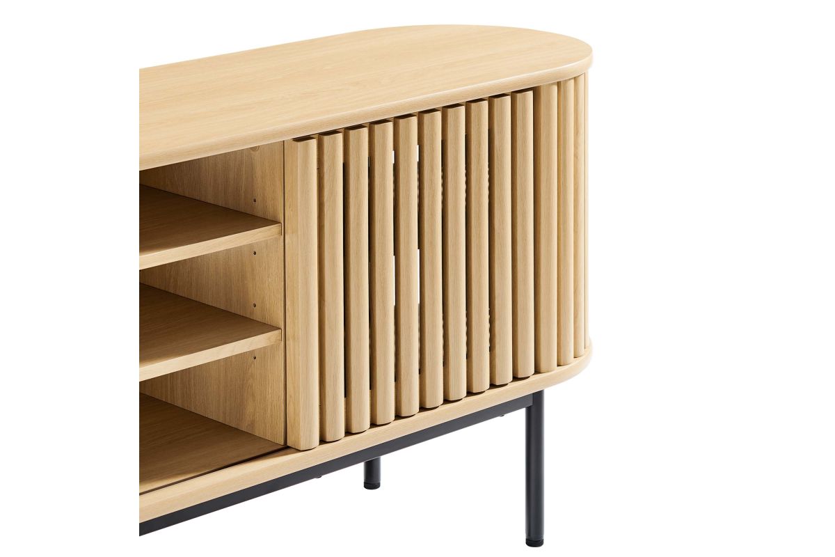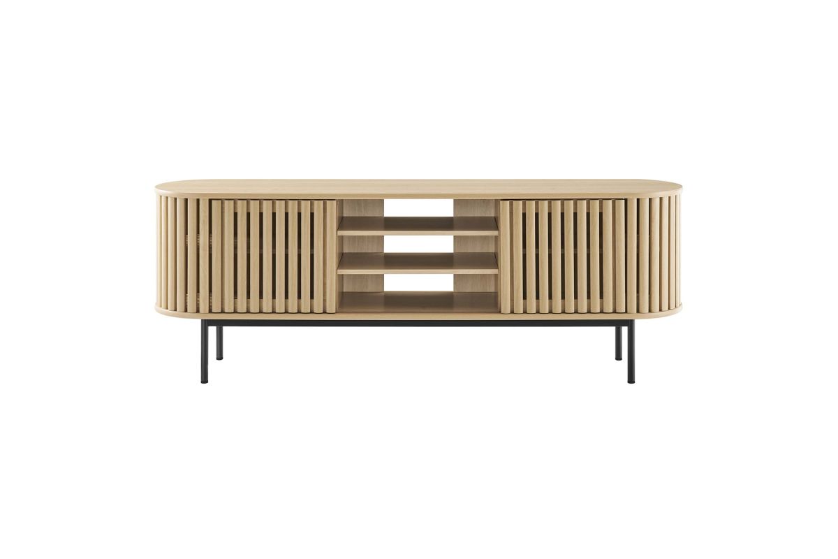 Embrace the clean lines and contemporary style of the Fortitude 71" TV Stand. Showcasing a captivating oval shape, this TV stand brings a modern aesthetic to any room. The open middle storage area accommodates media accessories and includes an open back for seamless cable management. Two adjustable center shelves allow for versatile storage options, while two front sliding timber strip style doors offer a unique and attractive look. Constructed from MDF and particleboard with a natural wood grain finish, Fortitude rests on straight round black metal legs for a sleek look. This high profile TV stand has a weight capacity of 200 lbs and supports flat screen TVs up to 78 inches, blending functionality and style to suit your entertainment needs. Includes non-marking foot caps. Assembly required.