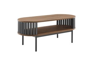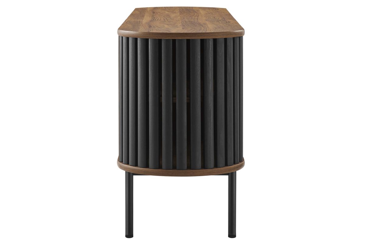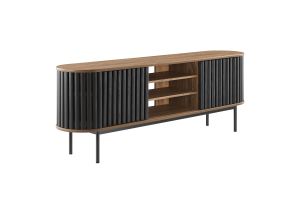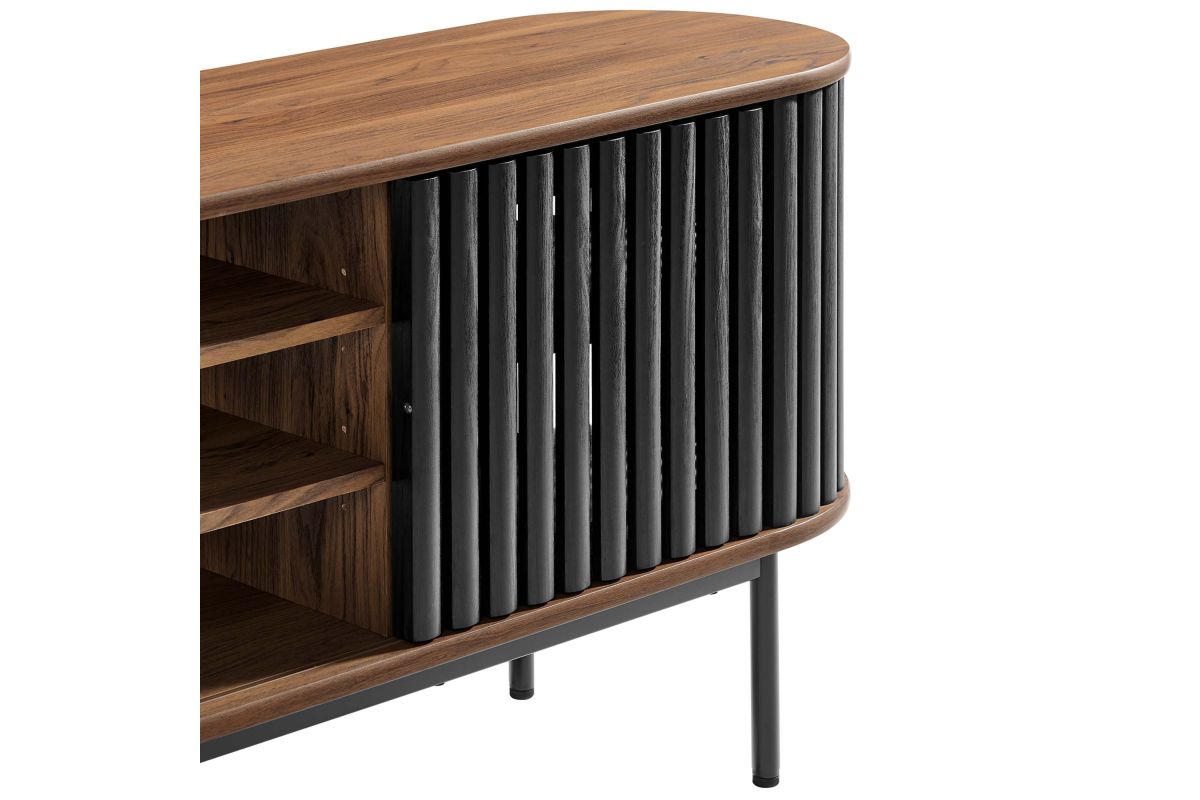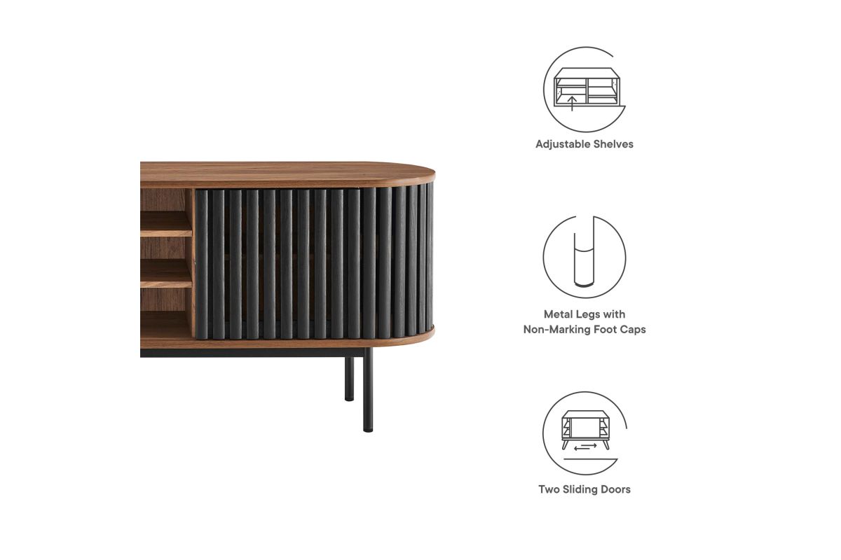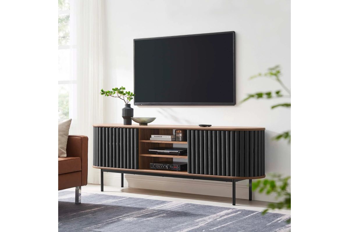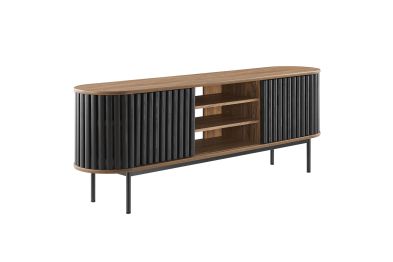 Embrace the clean lines and contemporary style of the Fortitude 71" TV Stand. Showcasing a captivating oval shape, this TV stand brings a modern aesthetic to any room. The open middle storage area accommodates media accessories and includes an open back for seamless cable management. Two adjustable center shelves allow for versatile storage options, while two front sliding timber strip style doors offer a unique and attractive look. Constructed from MDF and particleboard with a natural wood grain finish, Fortitude rests on straight round black metal legs for a sleek look. This high profile TV stand has a weight capacity of 200 lbs and supports flat screen TVs up to 78 inches, blending functionality and style to suit your entertainment needs. Includes non-marking foot caps. Assembly required.