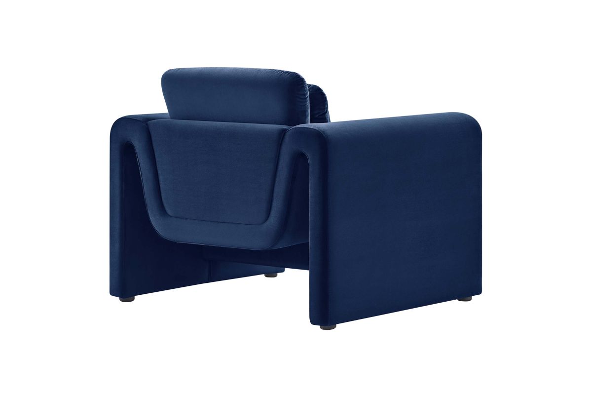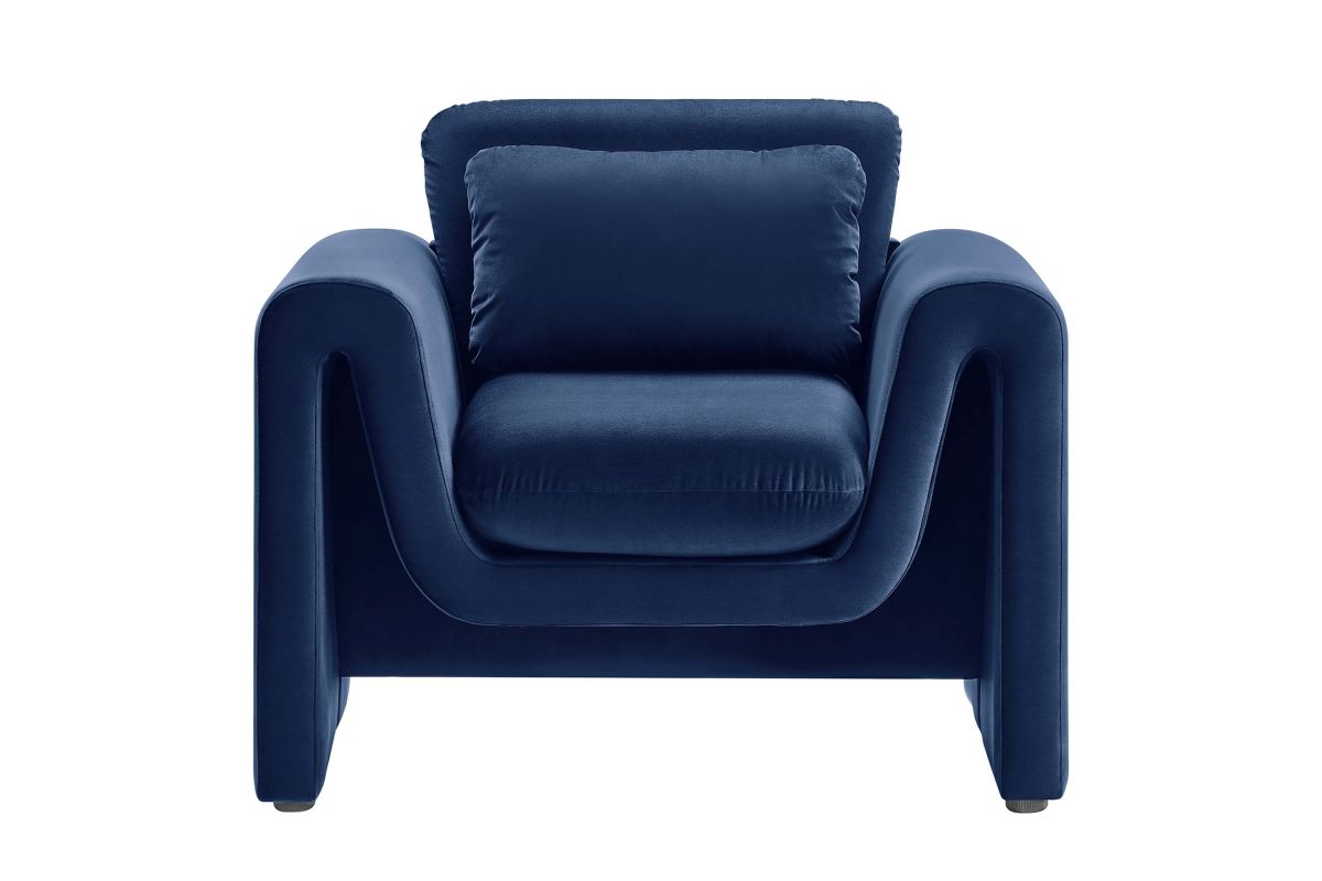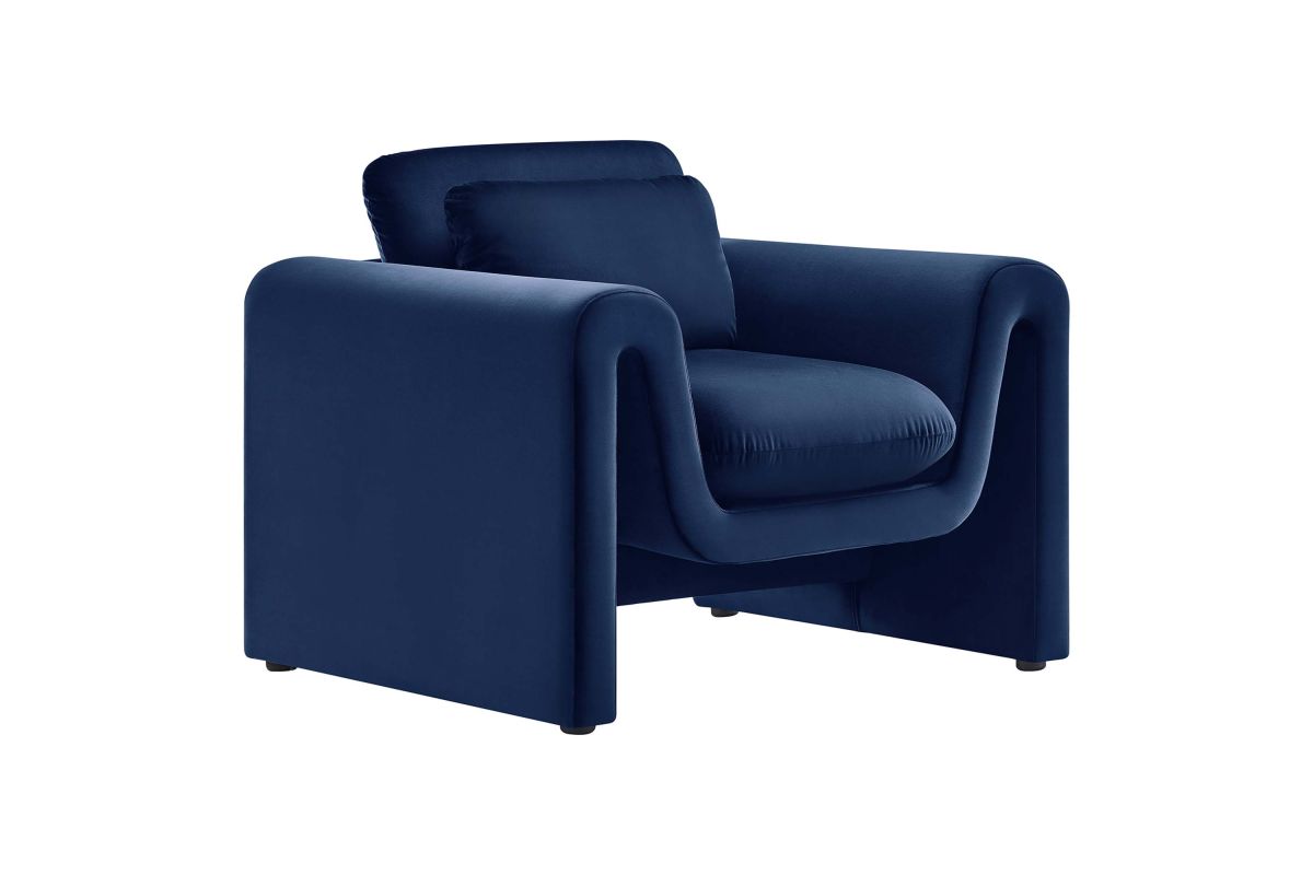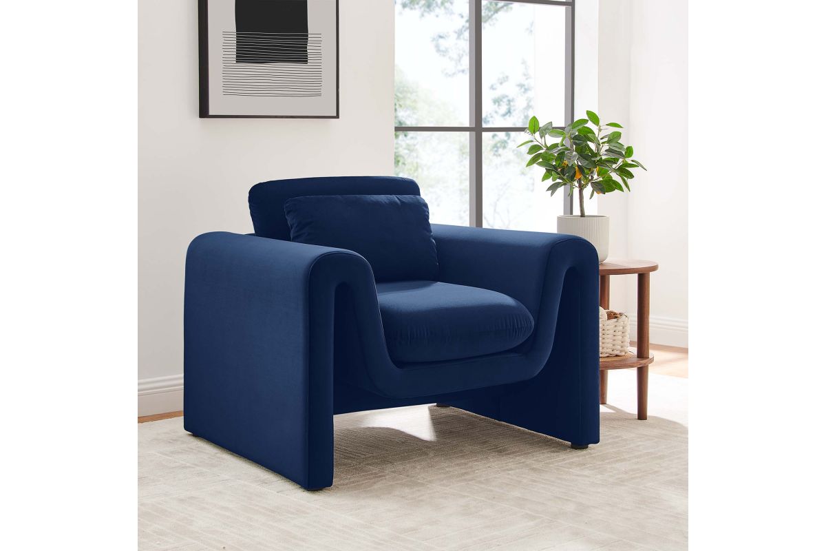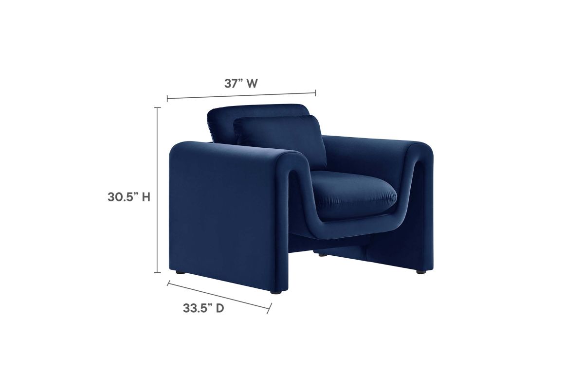 Divulge in the luxe splendor of the one-of-a-kind Waverly Performance Velvet Armchair. This living room chair features a unique, wavy shape complete with bent lines and rounded edges. With dense foam padding for superior comfort, this accent chair is upholstered in stain-resistant performance velvet with a soft and luxurious feel. The spacious seat and plush removable cushions create an inviting look and offer superior comfort while resting and relaxing. The adjustable non-marking foot pads elevate the upholstered armchair to perfectly fit your space and protect your floors. With its beautiful silhouette and cozy comfort, this performance velvet chair is a stylish piece for the living room, bedroom, office, or reception area. No assembly required. Weight Capacity: 330 lbs.