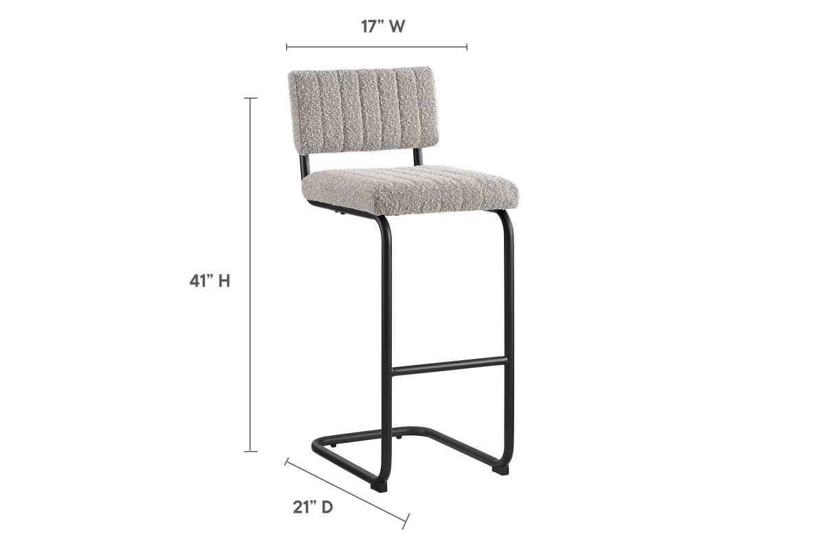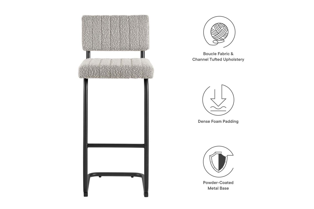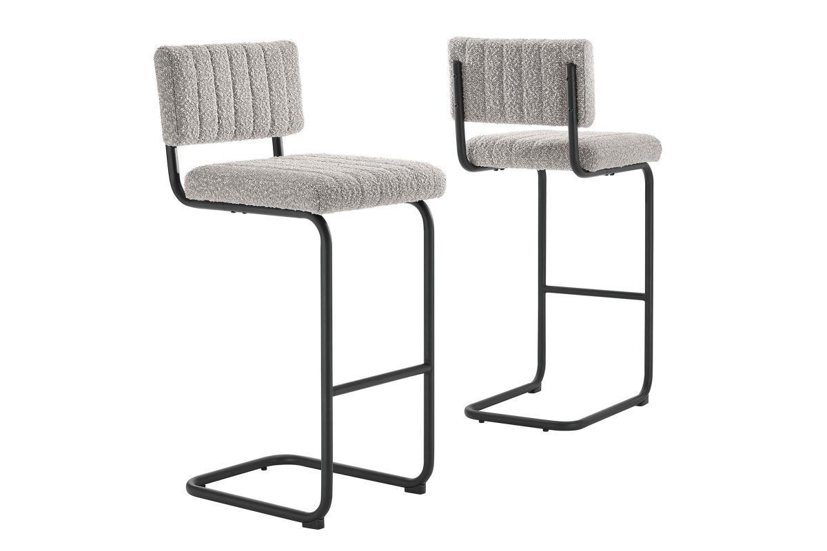 Bring mid-century style to your dining space with the Parity Bar Stools - Set of 2. These bar stools feature perfectly textured boucle fabric upholstery that is channel tufted for a retro modern look. The powder-coated tubular metal sled bases provide a sleek silhouette and superior durability with a weight capacity of 330 lbs. These bar stools are equipped with non-marking foot pads to protect flooring and dense foam padding for added comfort and support. With both retro modern and vintage style, this set of two bar stools brings a unique flair to a bar-height table or kitchen counter. Assembly is required.