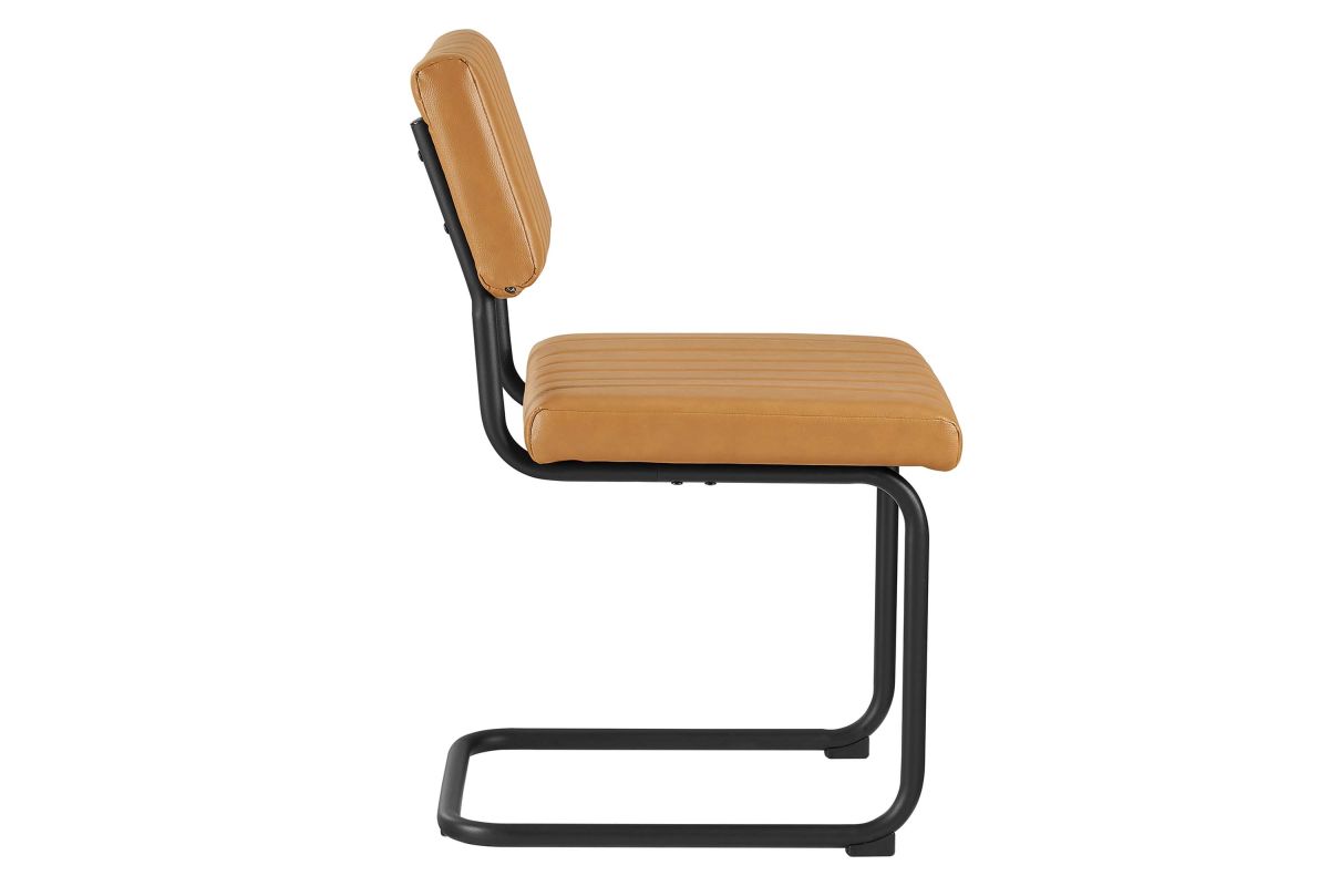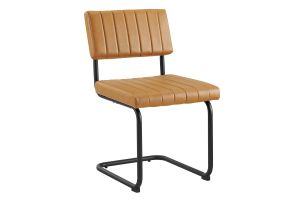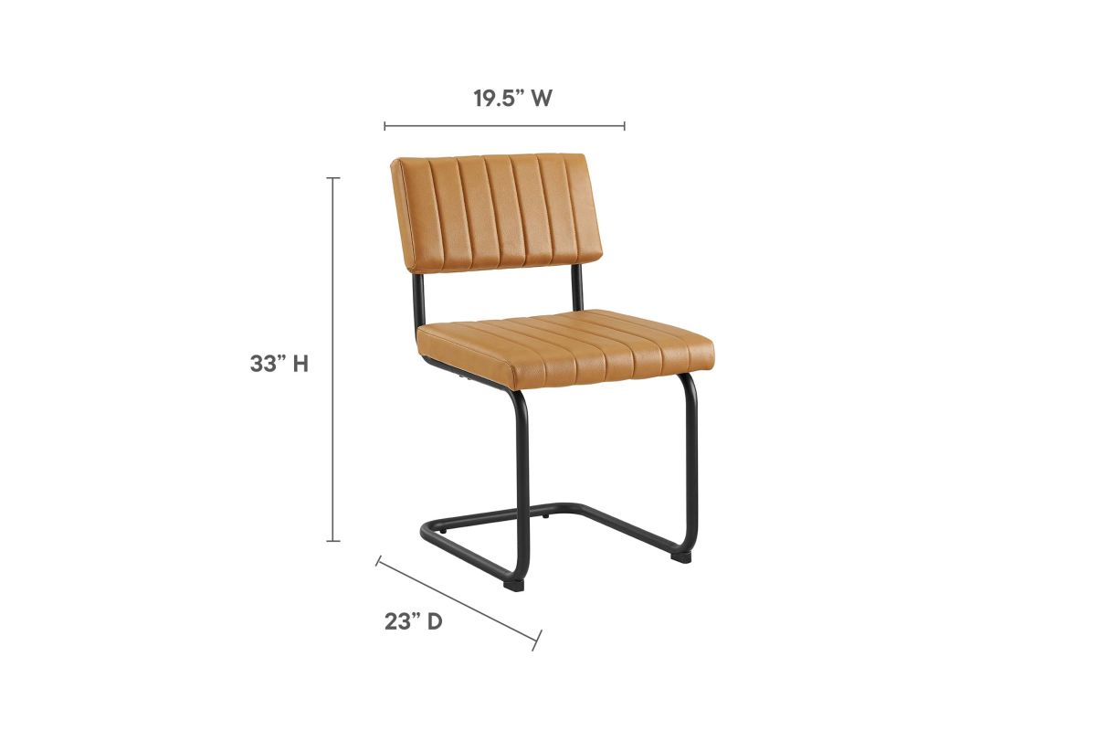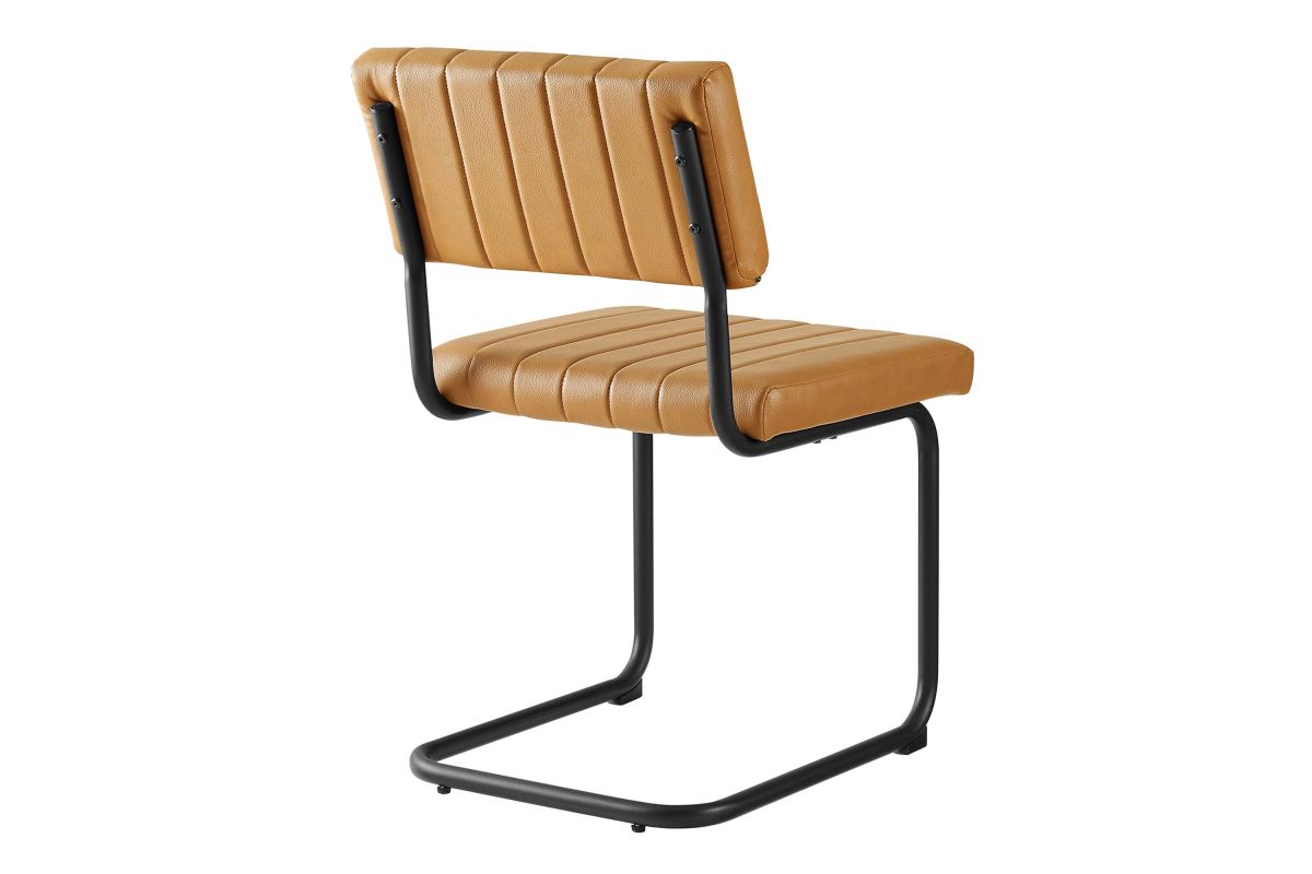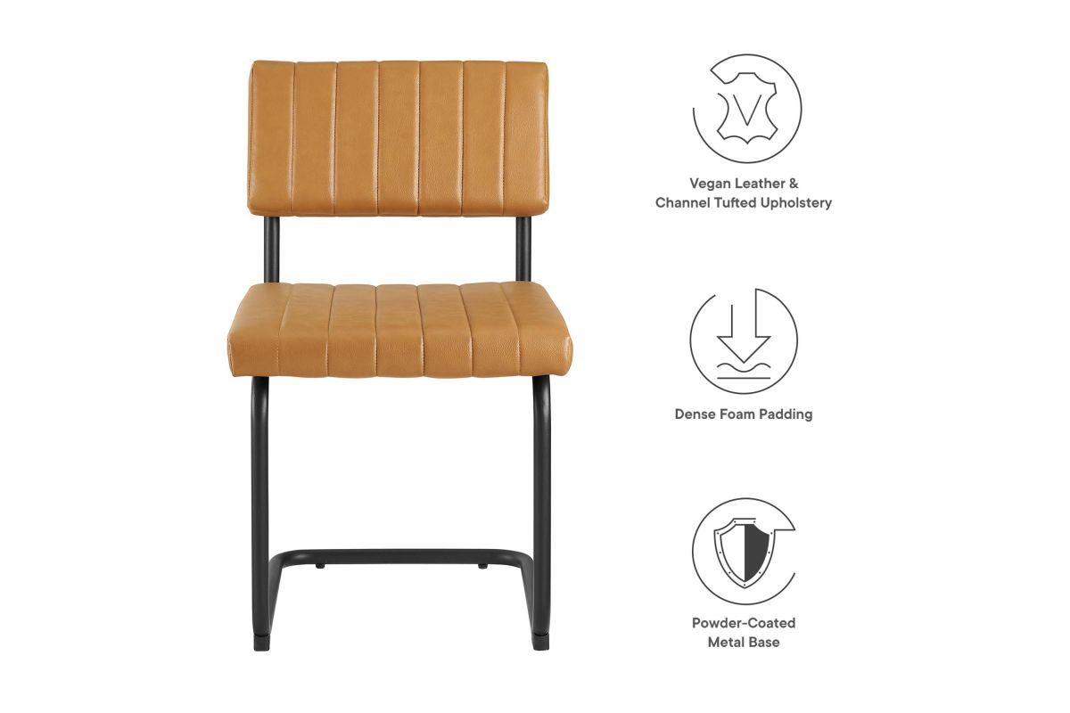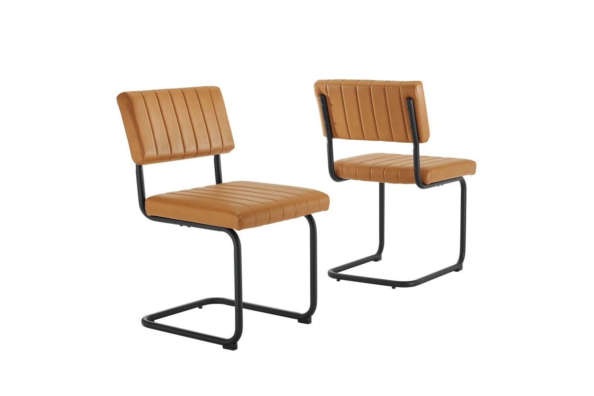 Bring mid-century style to your dining space with the Parity Dining Chairs - Set of 2. These side chairs feature smooth vegan leather upholstery that is channel tufted for a retro modern look. The powder-coated tubular metal sled bases provide a sleek silhouette and superior durability with a weight capacity of 330 lbs. These dining chairs are equipped with non-marking foot pads to protect flooring and dense foam padding for added comfort and support. With both retro modern and vintage style, this set of two dining side chairs brings a unique flair to your dining room, kitchen space, or living area. Assembly is required.