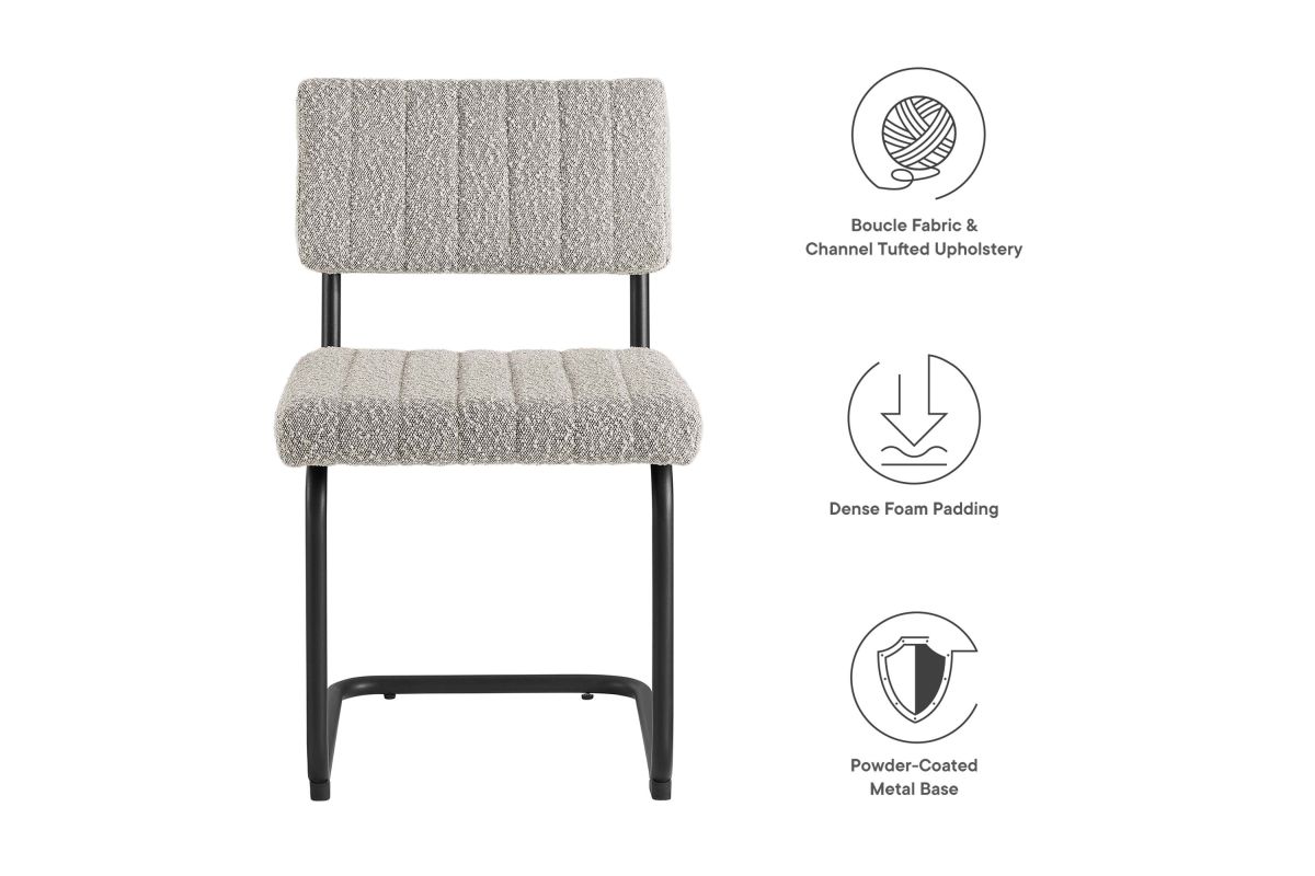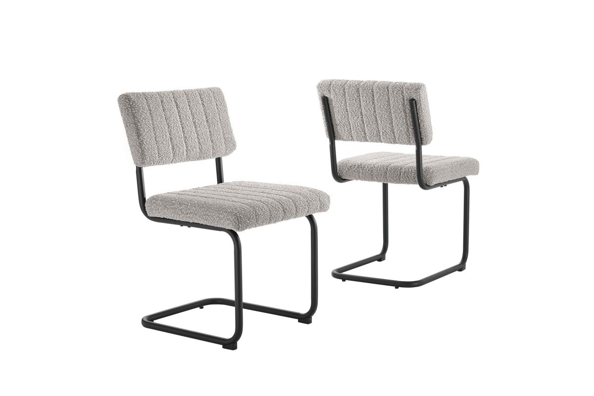 Bring mid-century style to your dining space with the Parity Dining Chairs - Set of 2. These side chairs feature perfectly textured boucle fabric upholstery that is channel tufted for a retro modern look. The powder-coated tubular metal frames provide a sleek silhouette and superior durability with a weight capacity of 330 lbs. Resting on a sled base, these dining chairs are equipped with non-marking foot pads to protect flooring and dense foam padding for added comfort and support. With both retro modern and vintage style, this set of two dining side chairs brings a unique flair to your dining room, kitchen space, or living area. Assembly is required.