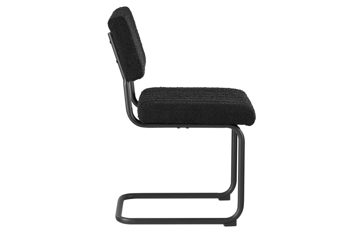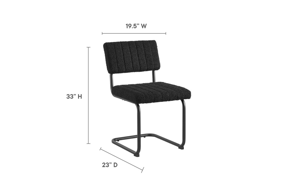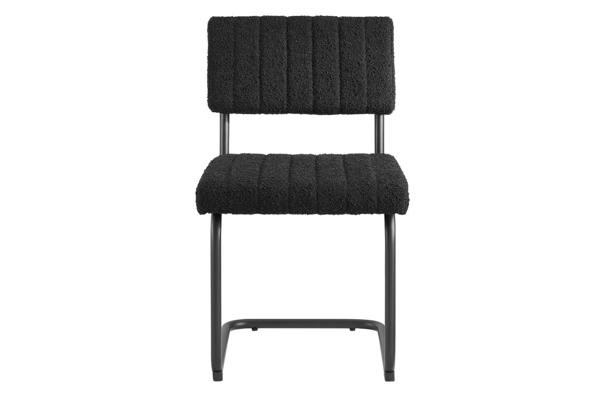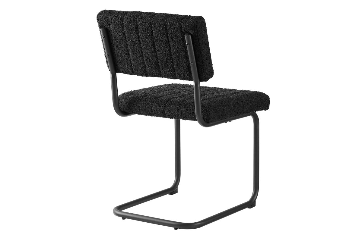 Bring mid-century style to your dining space with the Parity Dining Chairs - Set of 2. These side chairs feature perfectly textured boucle fabric upholstery that is channel tufted for a retro modern look. The powder-coated tubular metal frames provide a sleek silhouette and superior durability with a weight capacity of 330 lbs. Resting on a sled base, these dining chairs are equipped with non-marking foot pads to protect flooring and dense foam padding for added comfort and support. With both retro modern and vintage style, this set of two dining side chairs brings a unique flair to your dining room, kitchen space, or living area. Assembly is required.