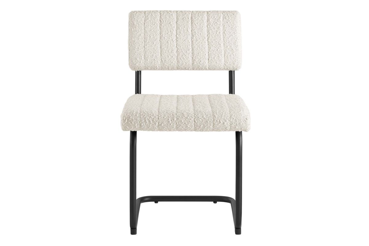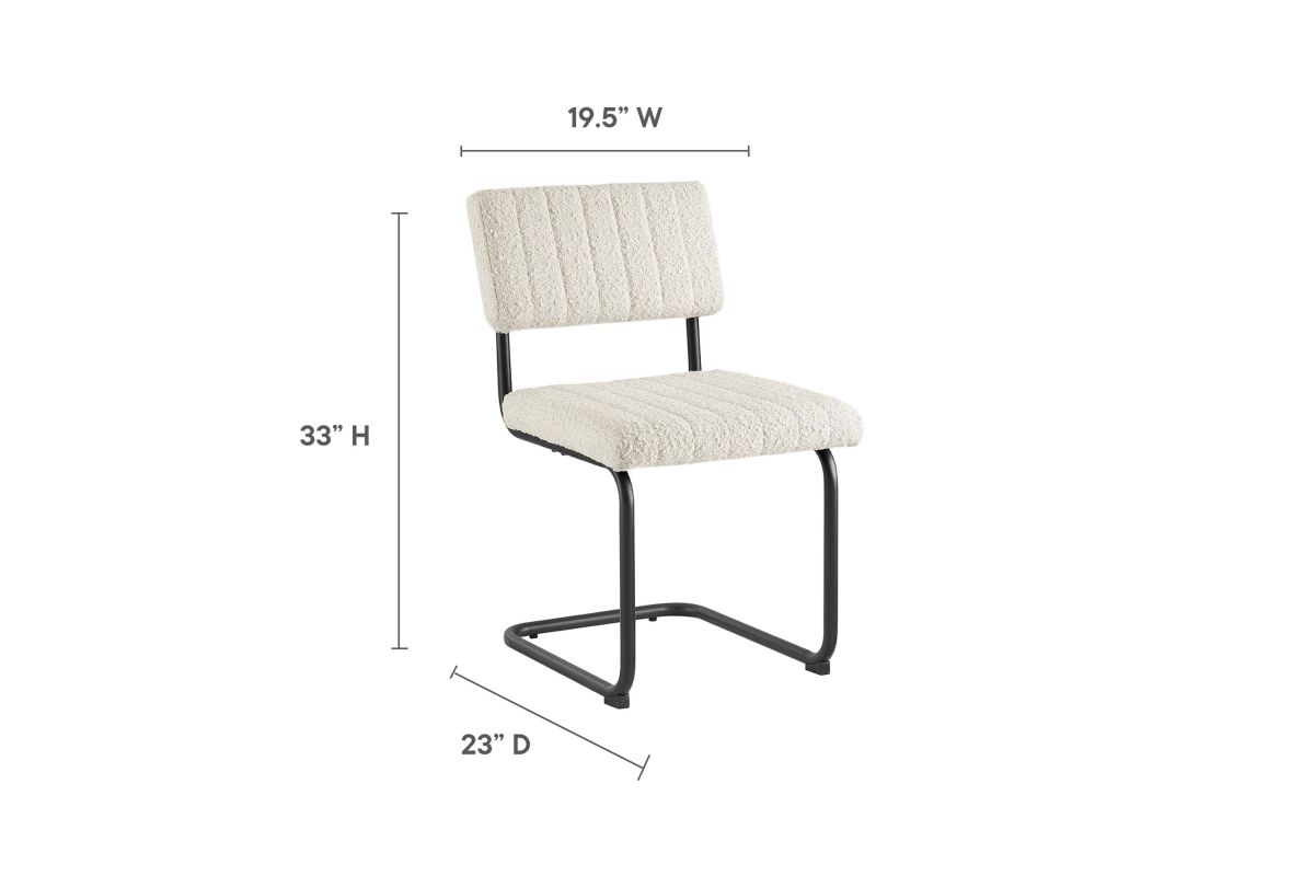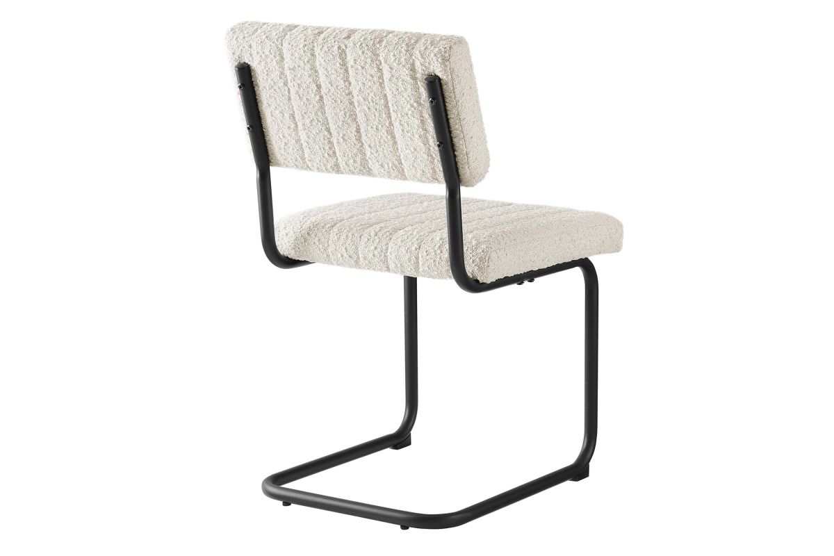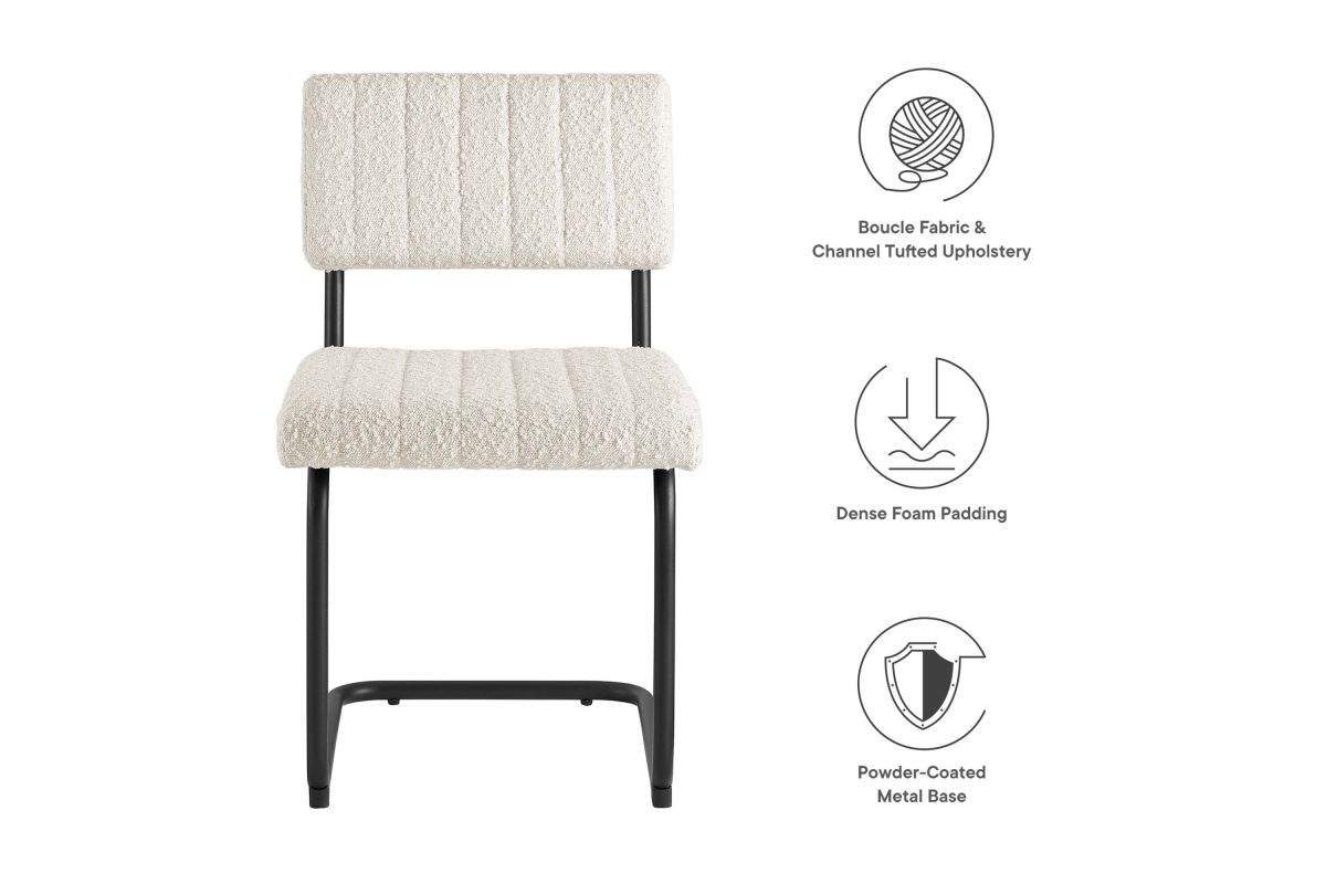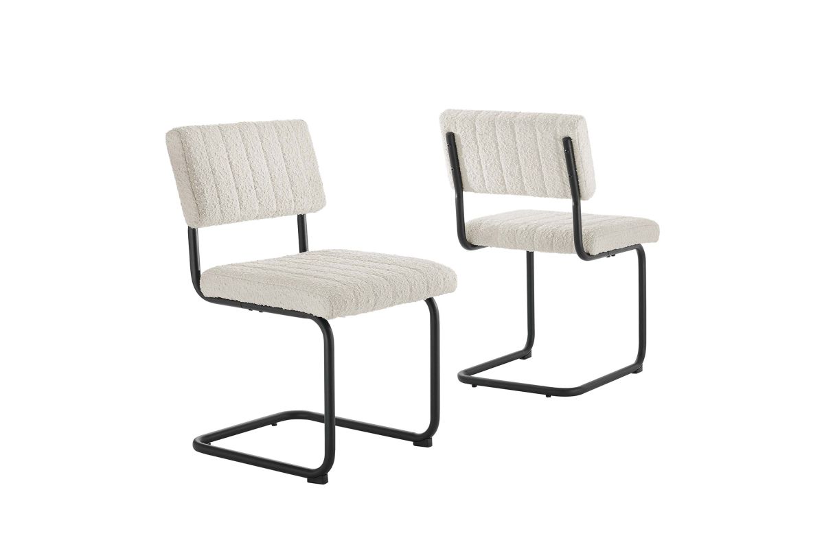 Bring mid-century style to your dining space with the Parity Dining Chairs - Set of 2. These side chairs feature perfectly textured boucle fabric upholstery that is channel tufted for a retro modern look. The powder-coated tubular metal frames provide a sleek silhouette and superior durability with a weight capacity of 330 lbs. Resting on a sled base, these dining chairs are equipped with non-marking foot pads to protect flooring and dense foam padding for added comfort and support. With both retro modern and vintage style, this set of two dining side chairs brings a unique flair to your dining room, kitchen space, or living area. Assembly is required.