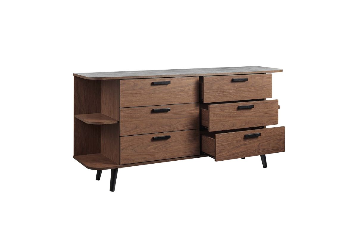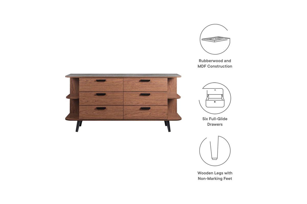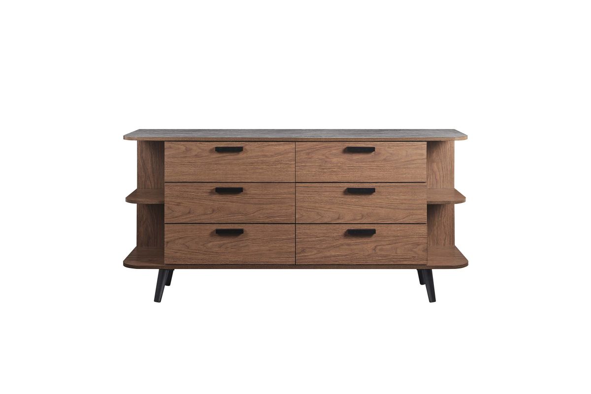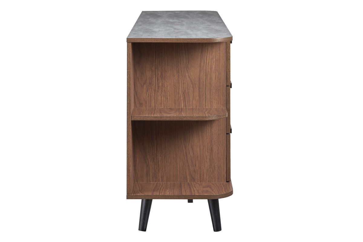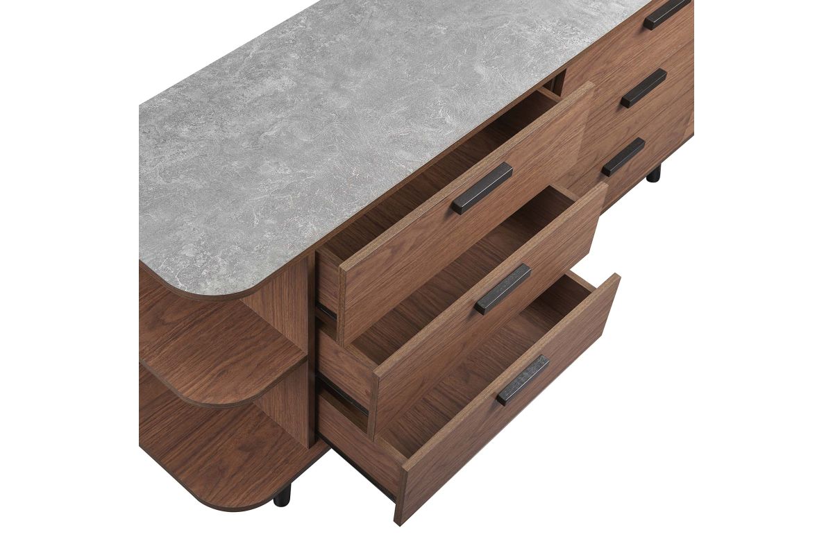 Abounding in versatility, the Langston Sideboard is the ultimate storage solution. This stylish, adaptable storage cabinet is perfect for any home and can be used in a variety of ways. Whether you need a place to store dinnerware, barware, linens, or household decor, this display cabinet has got you covered. Crafted with high-quality rubberwood, MDF, and particleboard, this sideboard boasts a stunning wood grain design that is beautifully complemented by stone-like top. The splayed dowel legs add a touch of mid-century design, making it a stylish addition to any room. With six full-glide drawers and open display areas on the sides, this sideboard offers ample storage space to keep your home organized. This credenza serves its purpose in the dining room, living room, hallway, or entryway. Includes non-marking foot pads. Assembly required. Please Note: When placing the TV directly on the unit, we recommend anchoring it in place.
