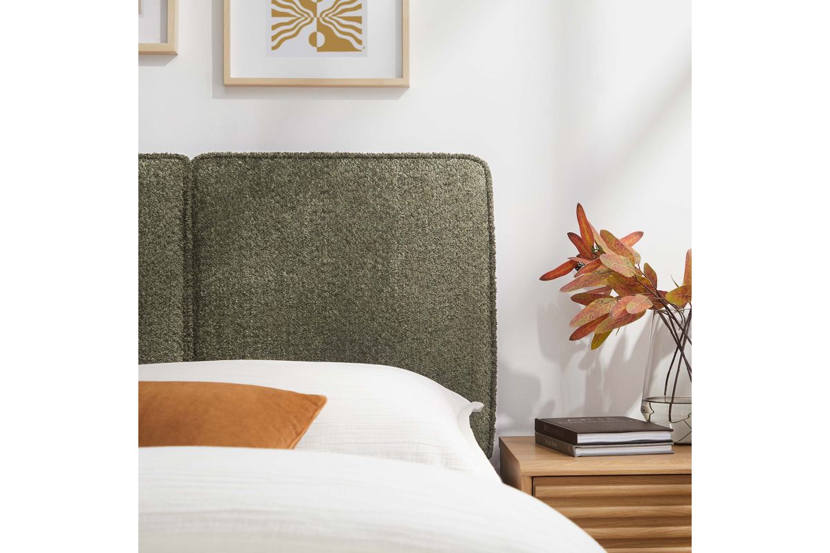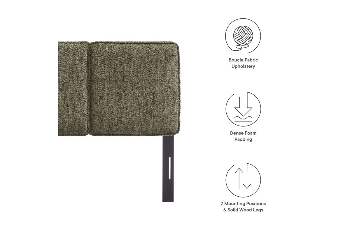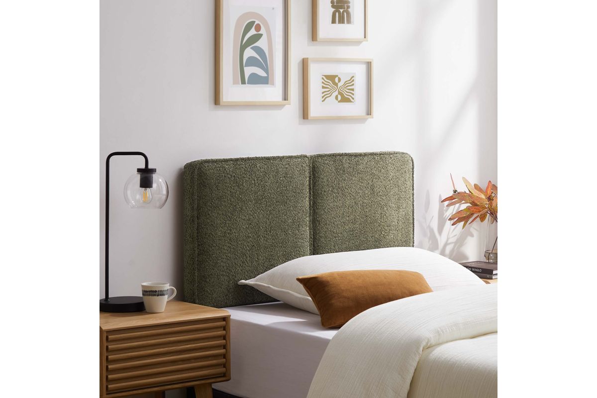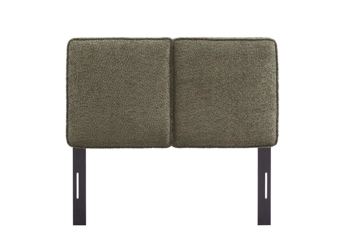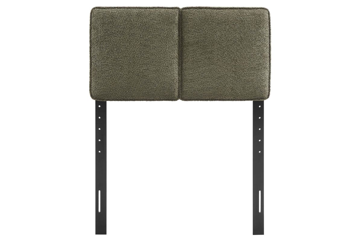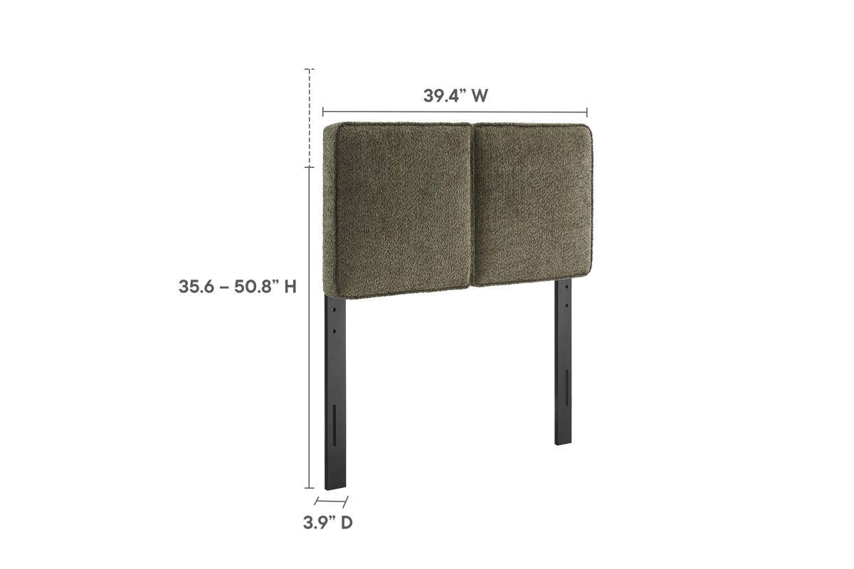 Embrace elegance and comfort in a children's bedroom, college dorm room, or small guest bedroom with the Lindee Twin Headboard, a statement piece that merges plush comfort with sophisticated design. This twin size fabric headboard is upholstered in textured boucle fabric that offers a tactile charm, and features French piping trim that outlines the dual panels. The dense foam padding and pillow-style design grants a soft, cushioned backdrop for nightly reading or relaxing in bed. Supported by solid wood legs and equipped with seven mounting positions, this twin upholstered headboard provides both durability and versatility to fit various bed frames. The Lindee twin size headboard is a transformative bedroom upgrade that combines form and function with an upholstered boucle headboard appeal, making it a quintessential element for any restful sanctuary. Assembly required.