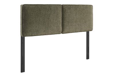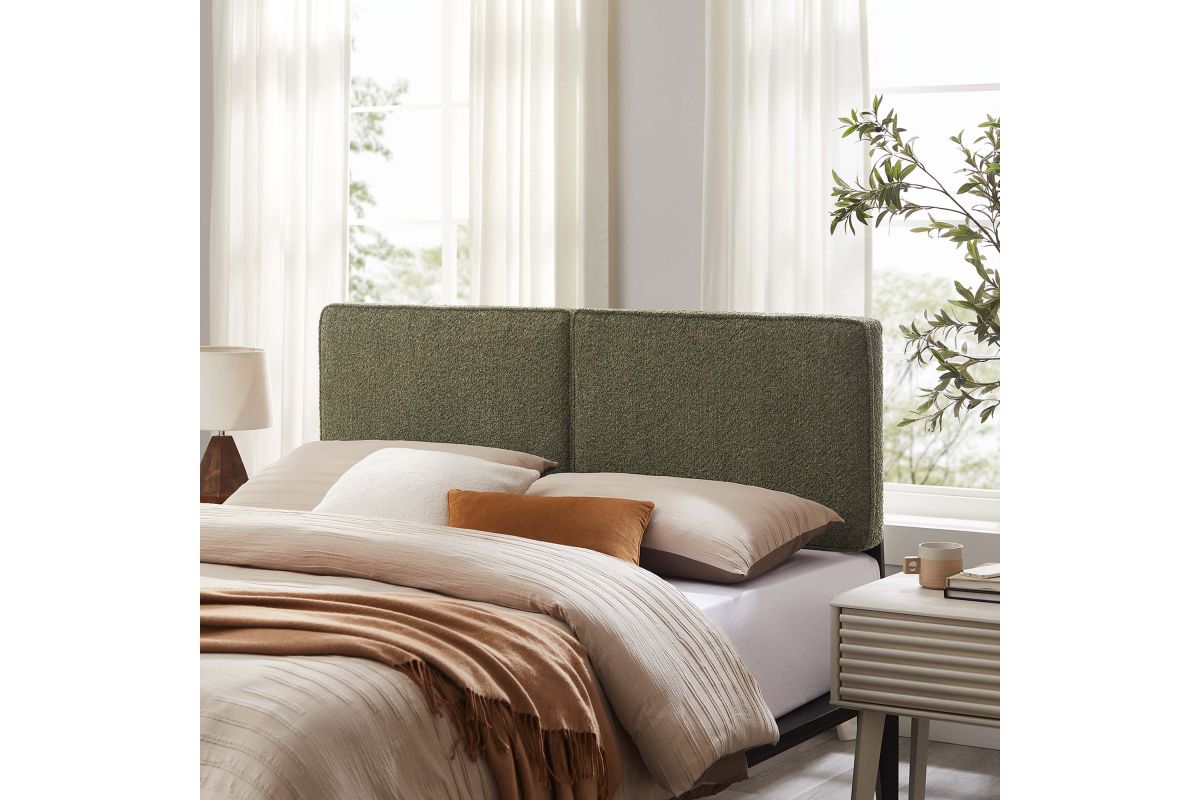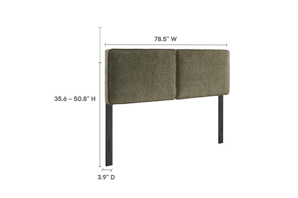 Embrace elegance and comfort in a primary bedroom or guest bedroom with the Lindee King Headboard, a statement piece that merges plush comfort with sophisticated design. This king size fabric headboard is upholstered in textured boucle fabric that offers a tactile charm, and features French piping trim that outlines the dual panels. The dense foam padding and pillow-style design grants a soft, cushioned backdrop for nightly reading or relaxing in bed. Supported by solid wood legs and equipped with seven mounting positions, this king upholstered headboard provides both durability and versatility to fit various bed frames. The Lindee king size headboard is a transformative bedroom upgrade that combines form and function with an upholstered boucle headboard appeal, making it a quintessential element for any restful sanctuary. Assembly required.