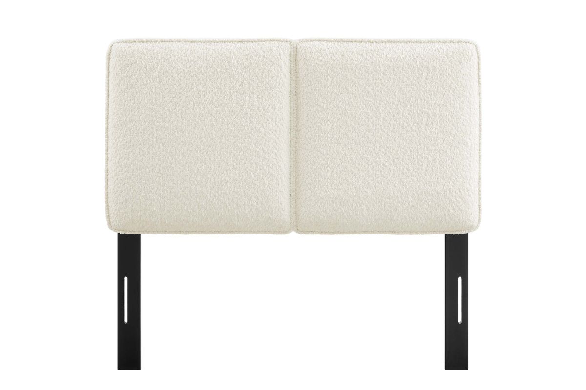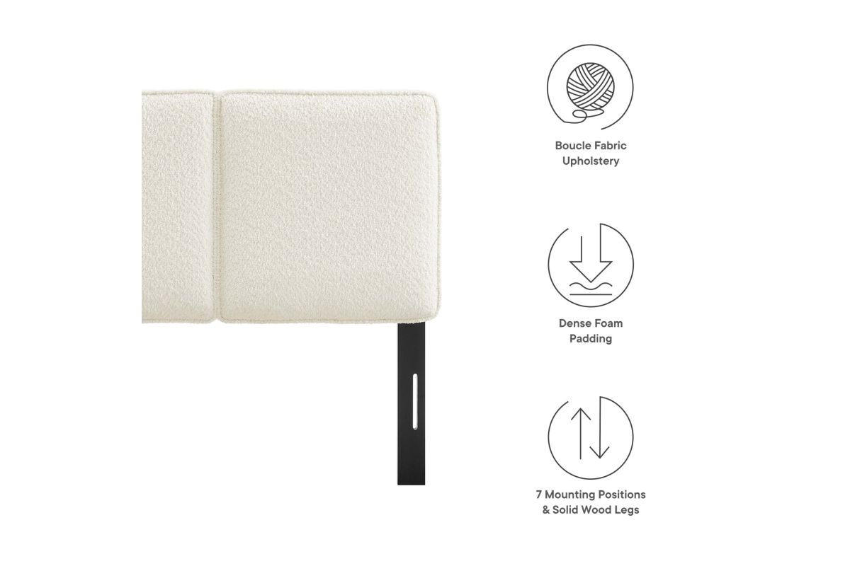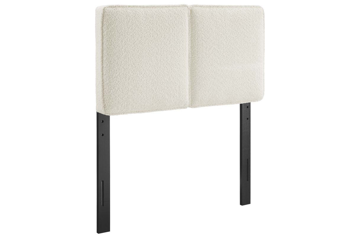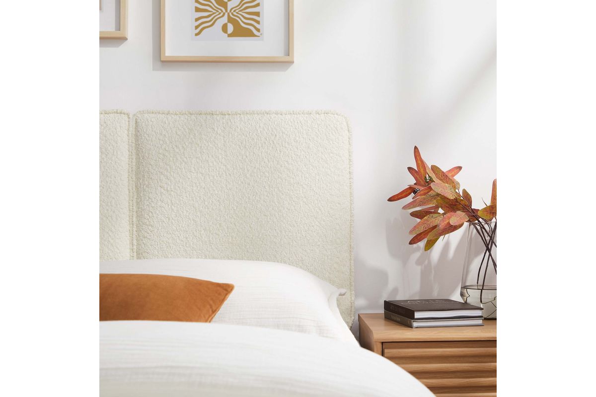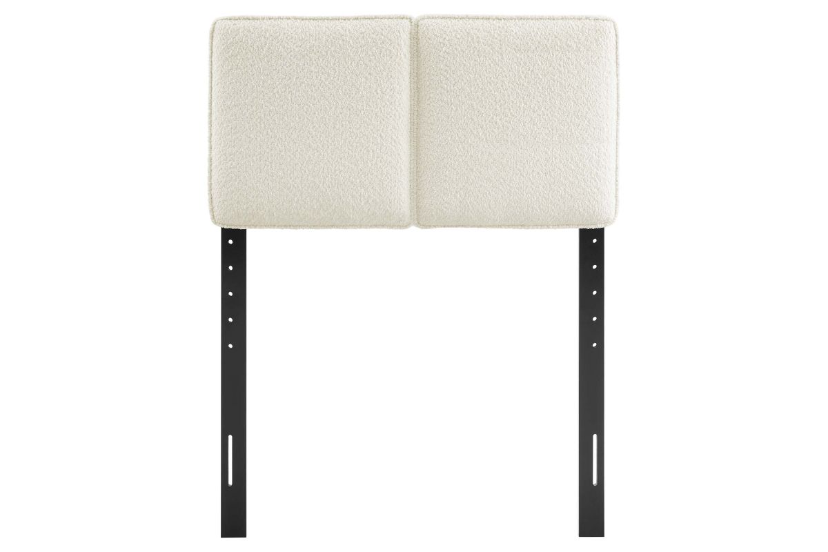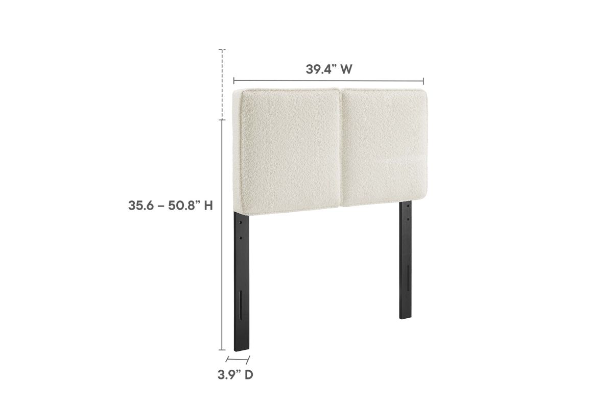 Embrace elegance and comfort in a children's bedroom, college dorm room, or small guest bedroom with the Lindee Twin Headboard, a statement piece that merges plush comfort with sophisticated design. This twin size fabric headboard is upholstered in textured boucle fabric that offers a tactile charm, and features French piping trim that outlines the dual panels. The dense foam padding and pillow-style design grants a soft, cushioned backdrop for nightly reading or relaxing in bed. Supported by solid wood legs and equipped with seven mounting positions, this twin upholstered headboard provides both durability and versatility to fit various bed frames. The Lindee twin size headboard is a transformative bedroom upgrade that combines form and function with an upholstered boucle headboard appeal, making it a quintessential element for any restful sanctuary. Assembly required.