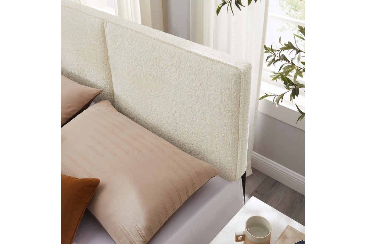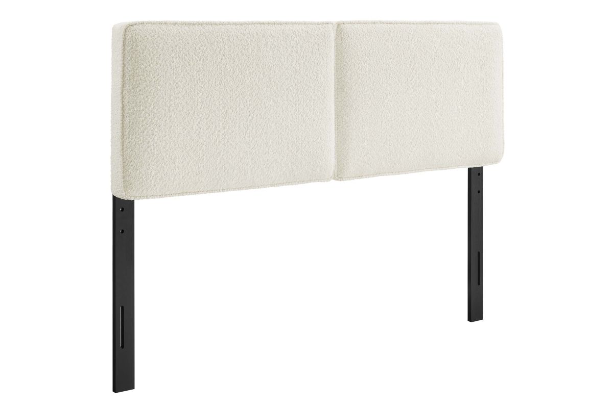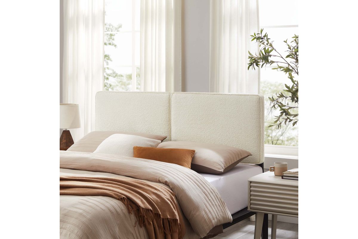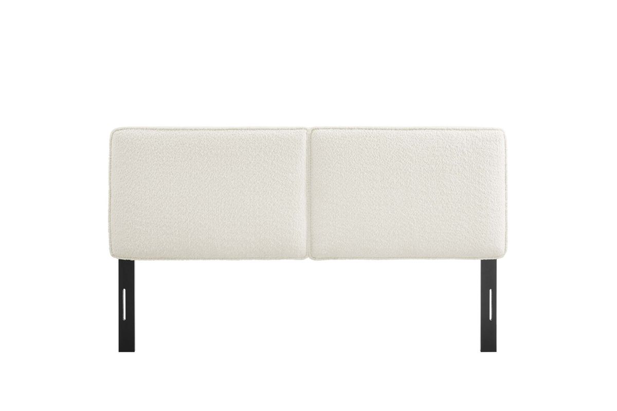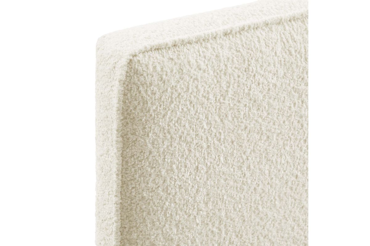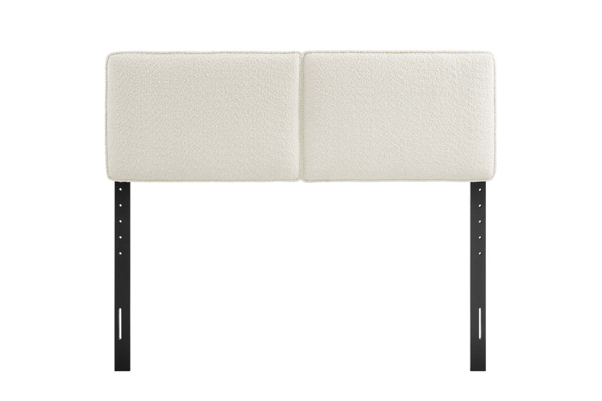 Embrace elegance and comfort in a guest bedroom, teenager's bedroom, or college dorm room with the Lindee Full Headboard, a statement piece that merges plush comfort with sophisticated design. This full size fabric headboard is upholstered in textured boucle fabric that offers a tactile charm, and features French piping trim that outlines the dual panels. The dense foam padding and pillow-style design grants a soft, cushioned backdrop for nightly reading or relaxing in bed. Supported by solid wood legs and equipped with seven mounting positions, this full upholstered headboard provides both durability and versatility to fit various bed frames. The Lindee full size headboard is a transformative bedroom upgrade that combines form and function with an upholstered boucle headboard appeal, making it a quintessential element for any restful sanctuary. Assembly required.