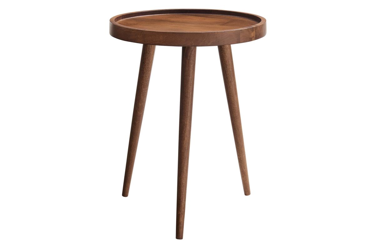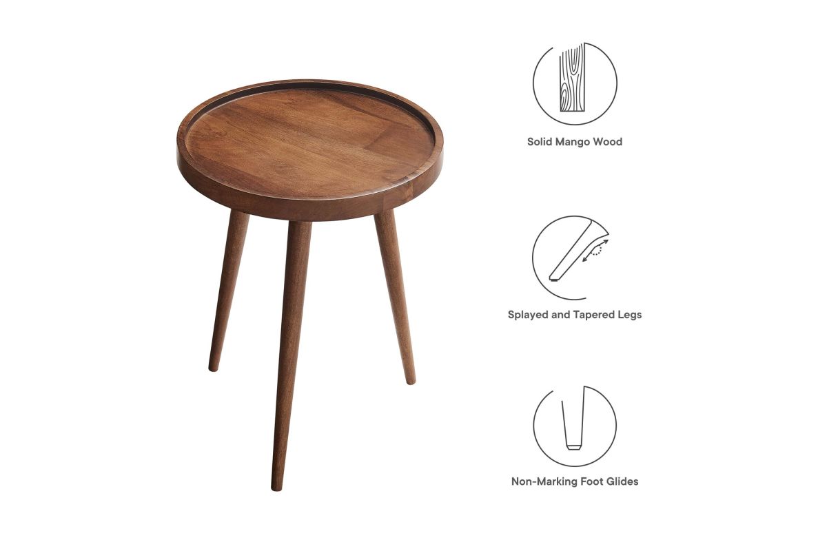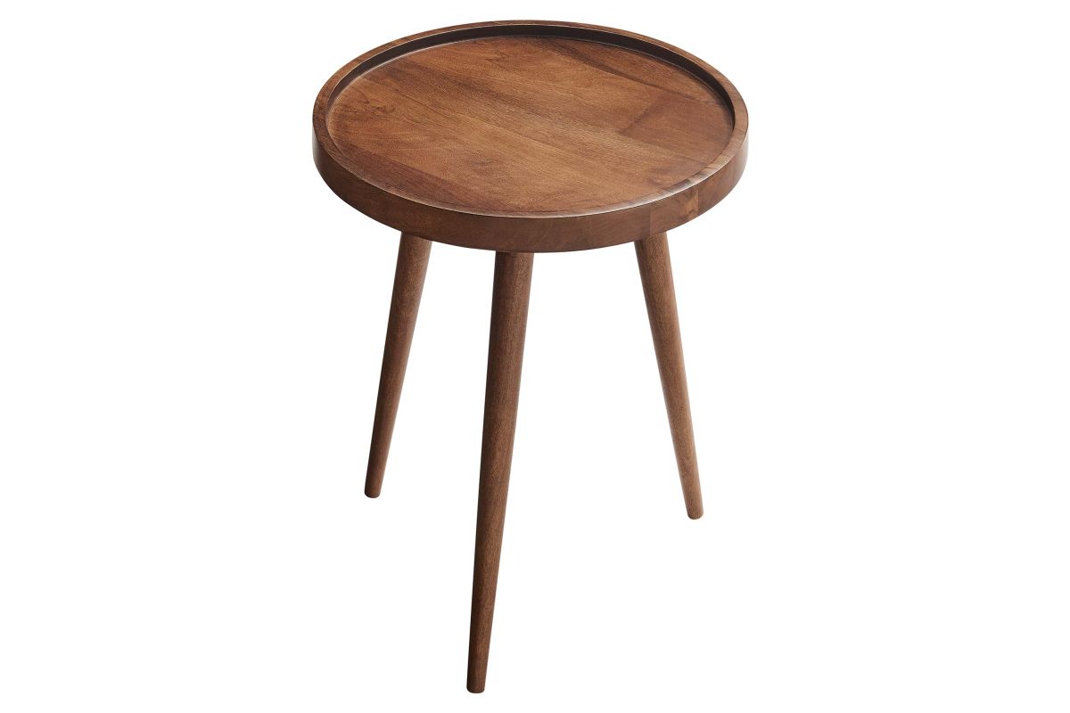 Elevate your living space with Chiro Side Table, a modern blend of functionality and style. This round accent table features a unique tray top design, complete with a lip to keep items secure. Crafted from solid mango wood, its durability is matched by tapered and splayed legs that add a touch of mid-century modern elegance. Perfect as a living room side table, indoor plant stand, or small bedside table, Chiro offers versatility and charm. With non-marking floor glides, it's designed to protect your flooring, making it an ideal choice for any room in your home. Straightforward assembly required. Weight Capacity: 88 lbs.