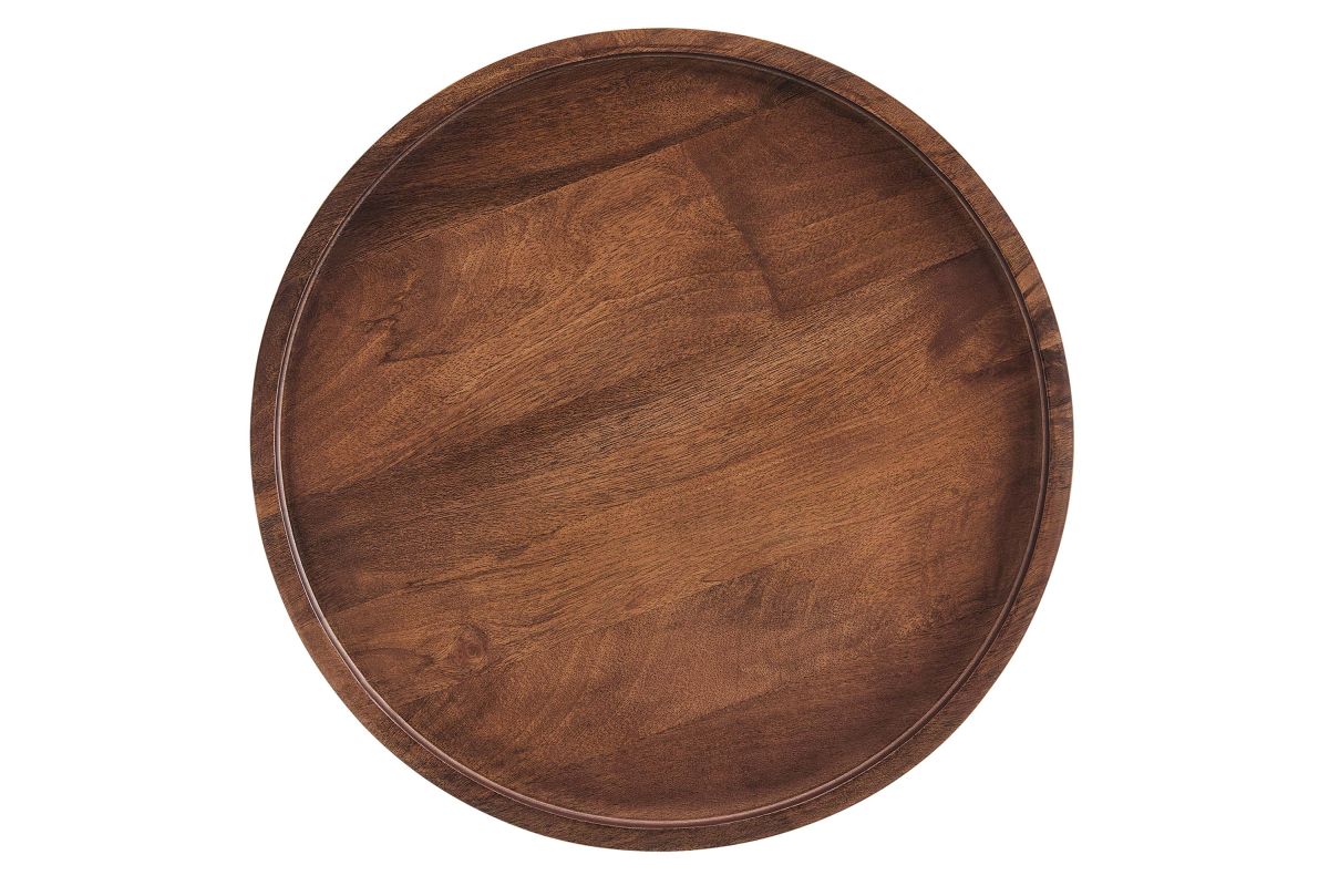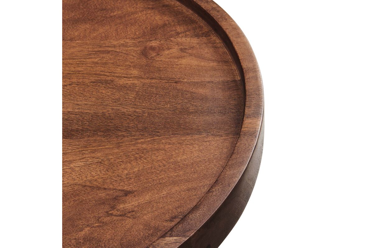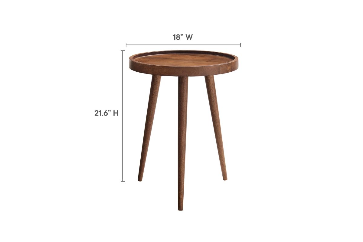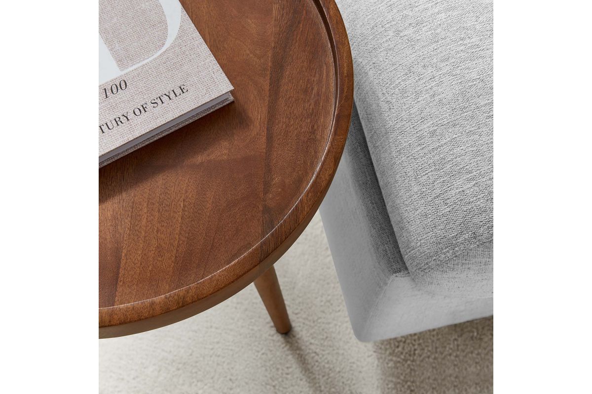 Elevate your living space with Chiro Side Table, a modern blend of functionality and style. This round accent table features a unique tray top design, complete with a lip to keep items secure. Crafted from solid mango wood, its durability is matched by tapered and splayed legs that add a touch of mid-century modern elegance. Perfect as a living room side table, indoor plant stand, or small bedside table, Chiro offers versatility and charm. With non-marking floor glides, it's designed to protect your flooring, making it an ideal choice for any room in your home. Straightforward assembly required. Weight Capacity: 88 lbs.